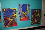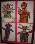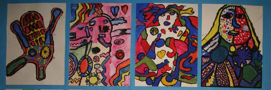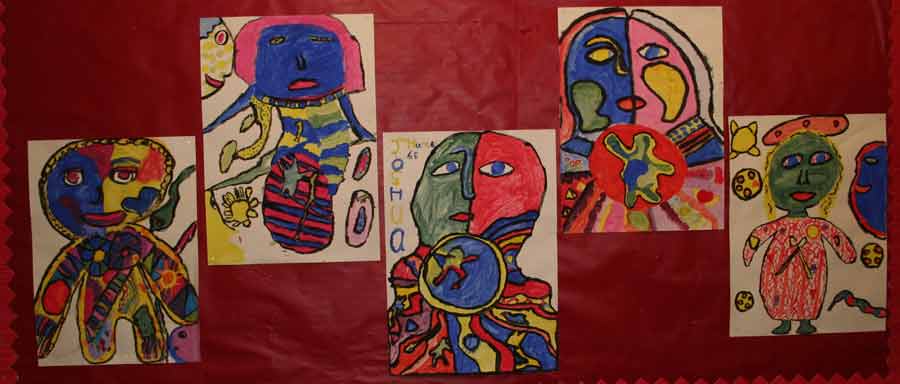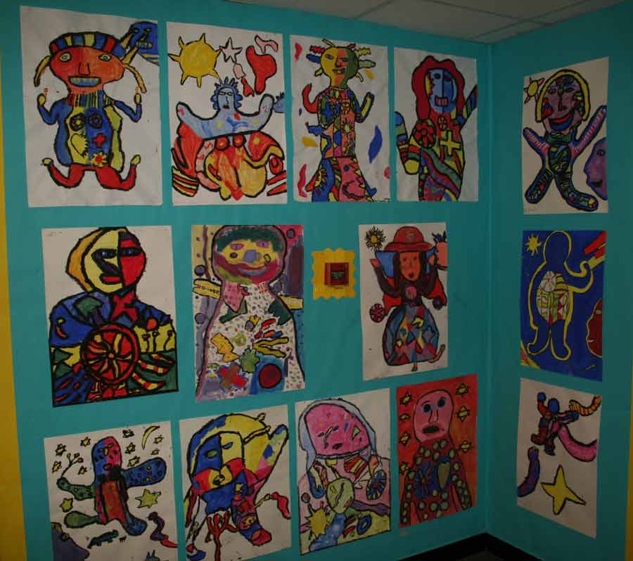 The year six paintings based on or inspired by or using similar means to Niki De Saint Phalle have been finished and have been put up around the school. Everyone seemed to like the colours but there hasn’t been a great deal of feedback as yet. They are OK. Their schema comes through the influence quite nicely or is enhanced by the influence. There is a reasonable amount of ‘play’ in the idea, a reasonable amount of invention and variation within the idea. The black lines can be a bit heavy with some but that would be expected really. The pictures are about A2 and done with Specialist Crafts poster paint.