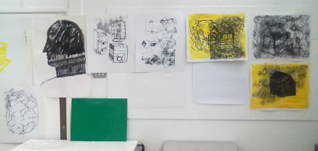 Second day on the big wall drawing. What did I do? I put up some more card and took some of the drawing down from yesterday. I painted two pieces of paper with yellow acrylic. I painted a canvas out with yellow acrylic. I painted a big book on the card with yellow acrylic. I added some bits here and there with yellow acrylic. I rolled out some water based ink on a piece of perspex and I made five mono-prints fairly rapidly. I made two of these onto the primed yellow papers.