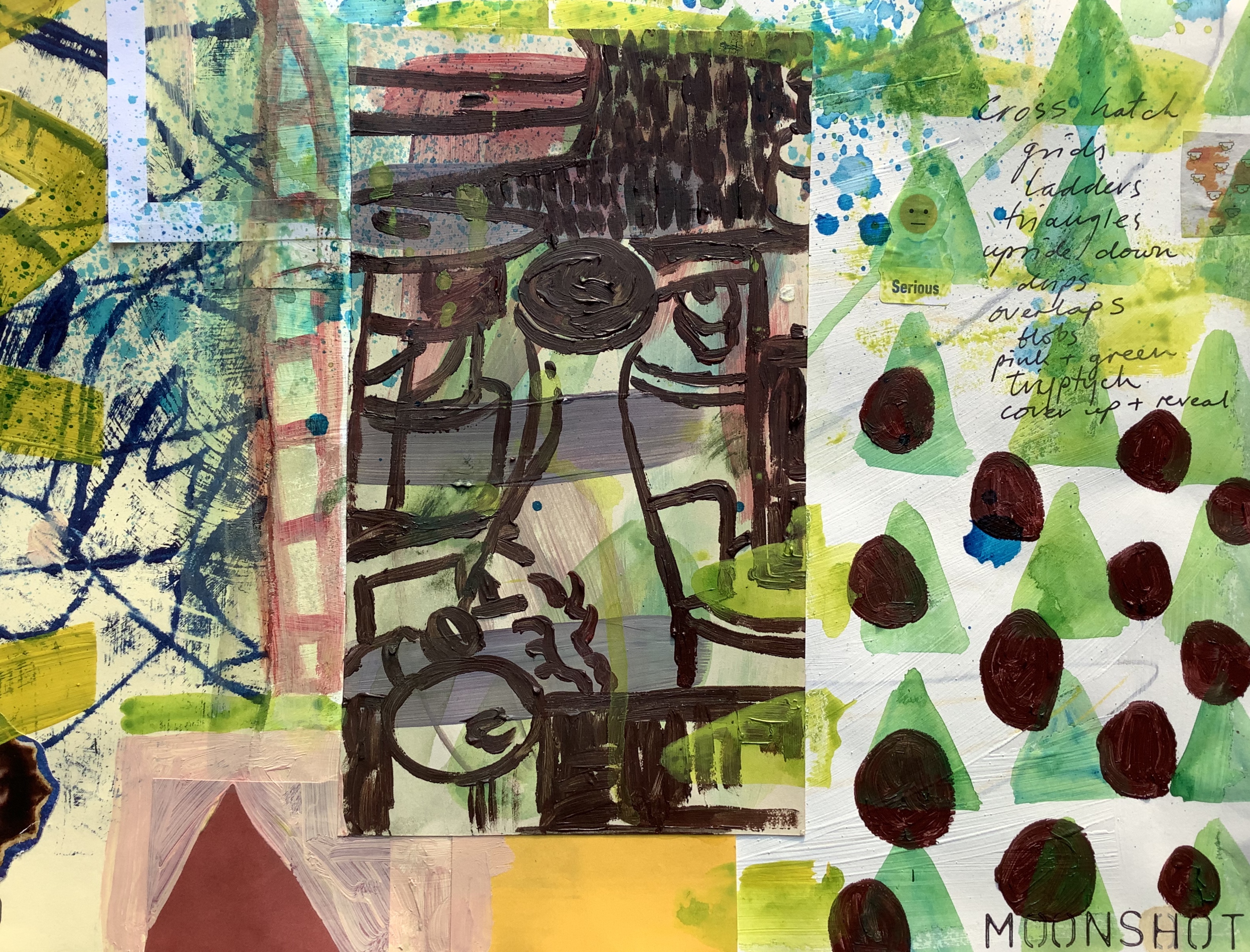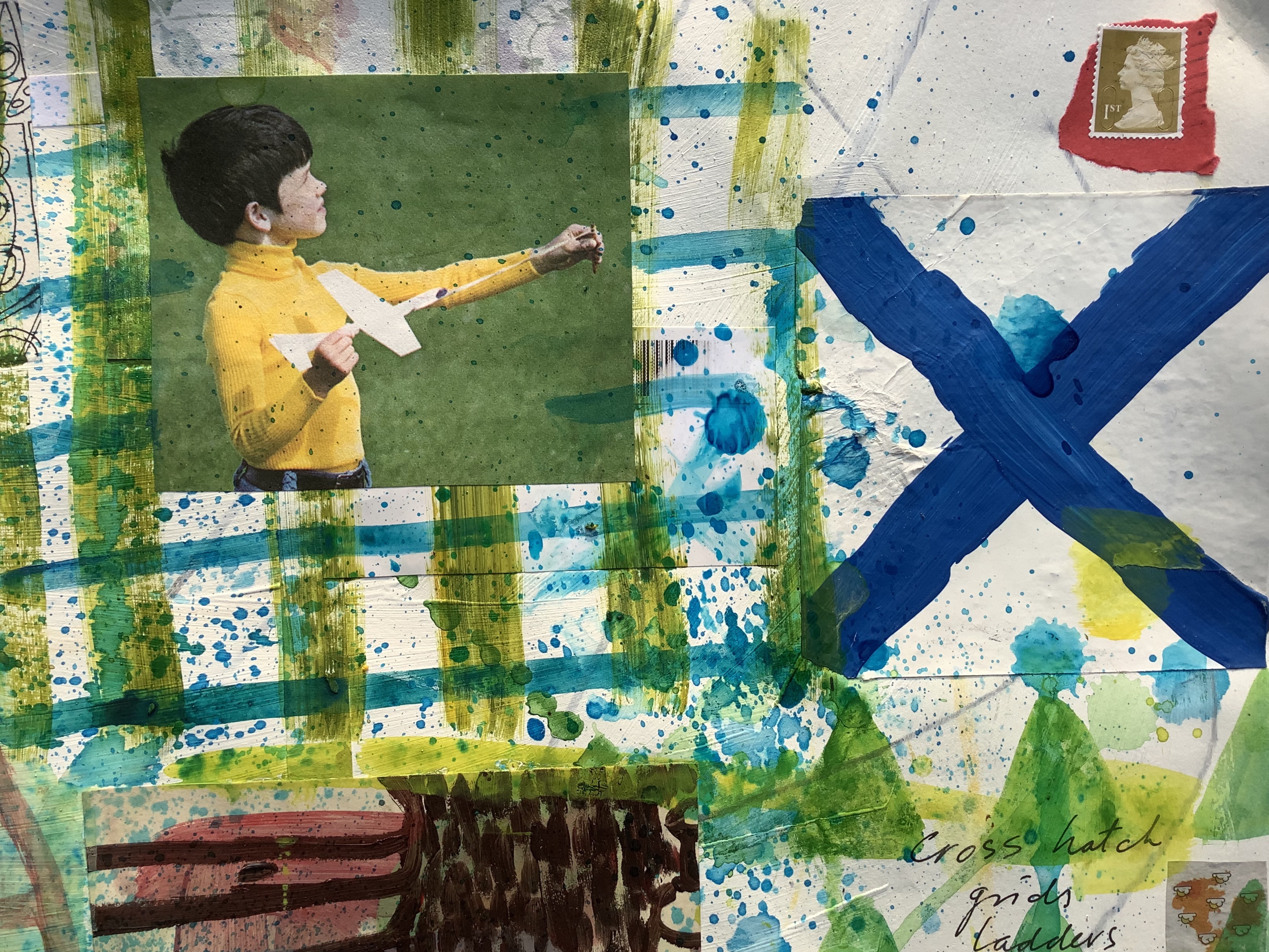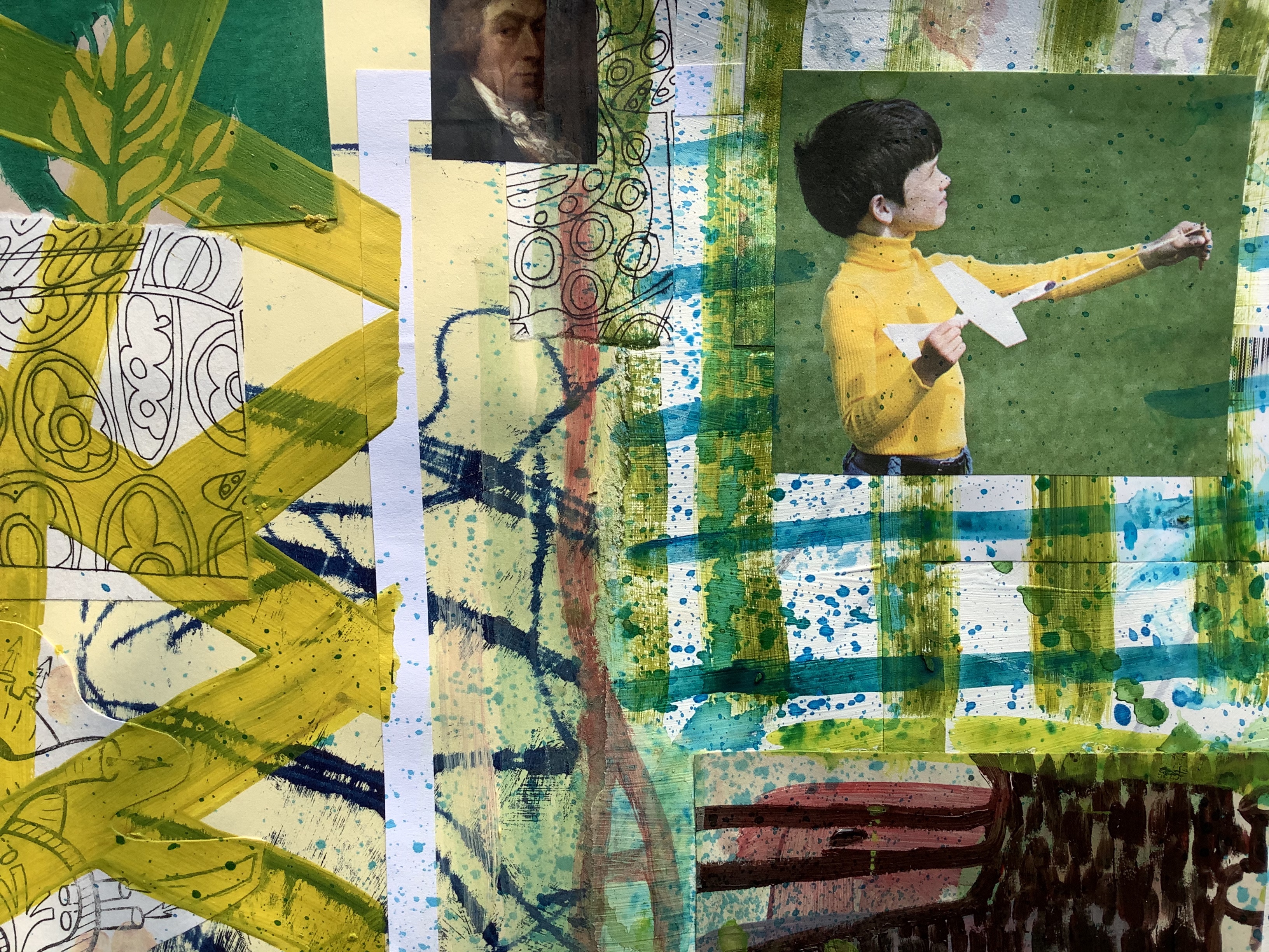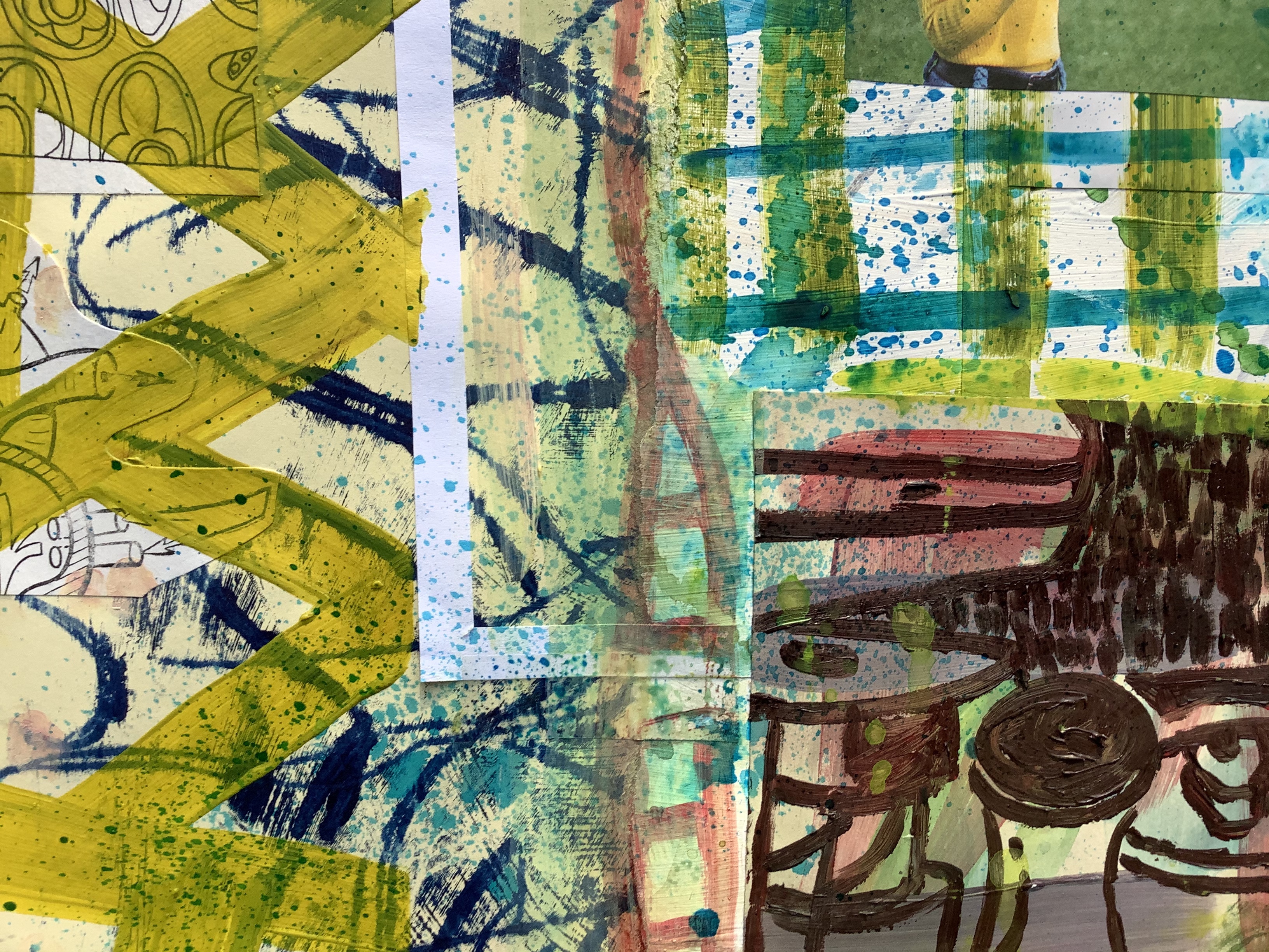 Recycled drawings, prints, collage and mixed media on paper patchwork.
