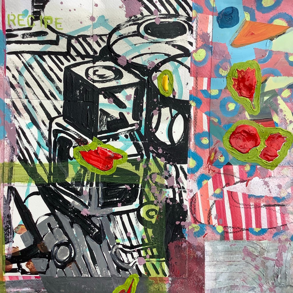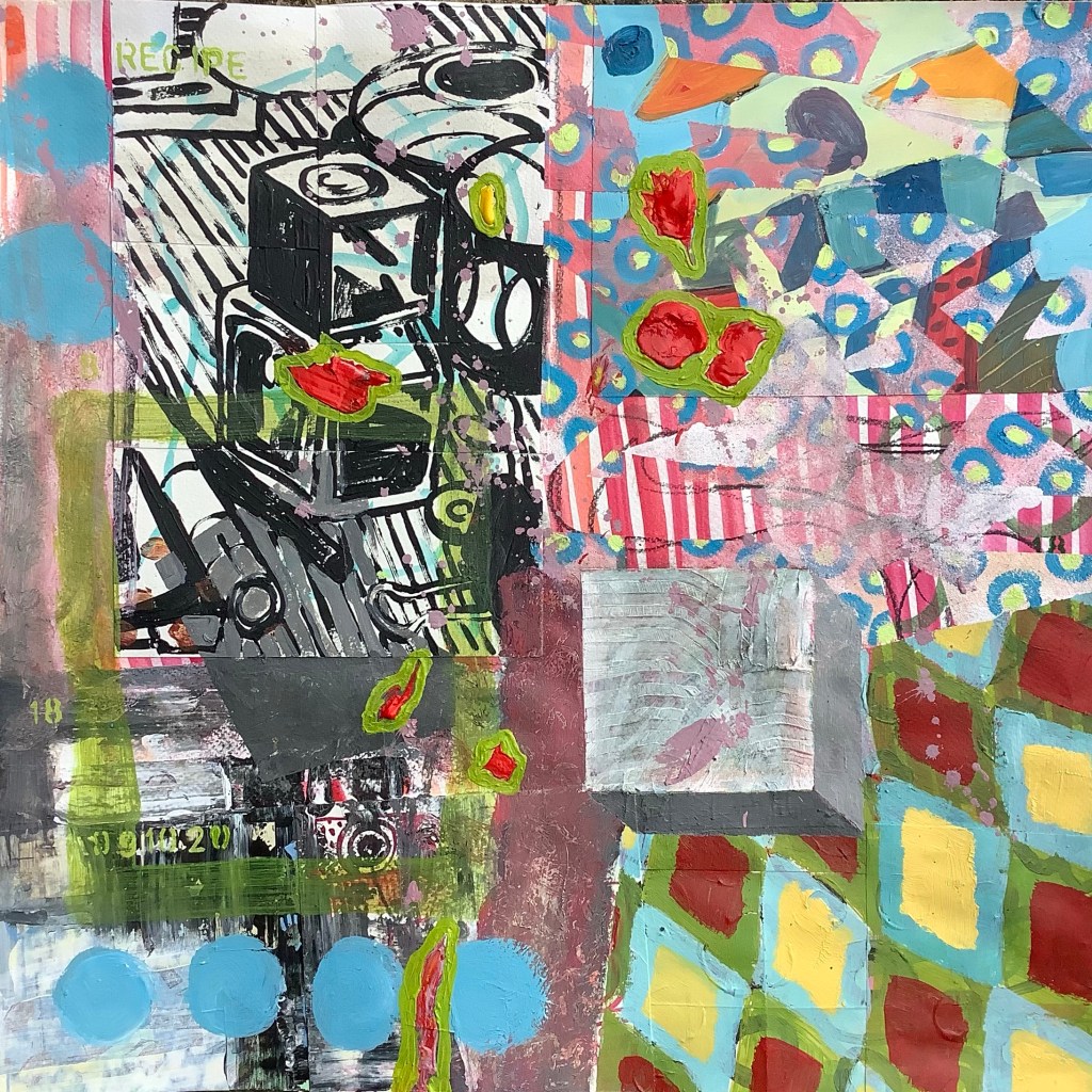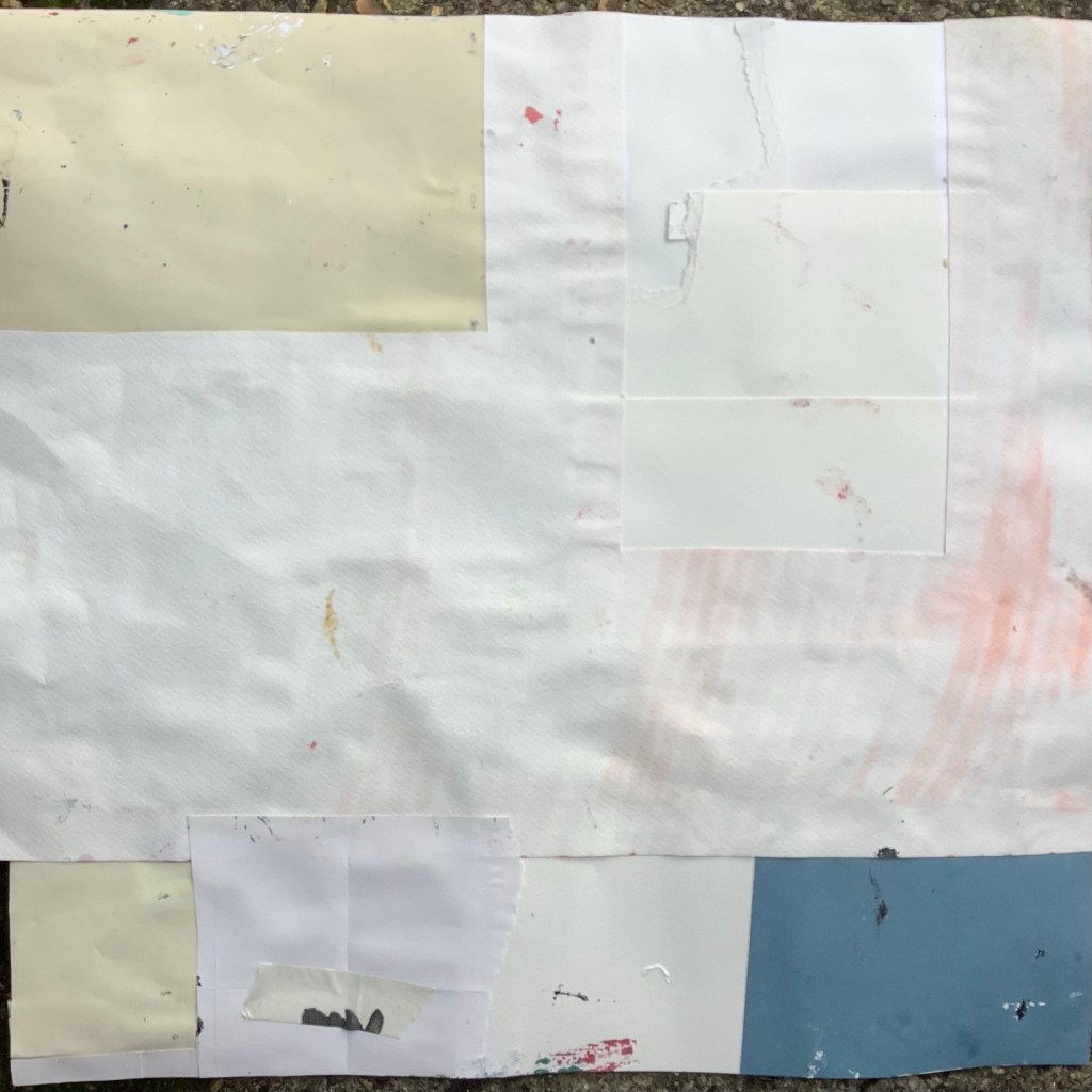 Playing with the of instructions ‘recipe’ from art pedagogy yesterday. Similar elements in different formations. The instructions from the art lesson are similar to the procedures I use anyway in the making of the work. The borrowed set of procedures, laid over the procedures I had going on already, collaged paper patchwork, colour study, old work, new figurative study etc, produce a different result. Until the next ideas come along and shift the sequence in a different direction.