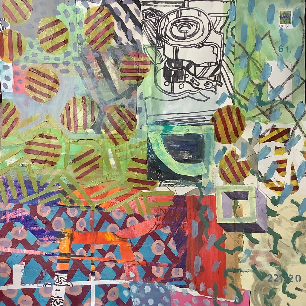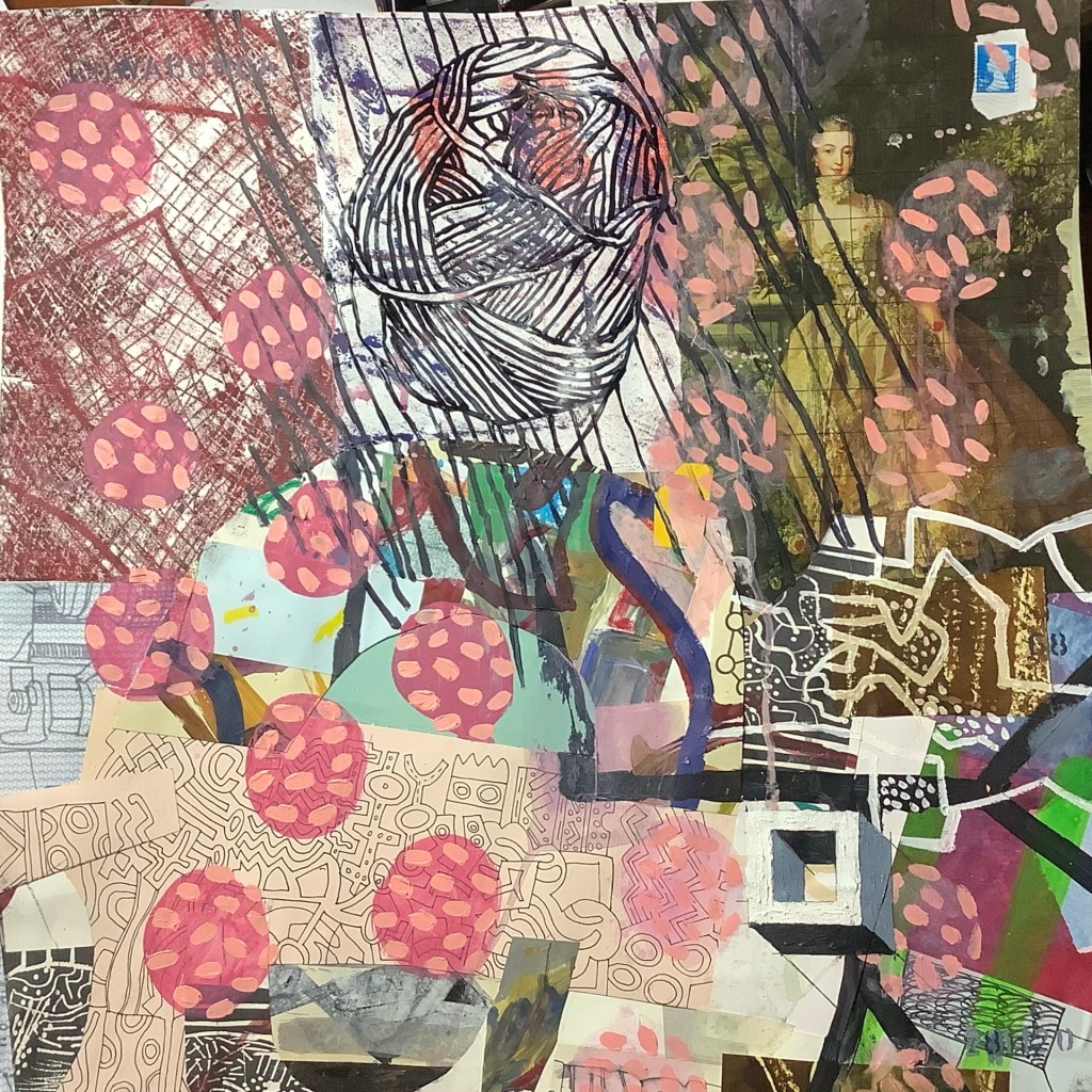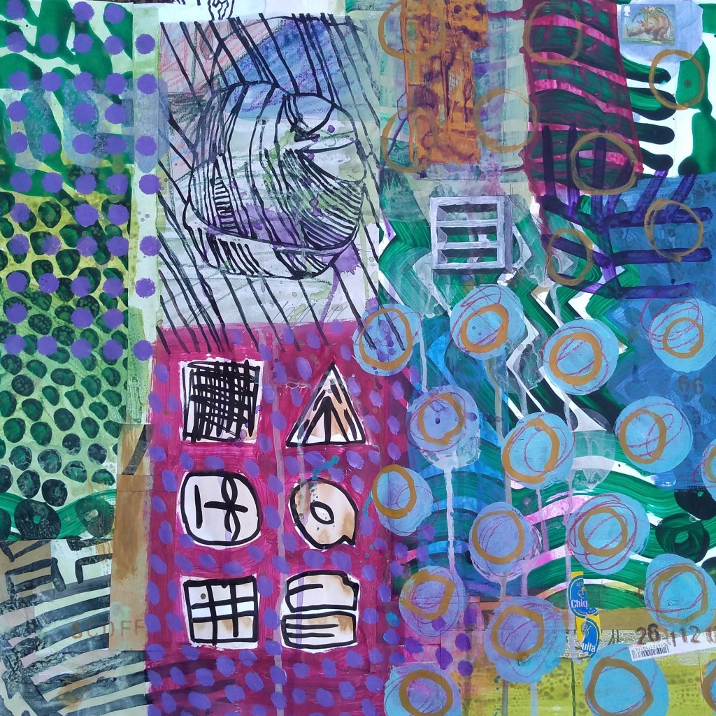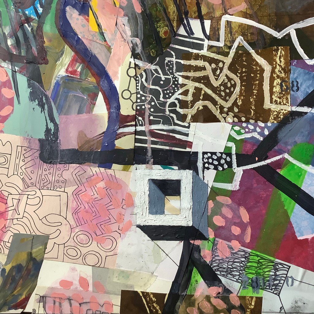 Mixed media on collaged paper patchwork. 47cm x 47cm.