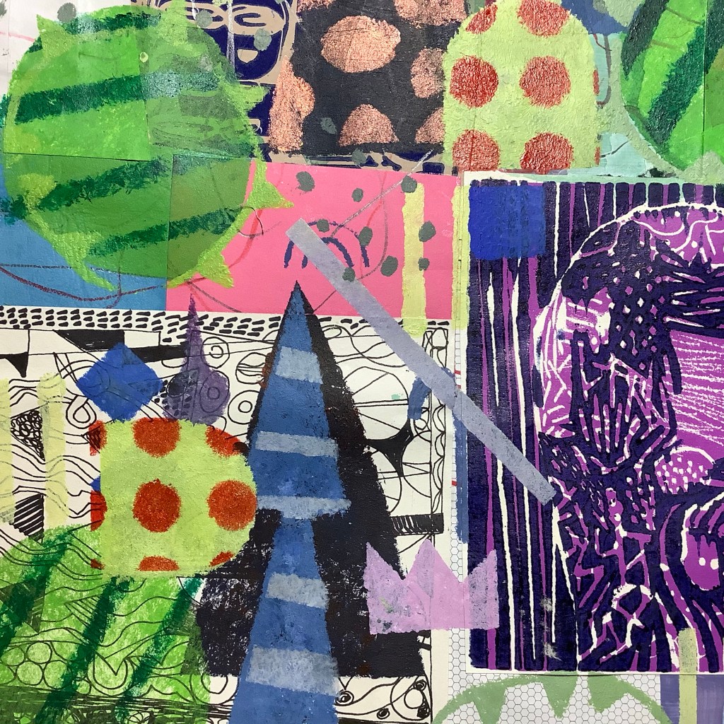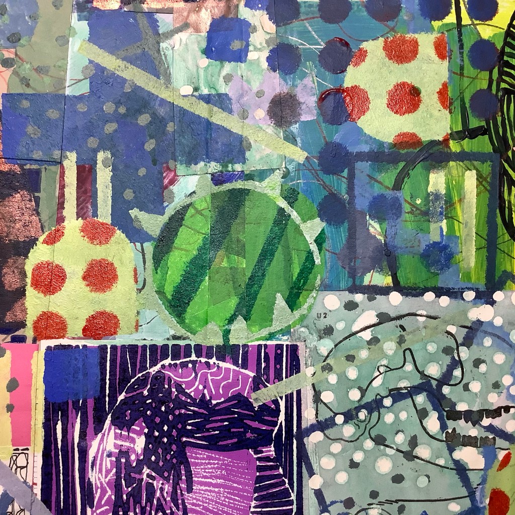Mixed media with relief prints on collaged paper patchwork 46cm x 46cm