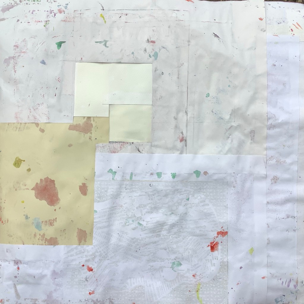 Mixed media on collaged paper patchwork with wood cut. 46cm x 46cm. #abstractadvent