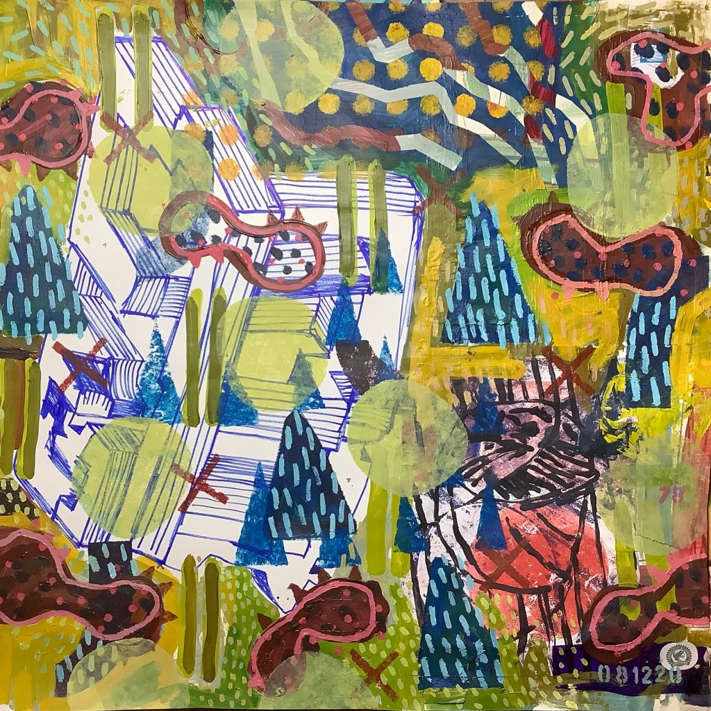 Mixed media on collaged paper patchwork 46cm x 46cm