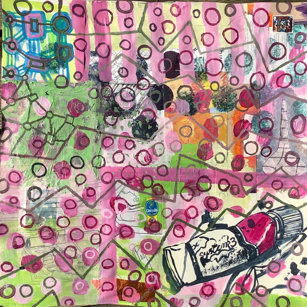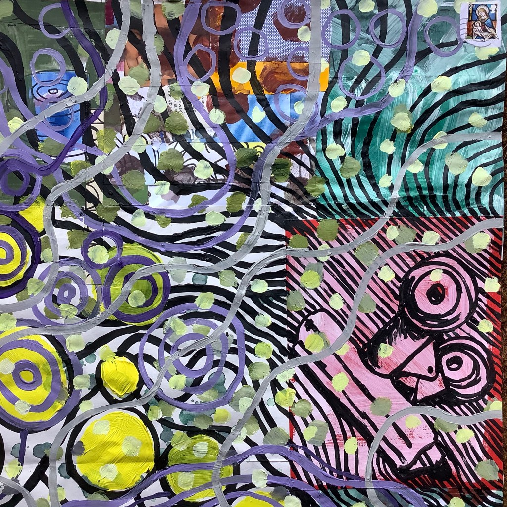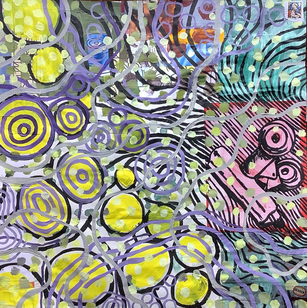 Acrylic on mixed collage paper patchwork 48cm x 48cm. A bit of psychedelia in response to @hampstead_school_of_art #getcreativehsoa