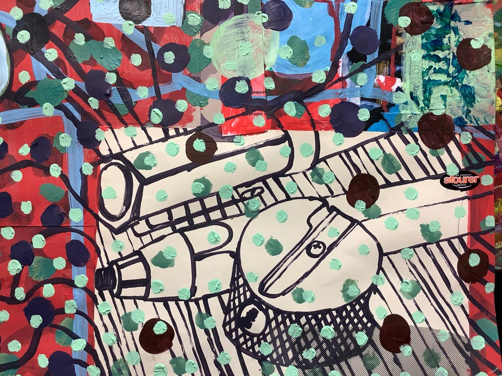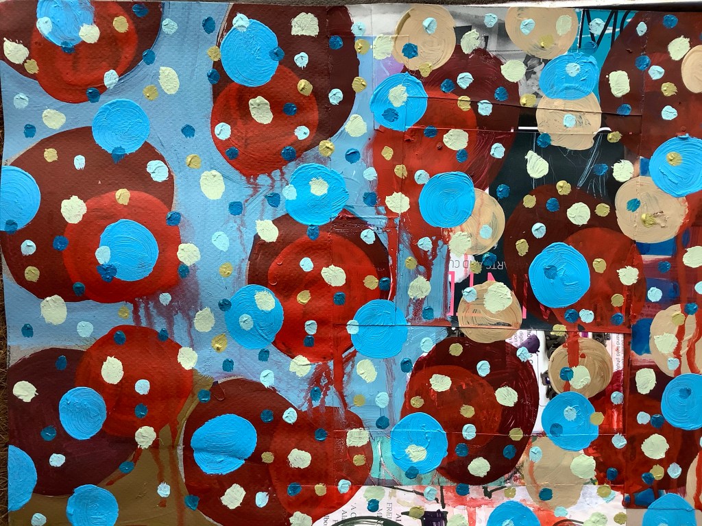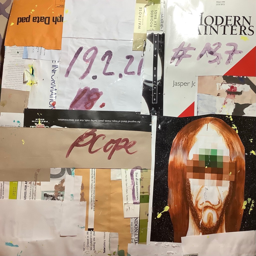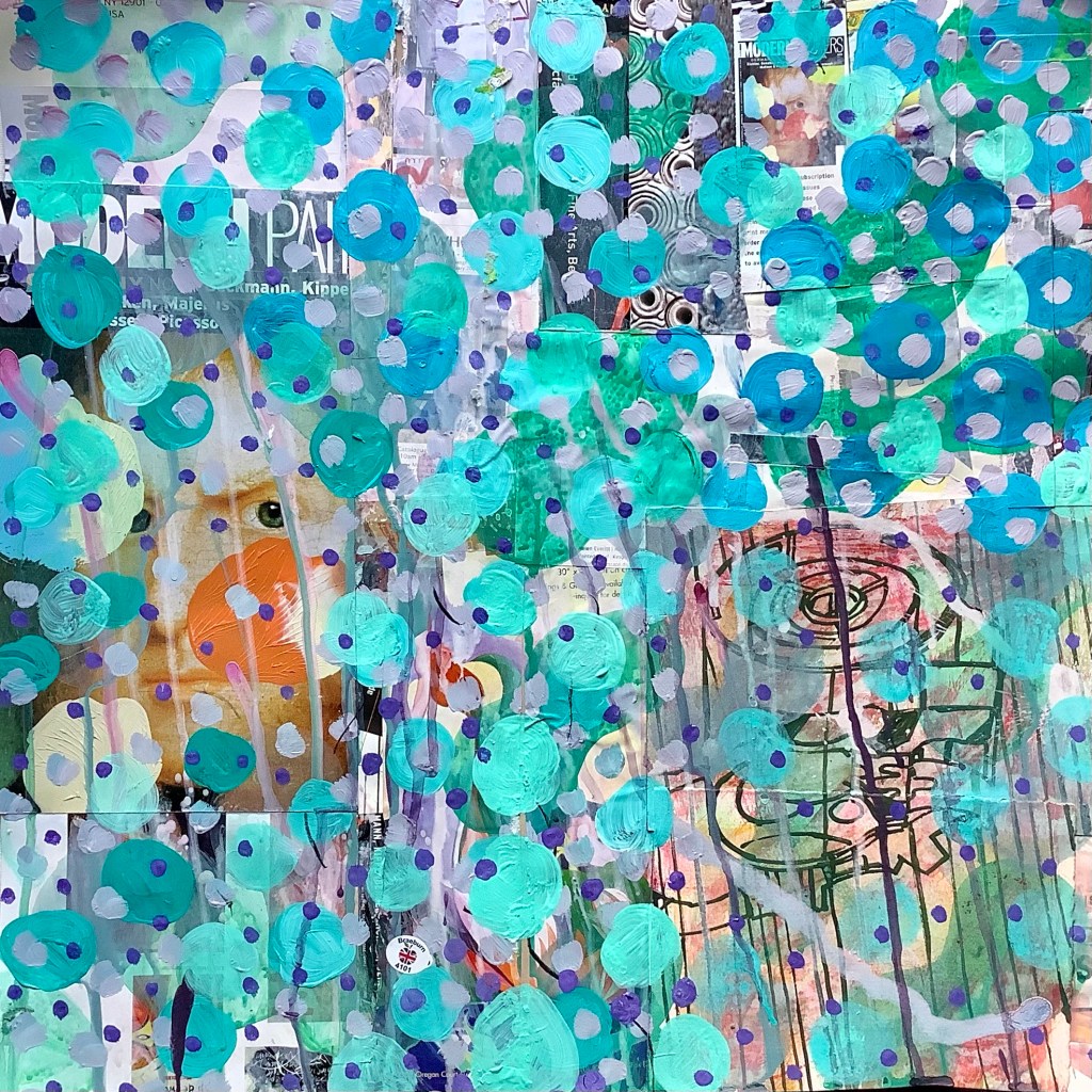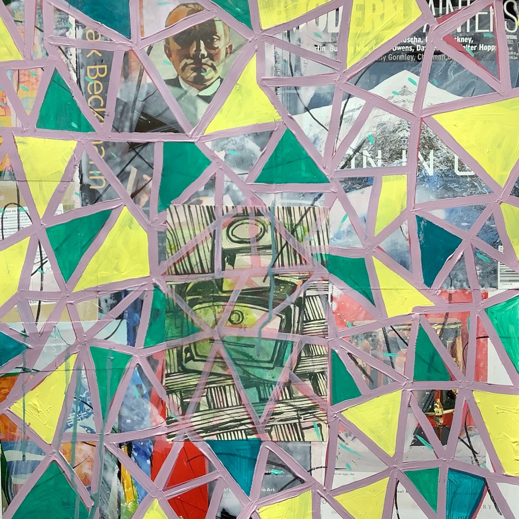 Acrylic paint on collaged paper patchwork with art magazines 48cm x 48cm