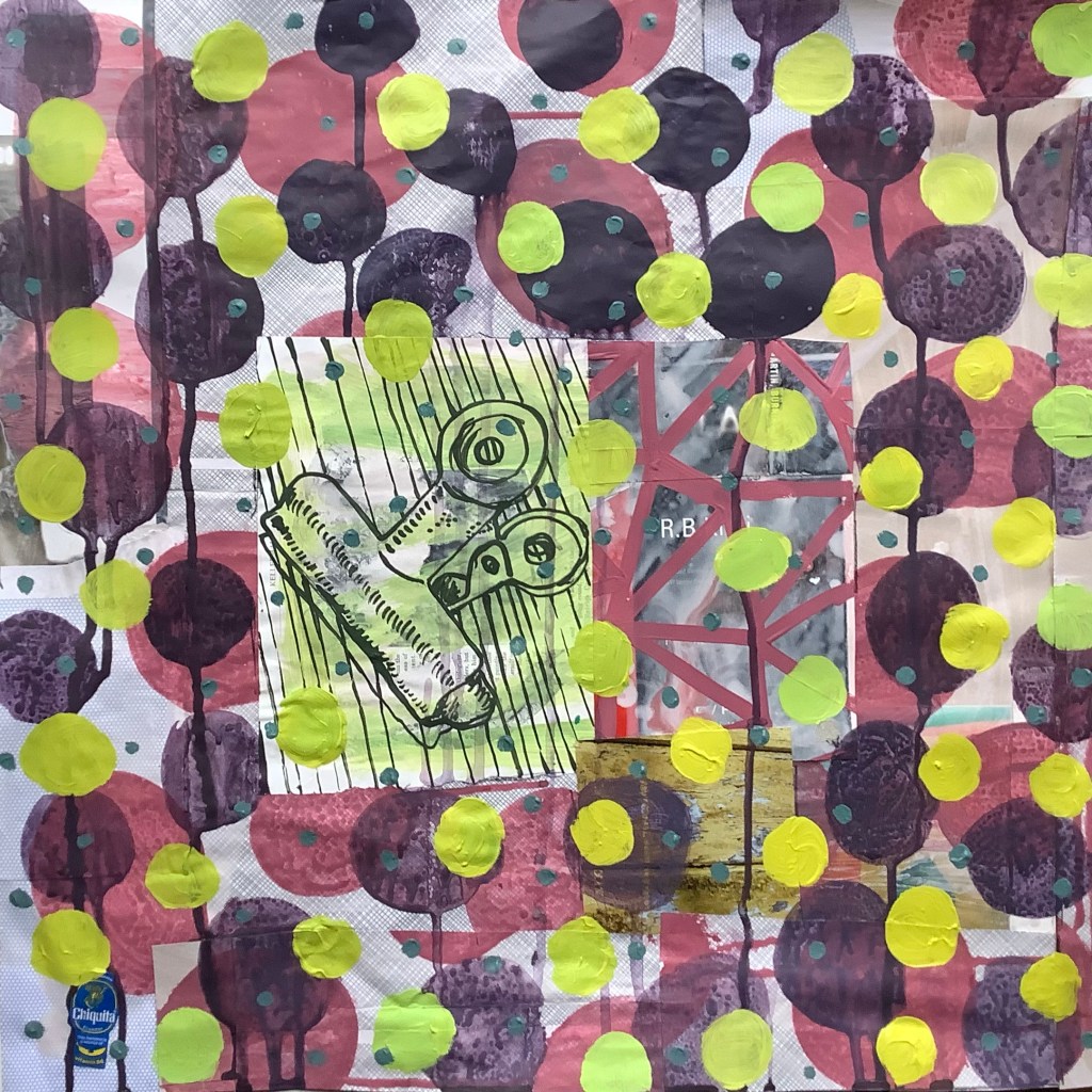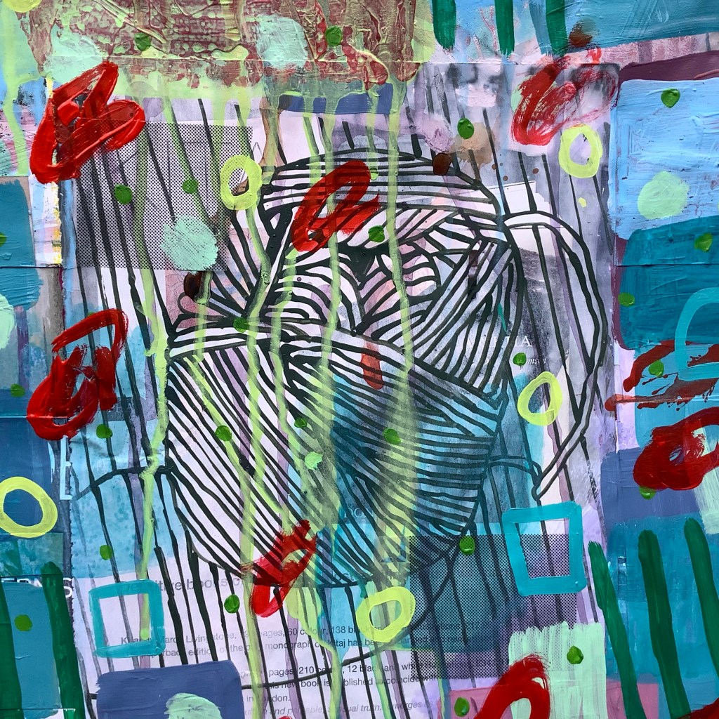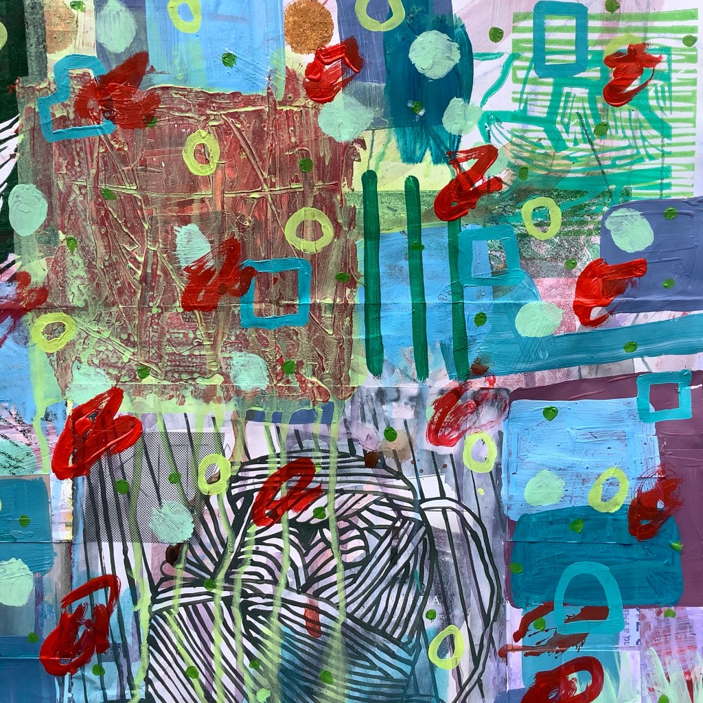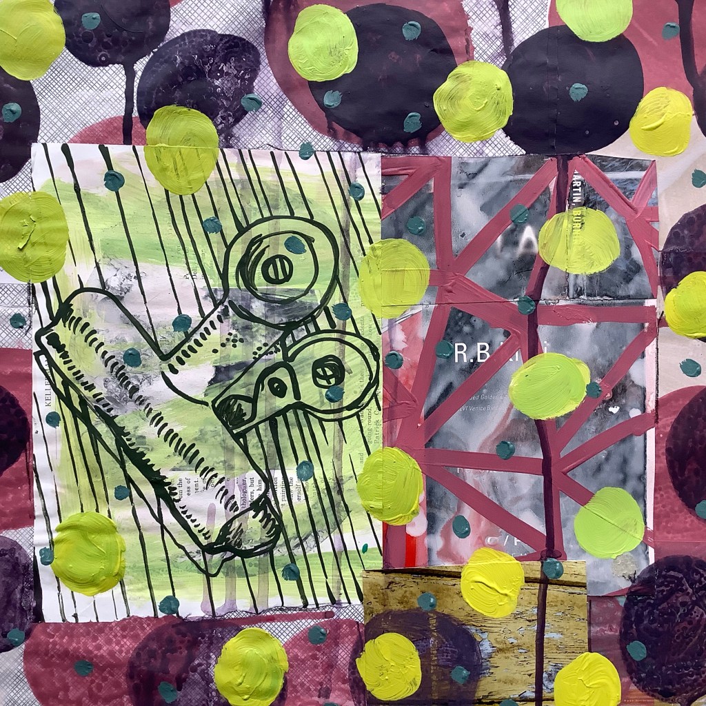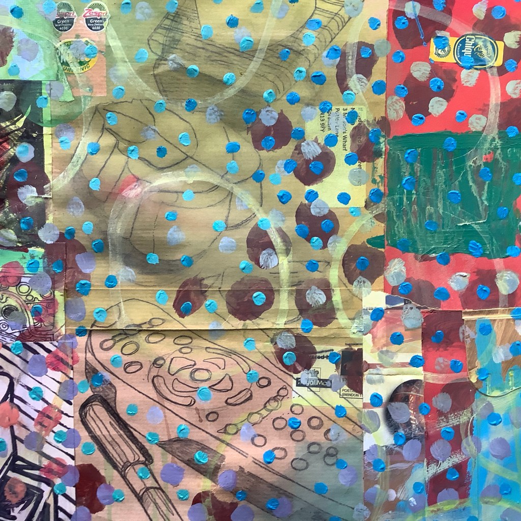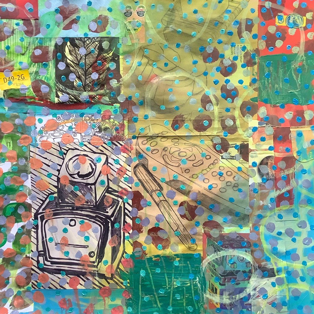 Acrylic paint on collaged paper patchwork with prints and old drawings 48cm x 48cm