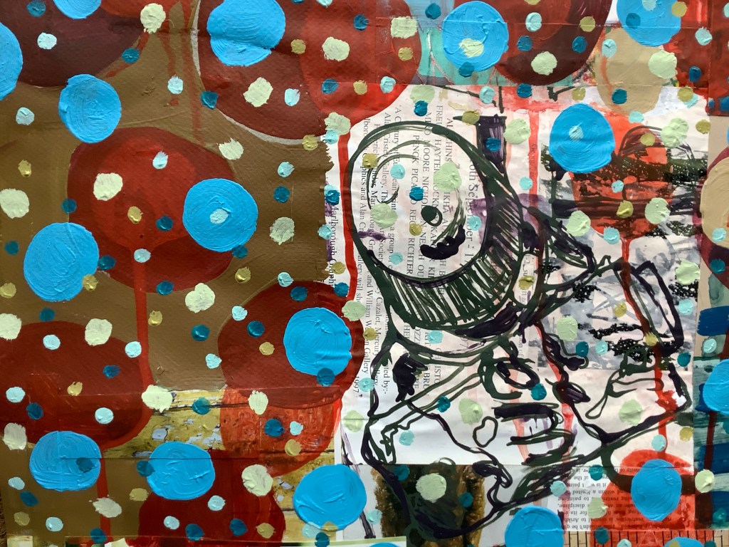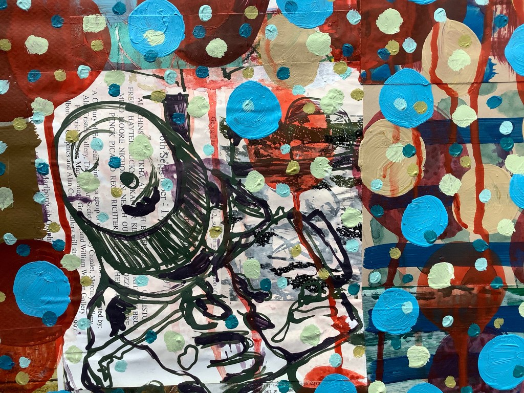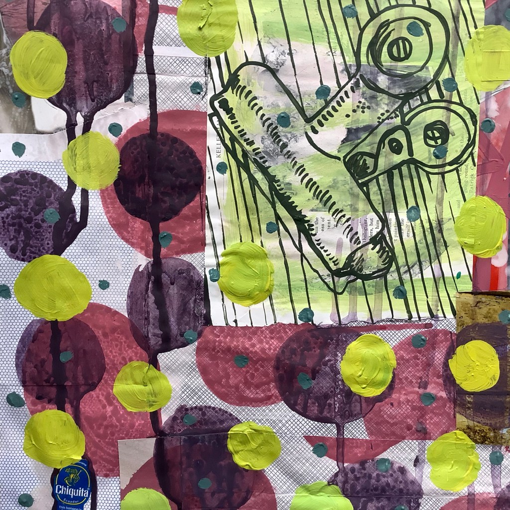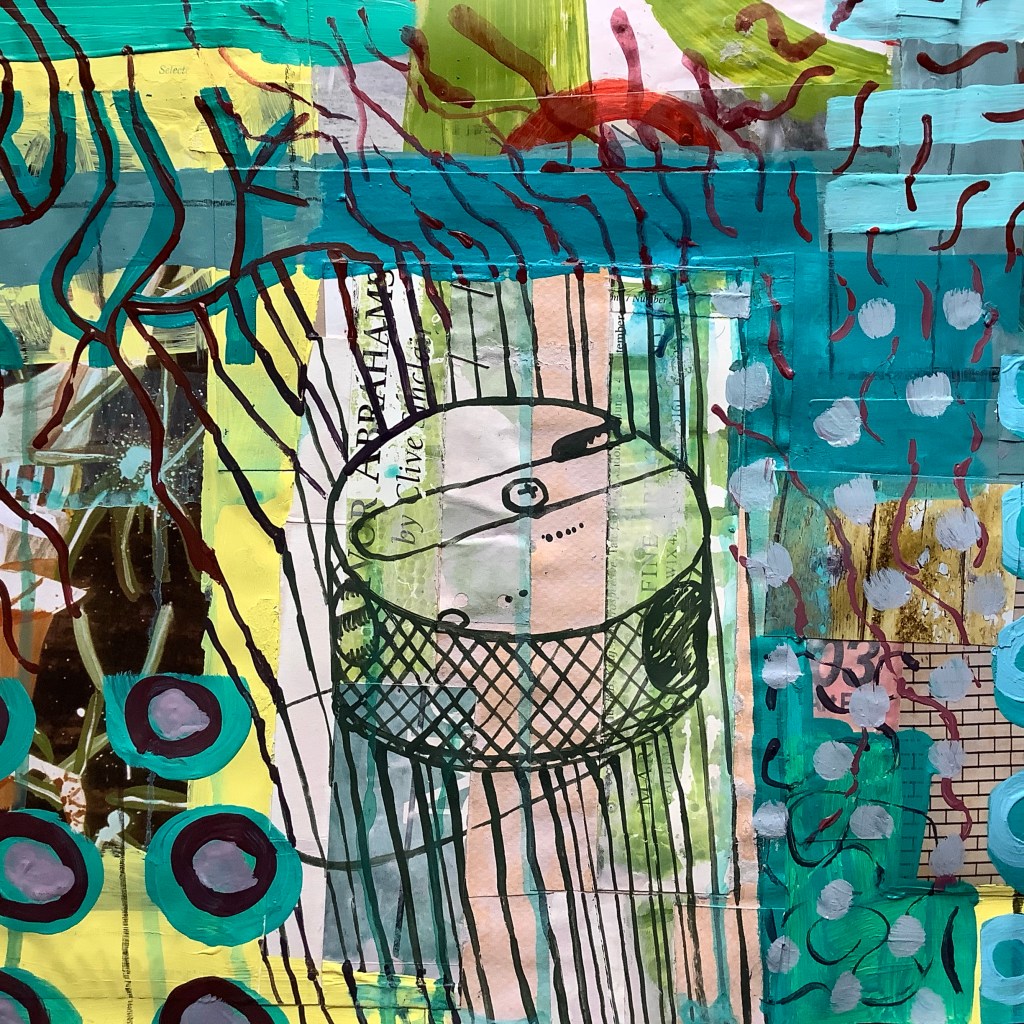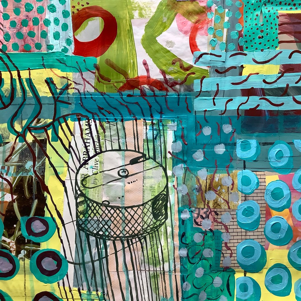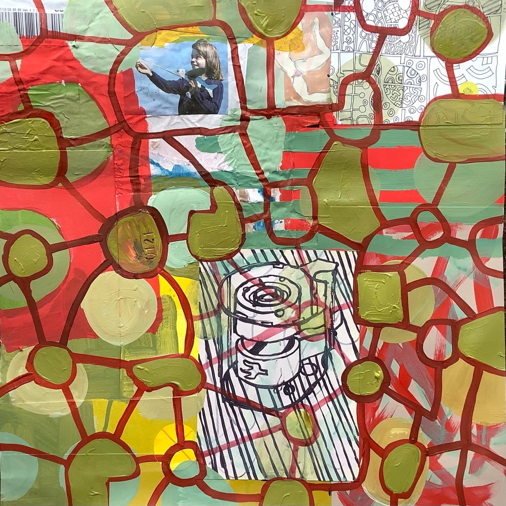 Acrylic paint on collaged paper patchwork with prints and old drawings 48cm x 48cm