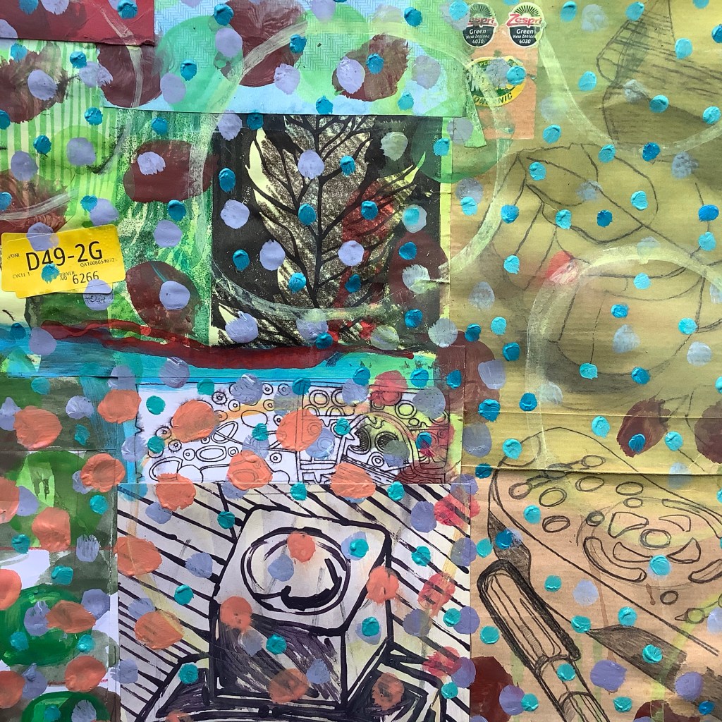 Acrylic paint on collaged paper patchwork with relief prints 48cm x 48cm
