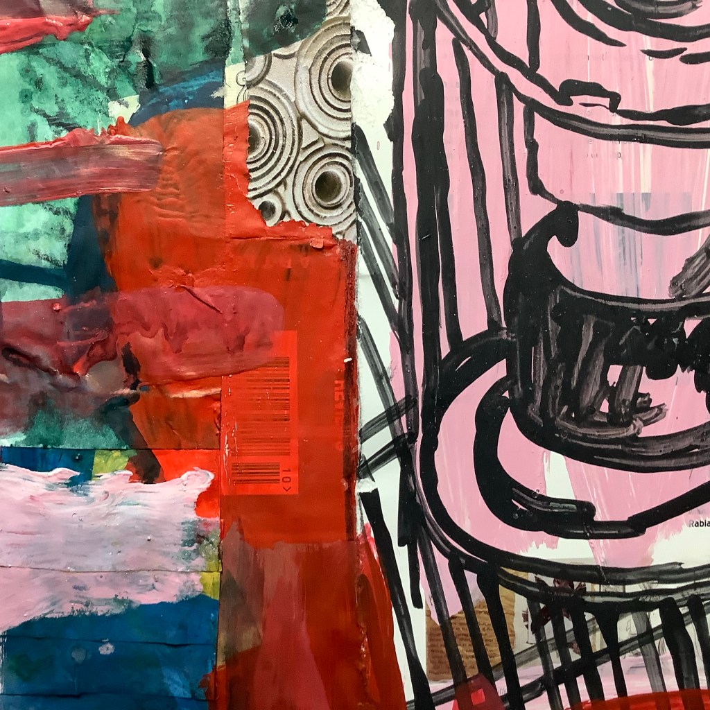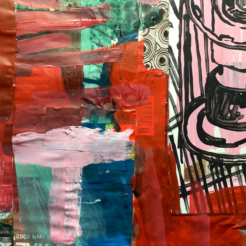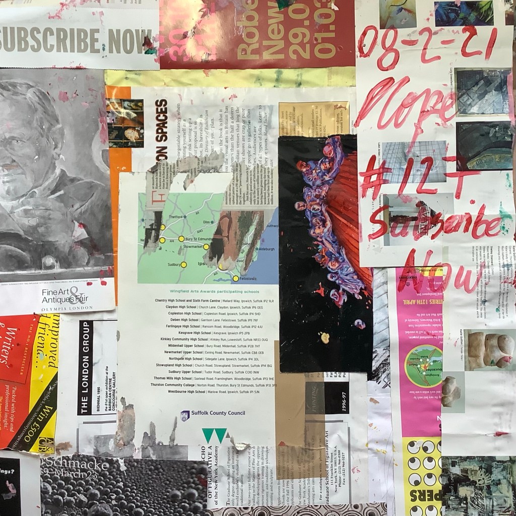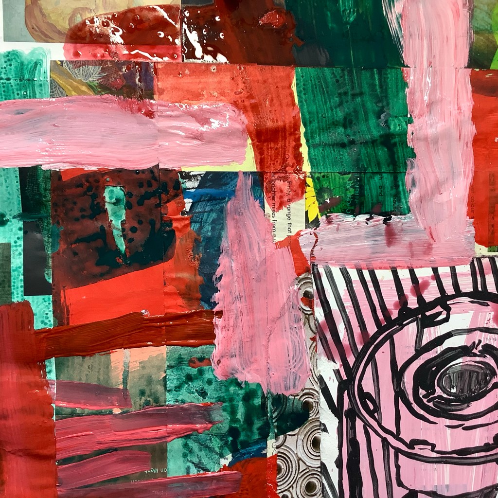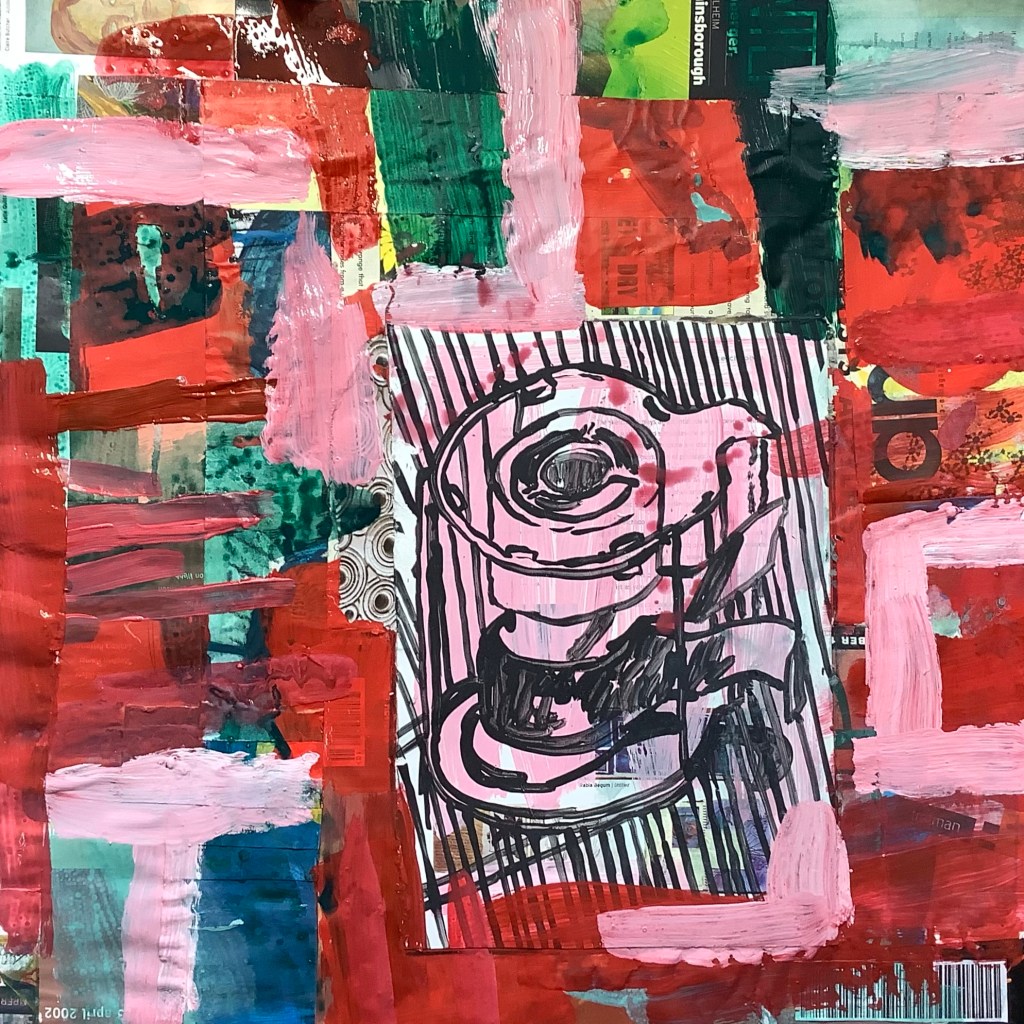 Acrylic paint on collaged paper with old art magazines 48cm x48cm