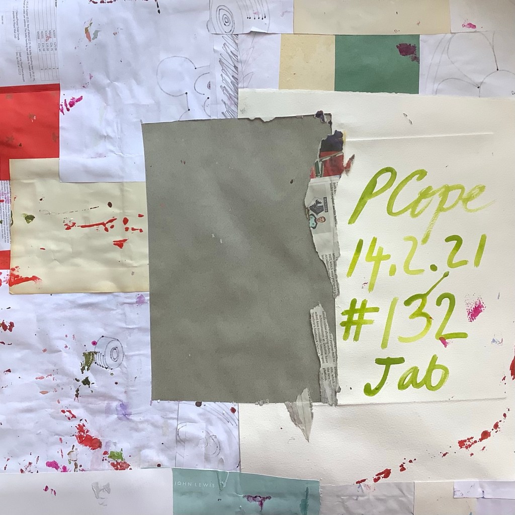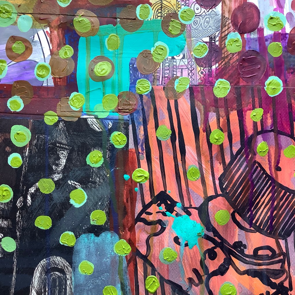 Acrylic paint on collaged paper patchwork with etching 48cm x 48cm