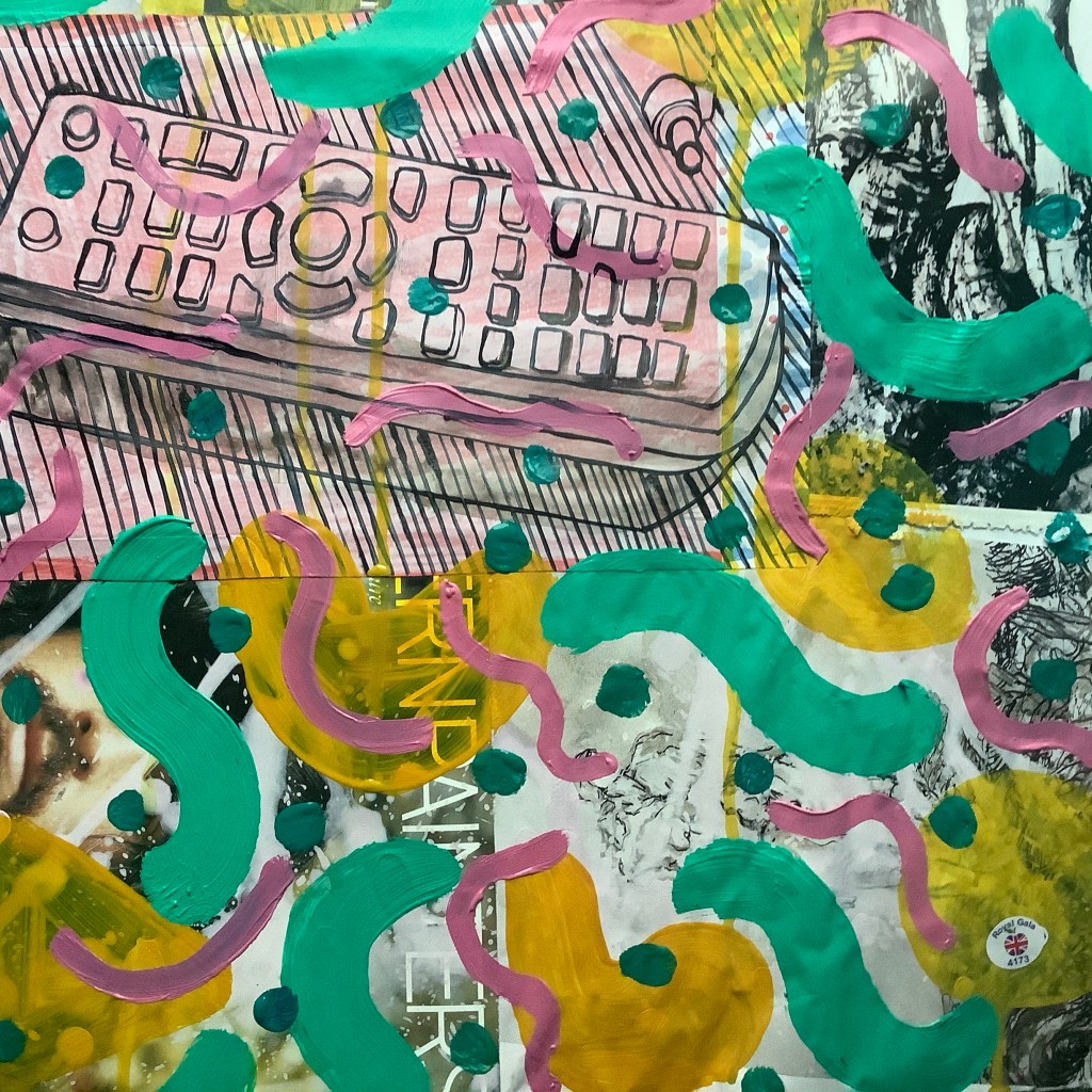 Acrylic paint on collaged paper patchwork with art magazines 48cm x 48cm