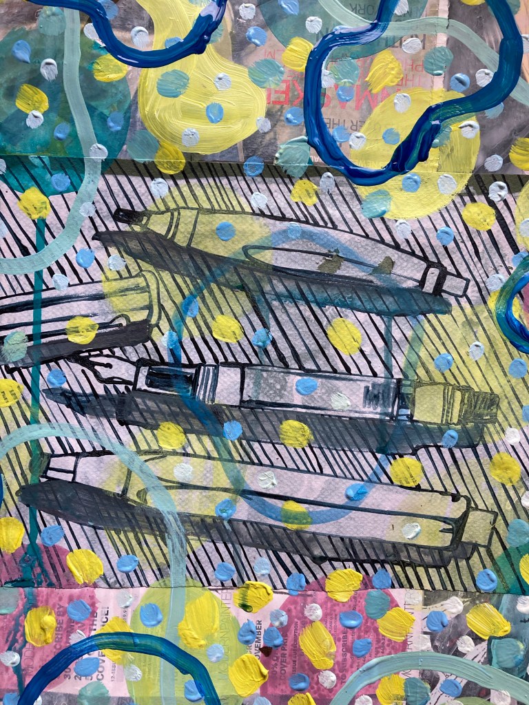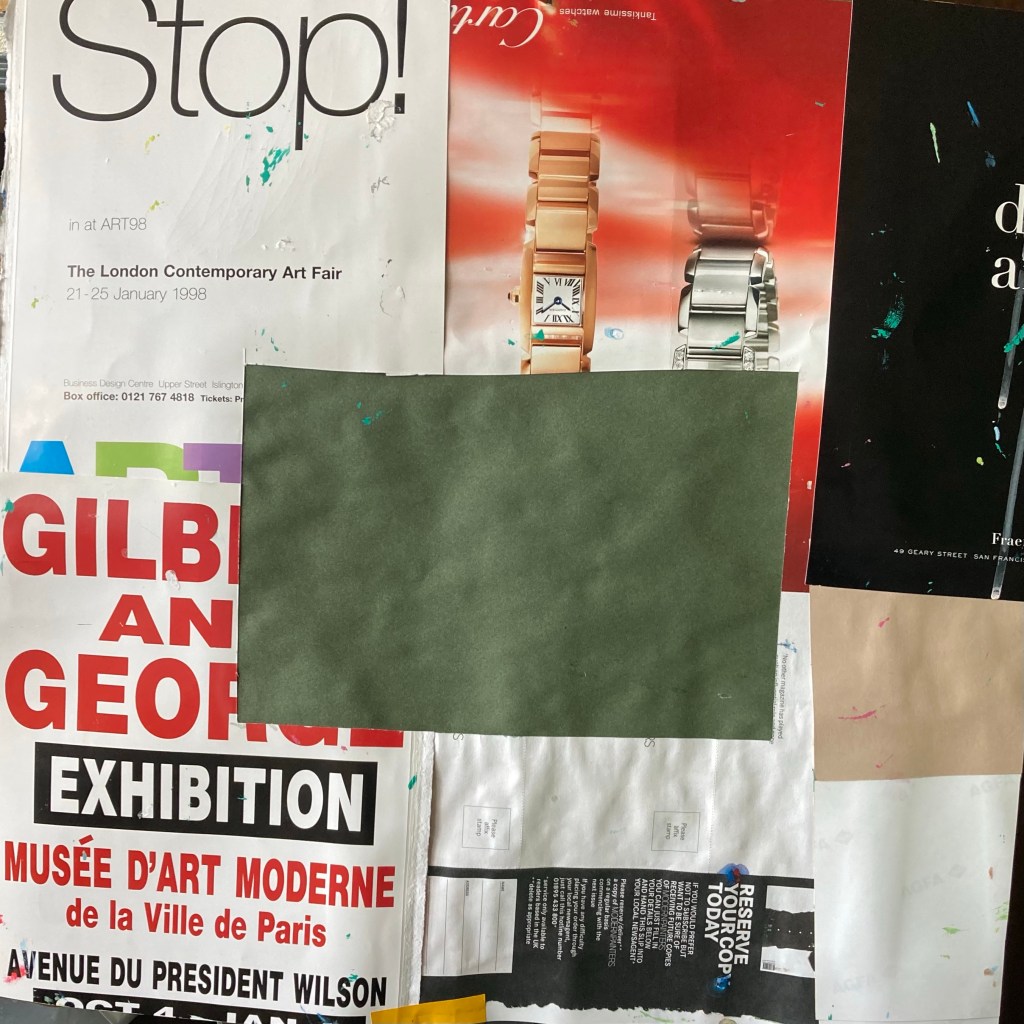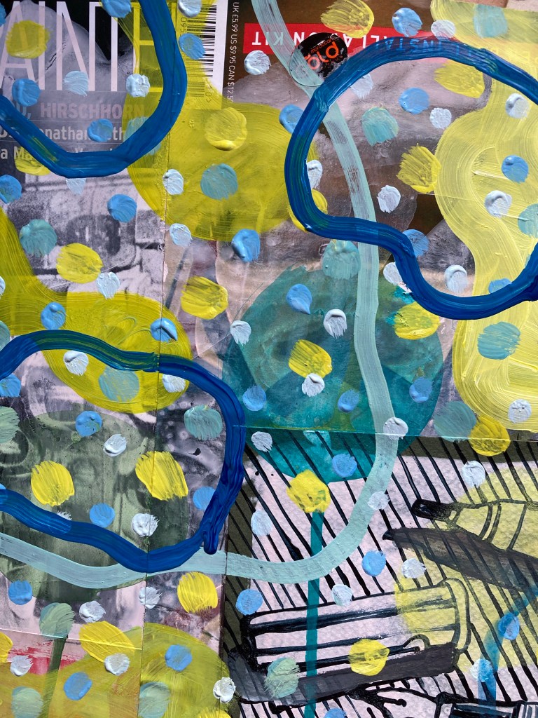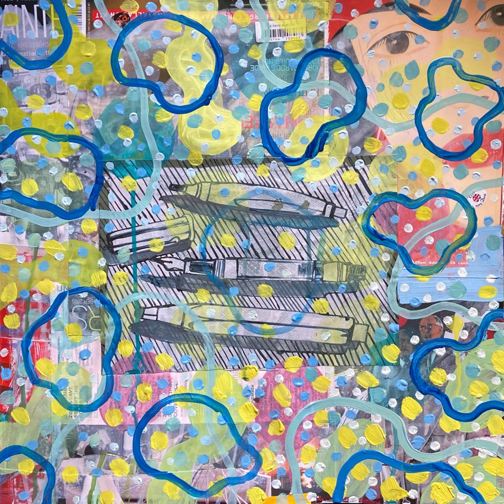 Acrylic paint on collaged paper patchwork with old art magazines 48cm x 48c