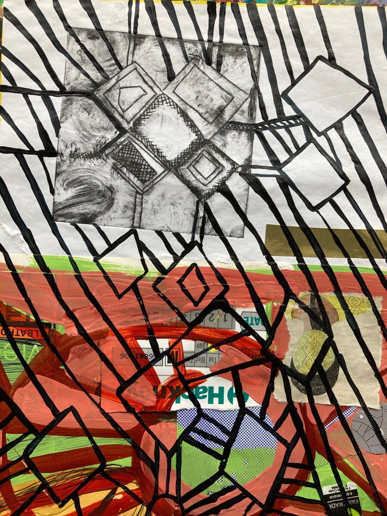 Acrylic paint on collaged paper patchwork with drypoint 48cm x 48cm
