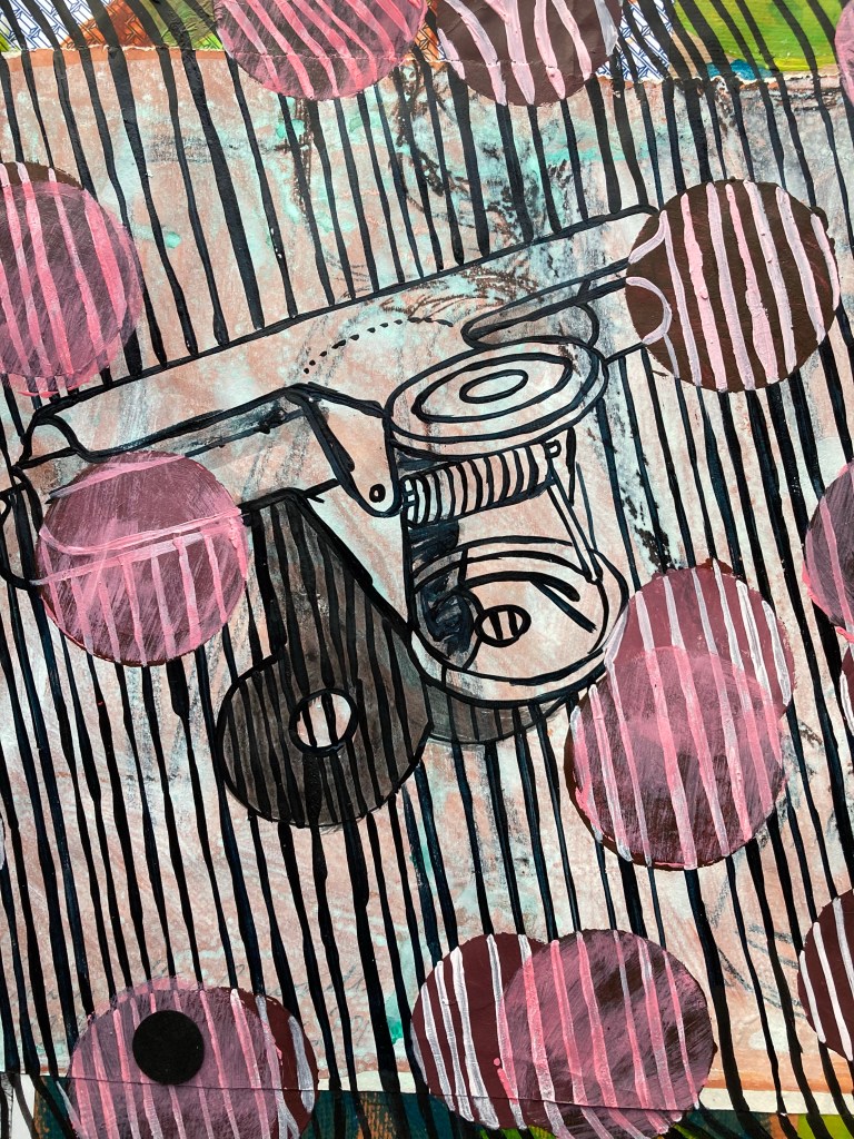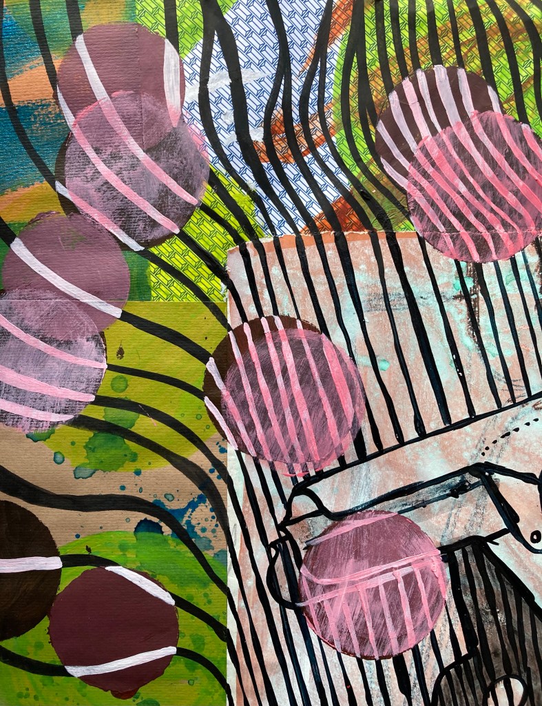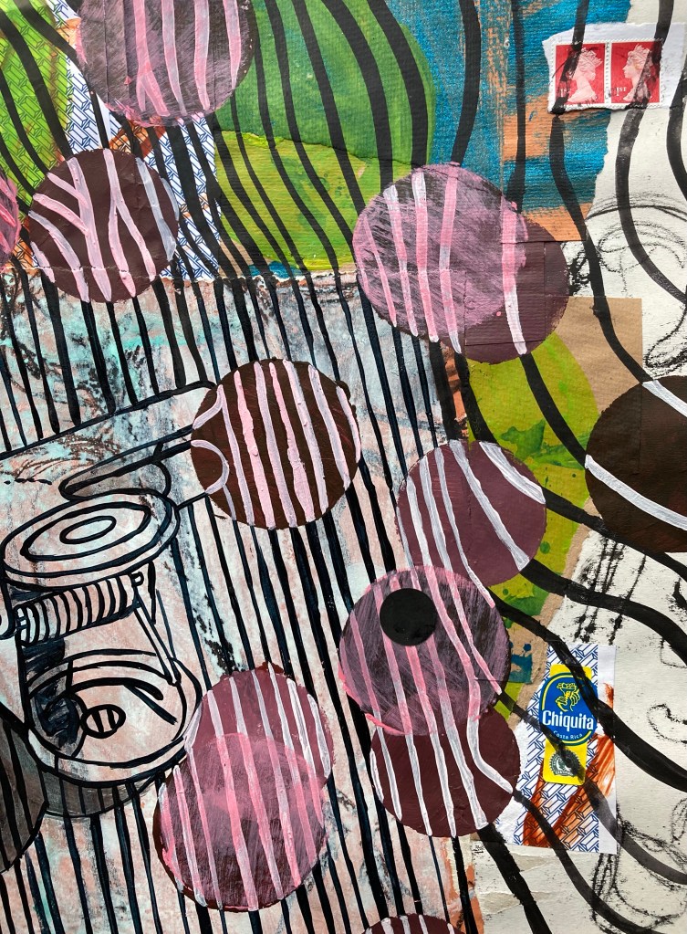 Acrylic paint on collaged paper patchwork with monoprint and etching 48cm x 48cm
