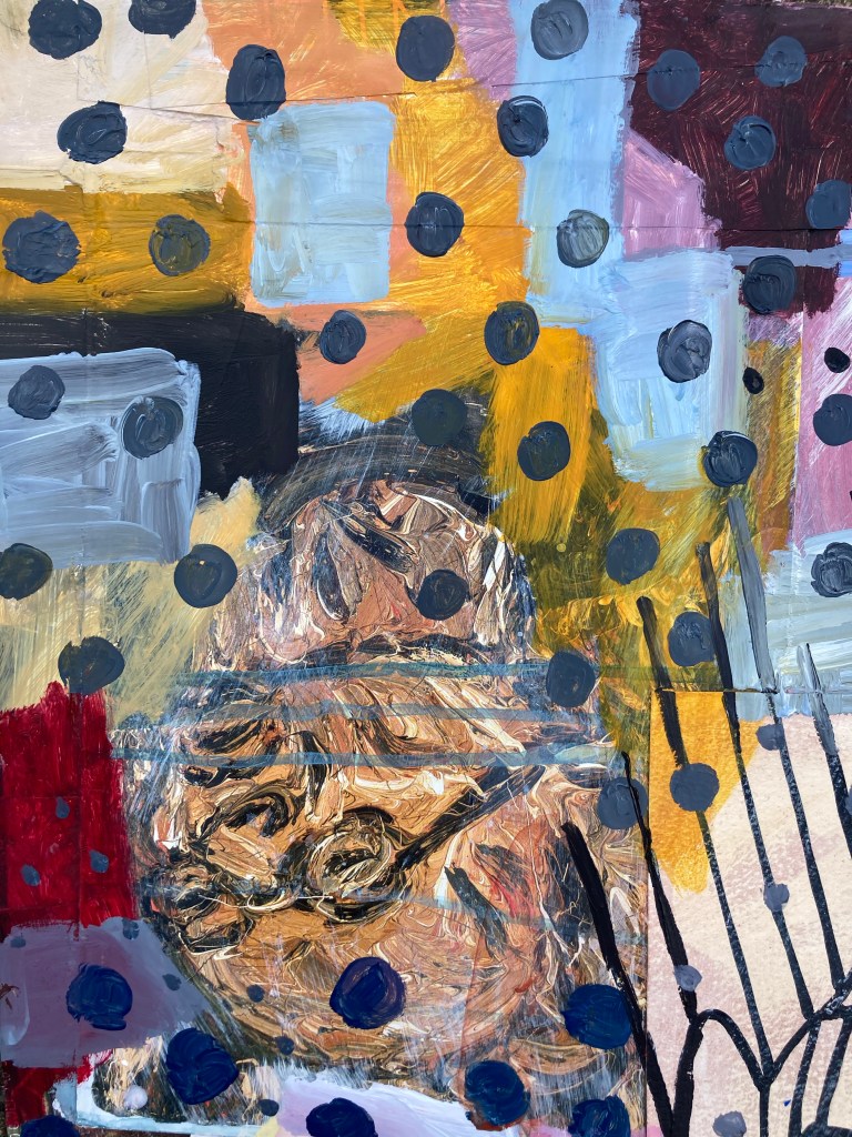 Acrylic paint on collaged paper patchwork with art magazines 48cm x 48cm