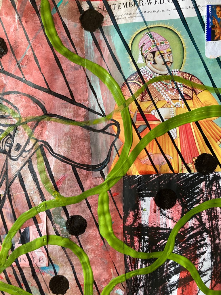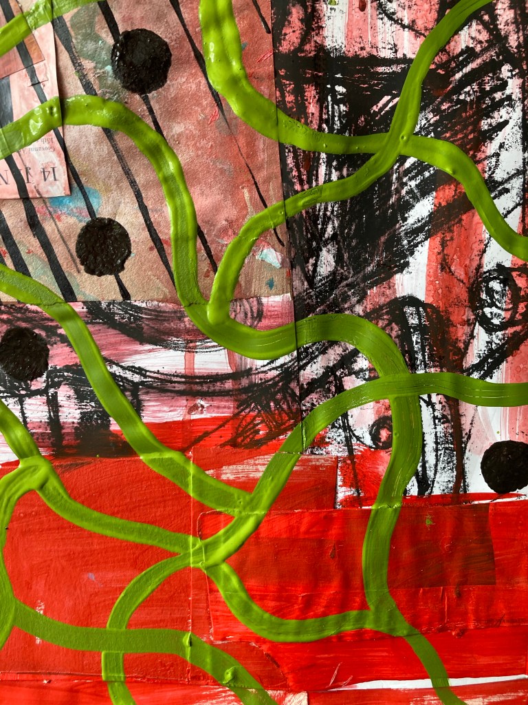 Acrylic paint on collaged paper patchwork with art magazines 48cm x48cm