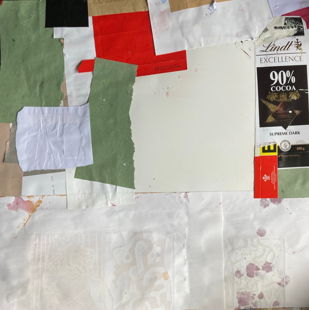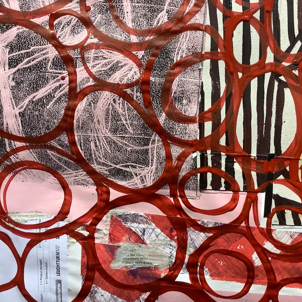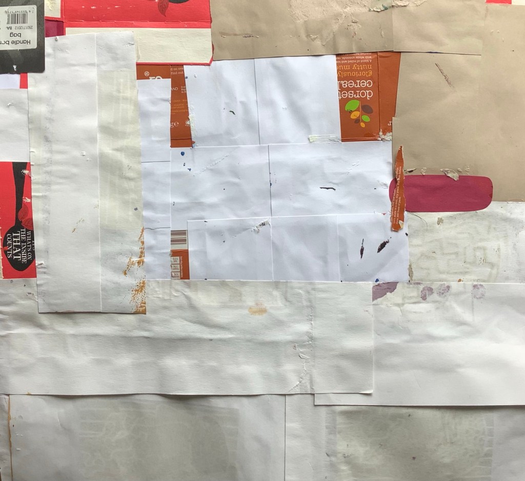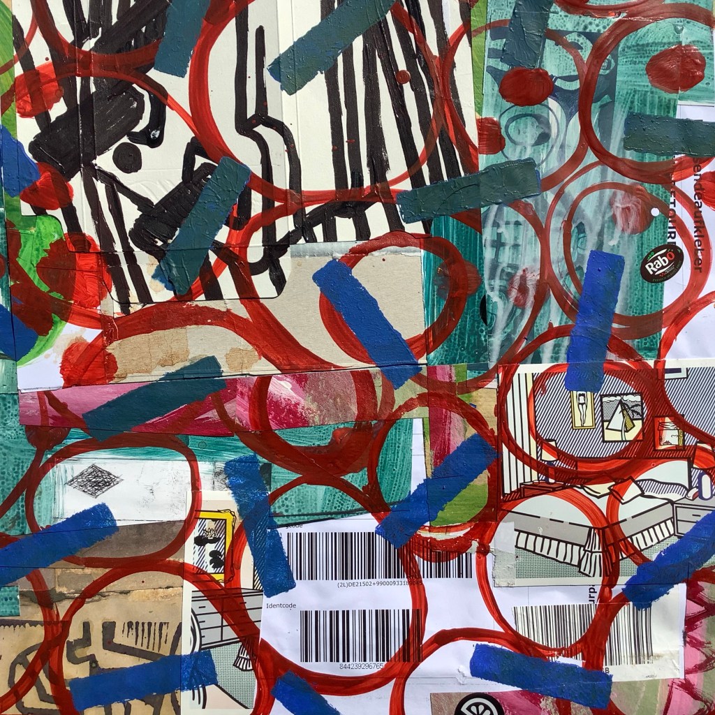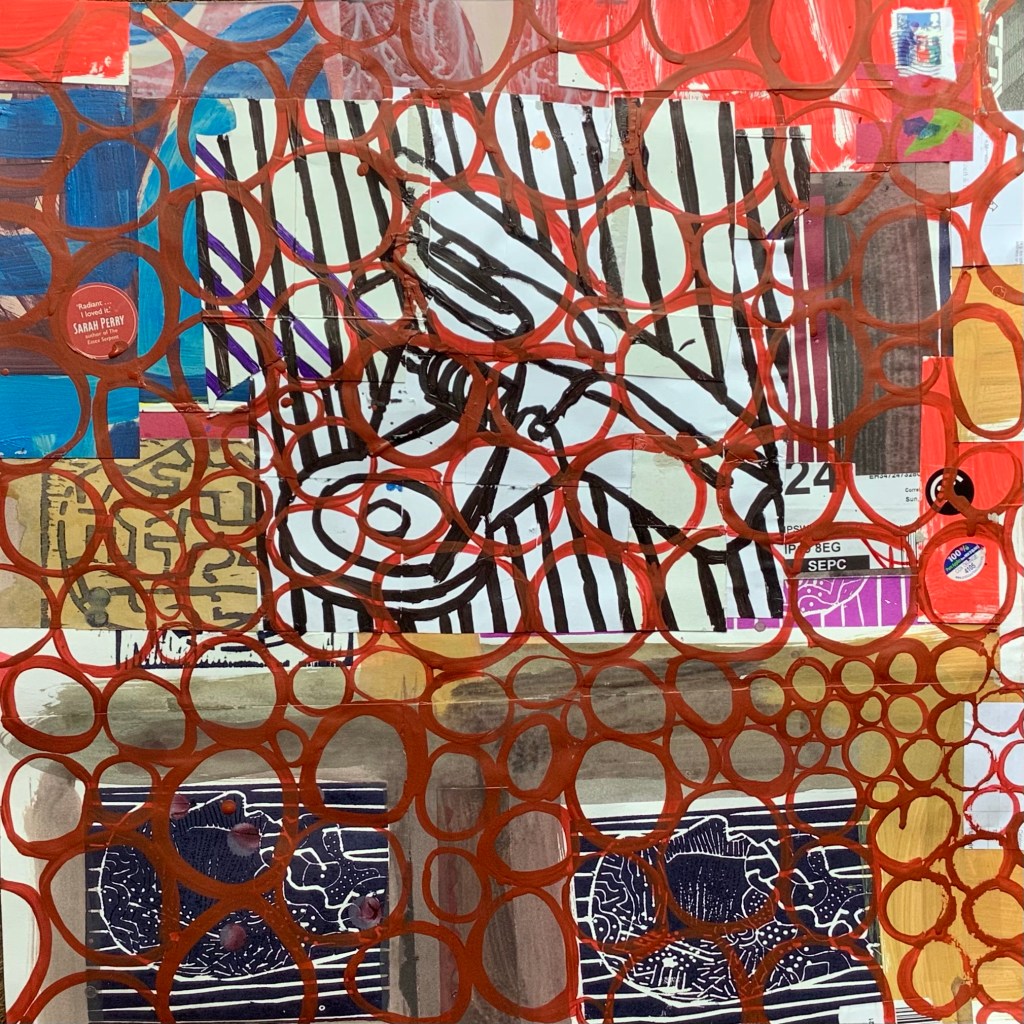 Acrylic paint on collaged paper patchwork with monoprint, relief print and old drawing 48cm x 48cm