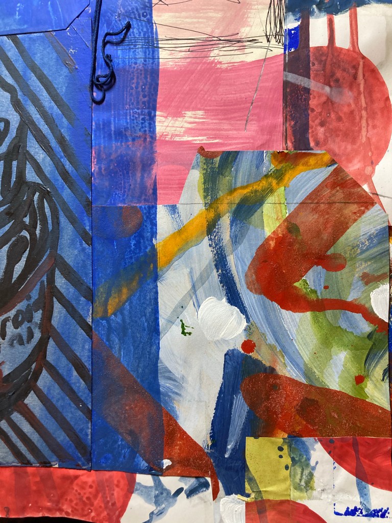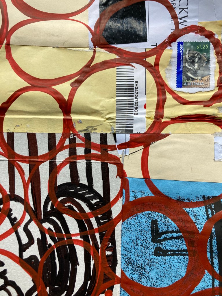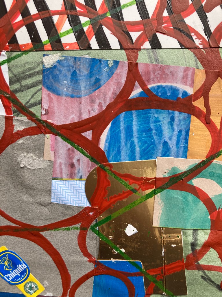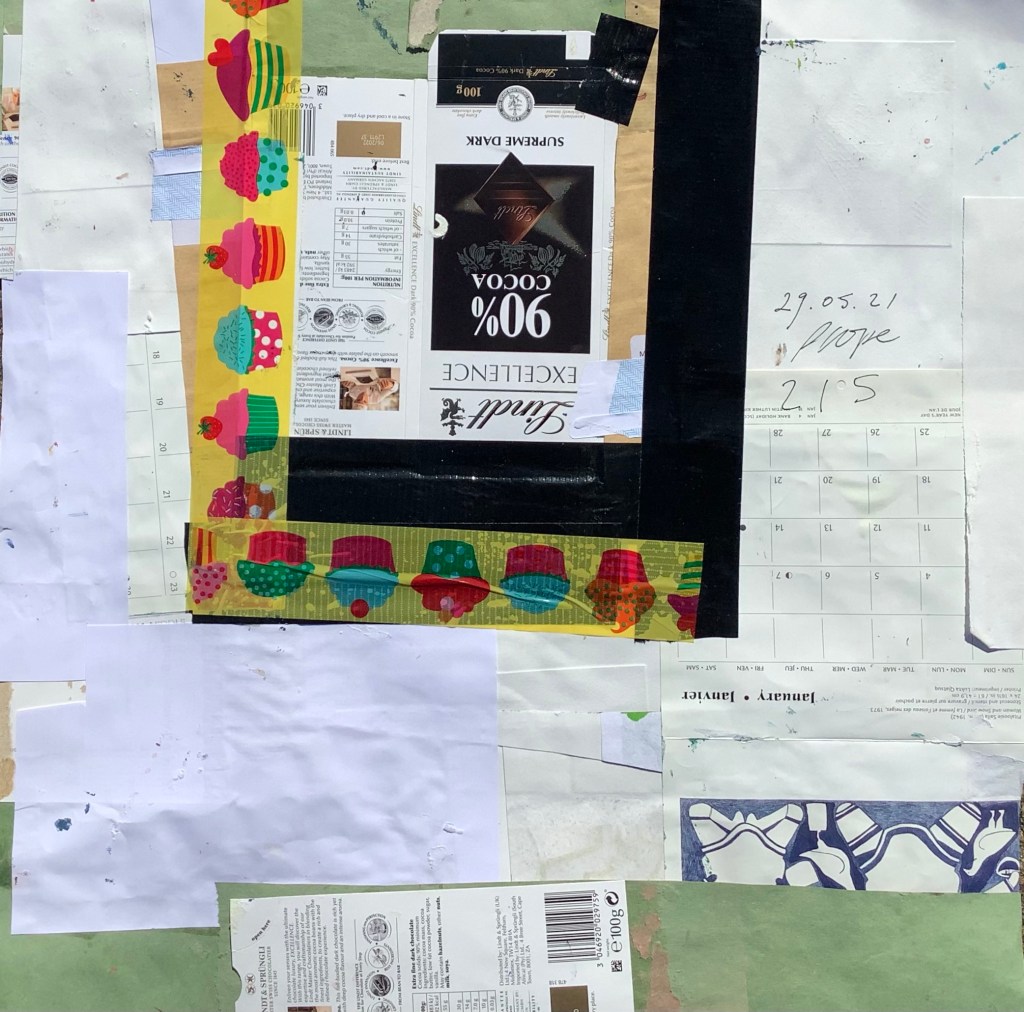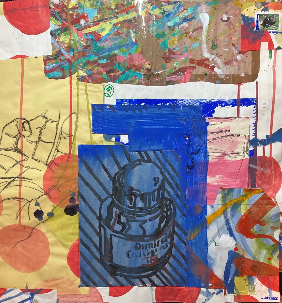 Acrylic paint on collaged paper patchwork with monoprint, relief print and old drawing 48cm x 48cm