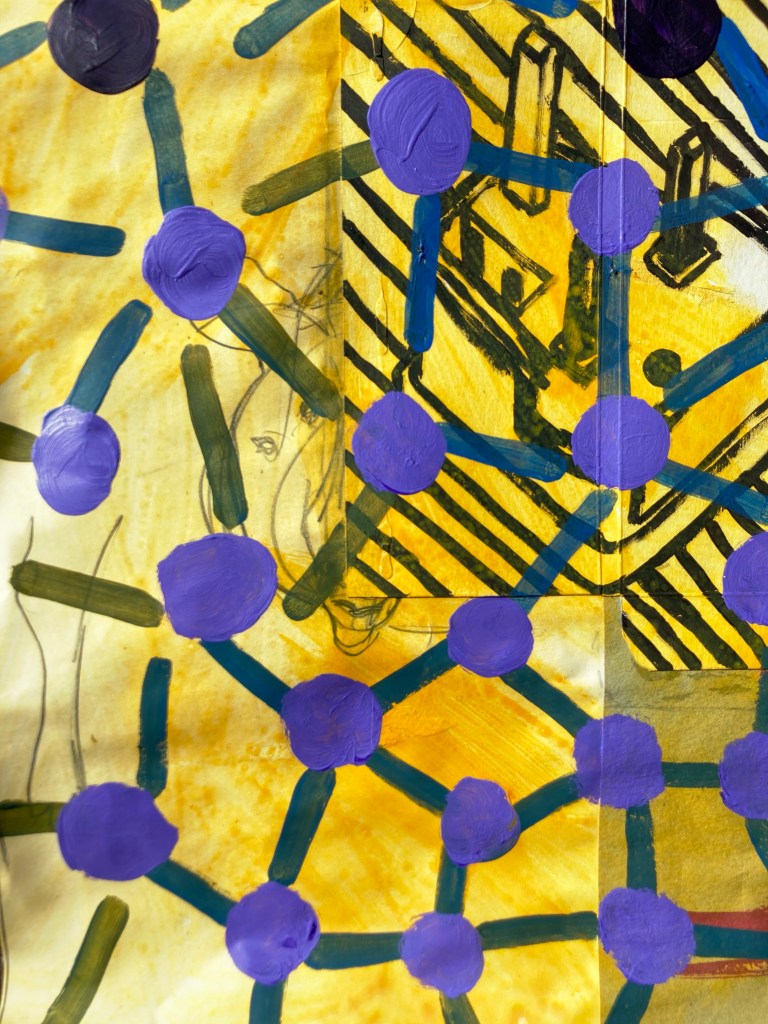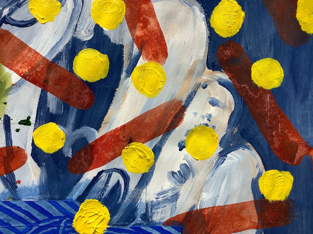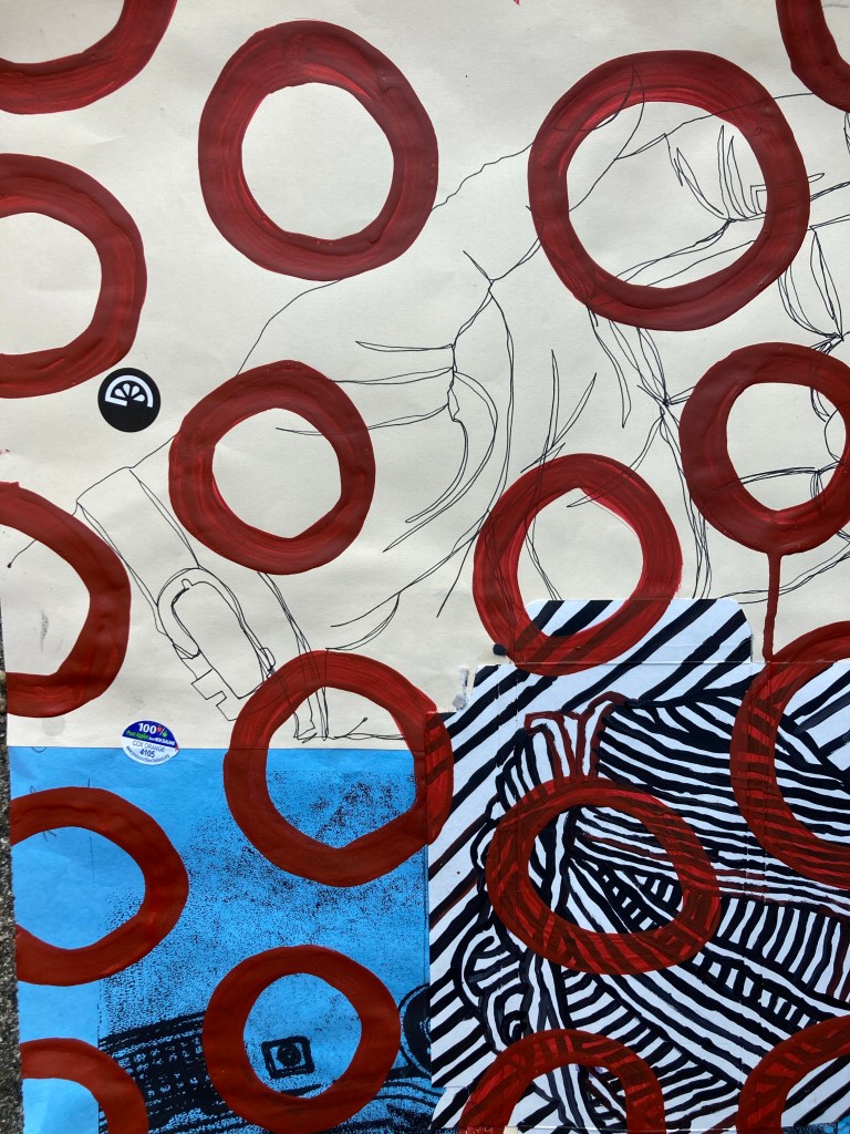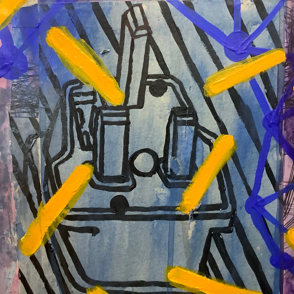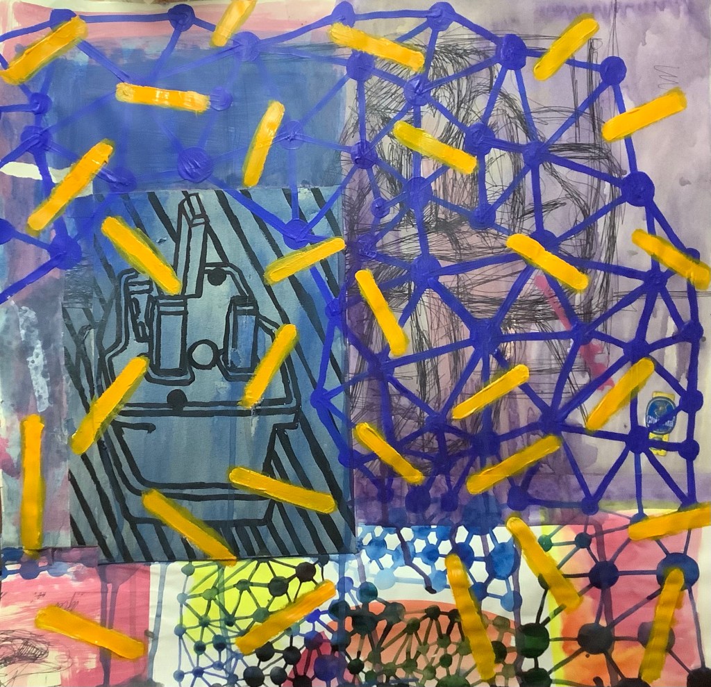 Acrylic paint on collaged paper patchwork with monoprint, relief print and old drawing 48cm x 48cm