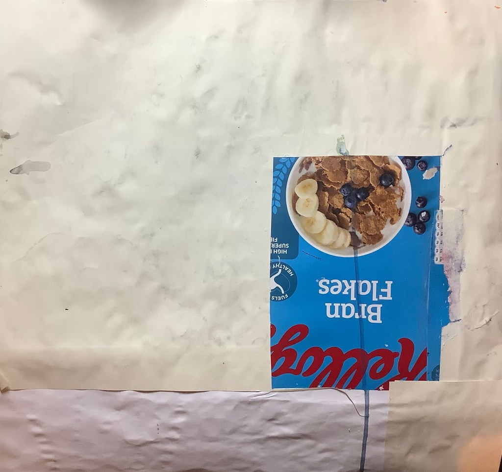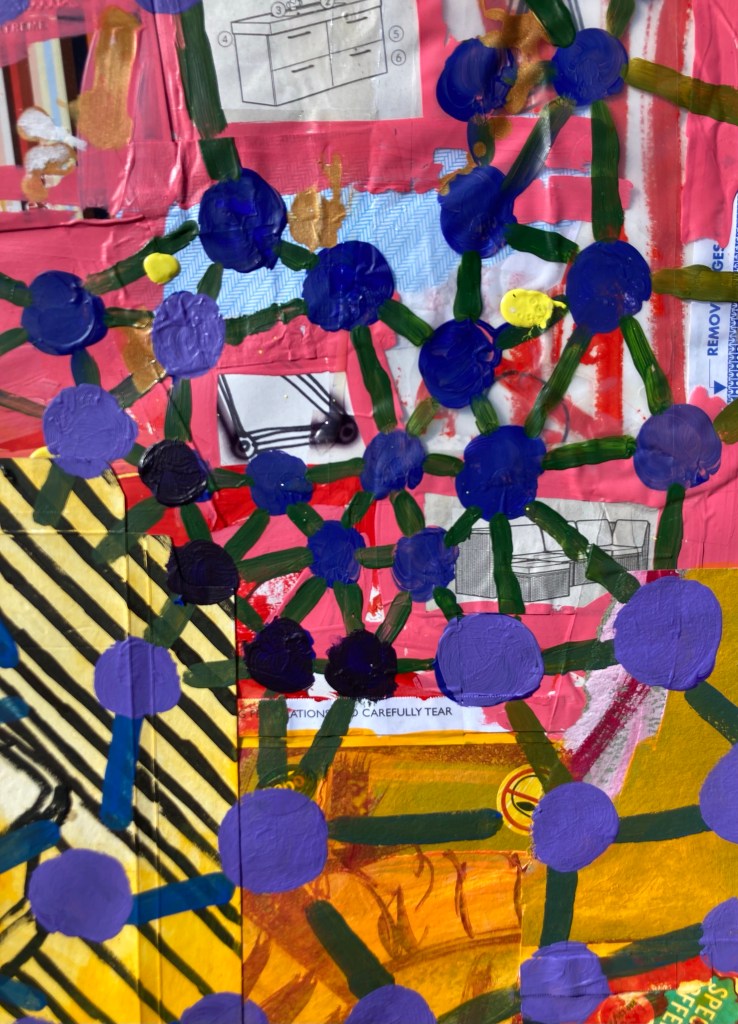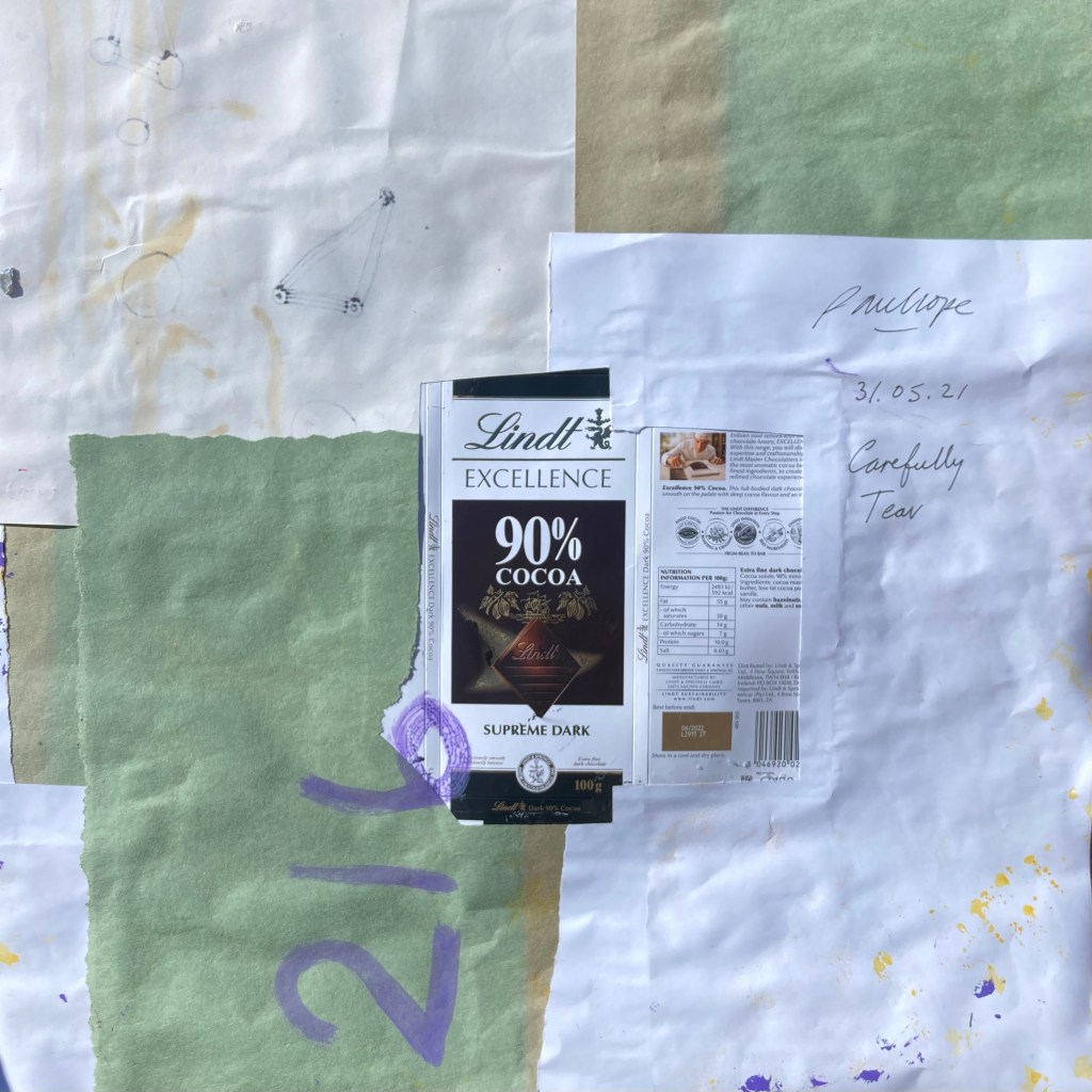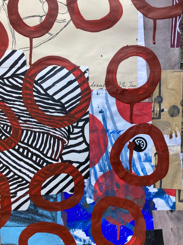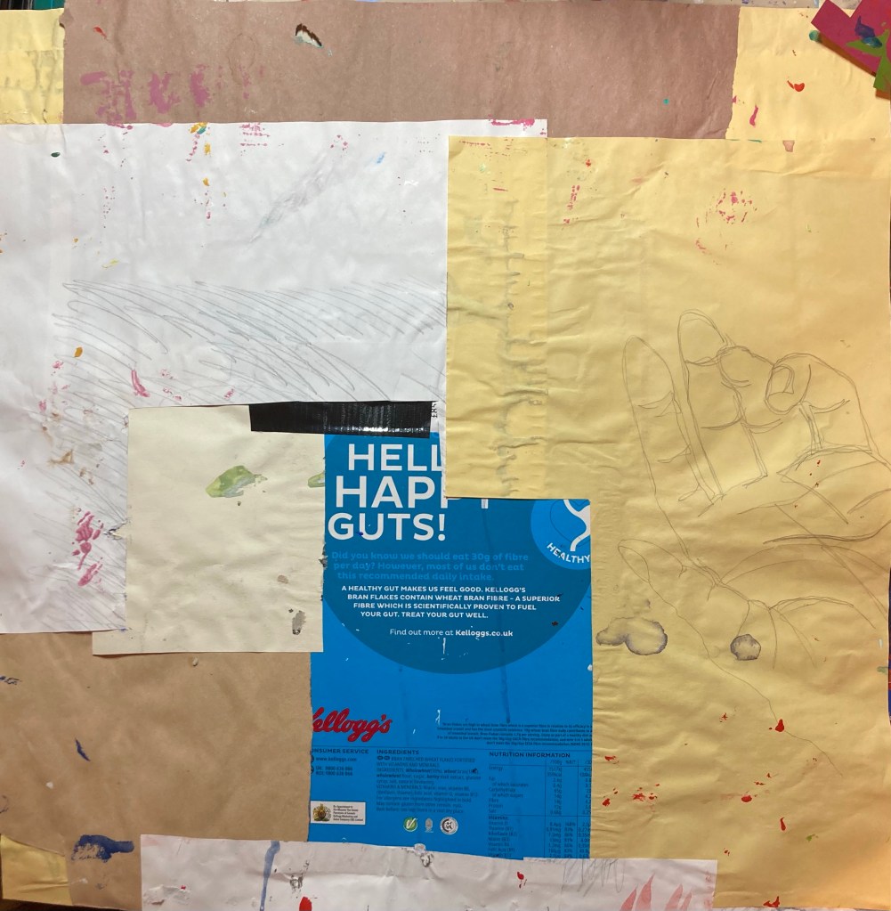 Acrylic paint on collaged paper patchwork with old drawings 48cm x 48cm