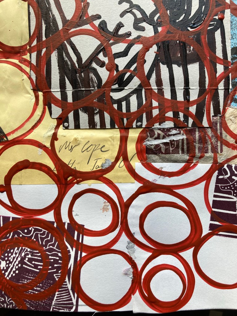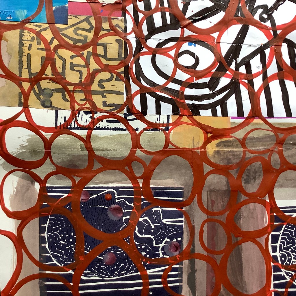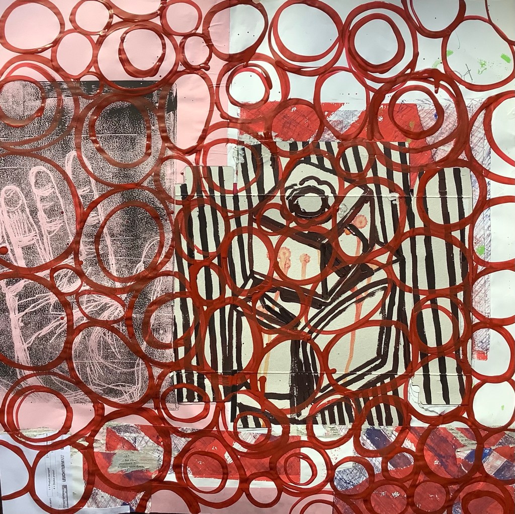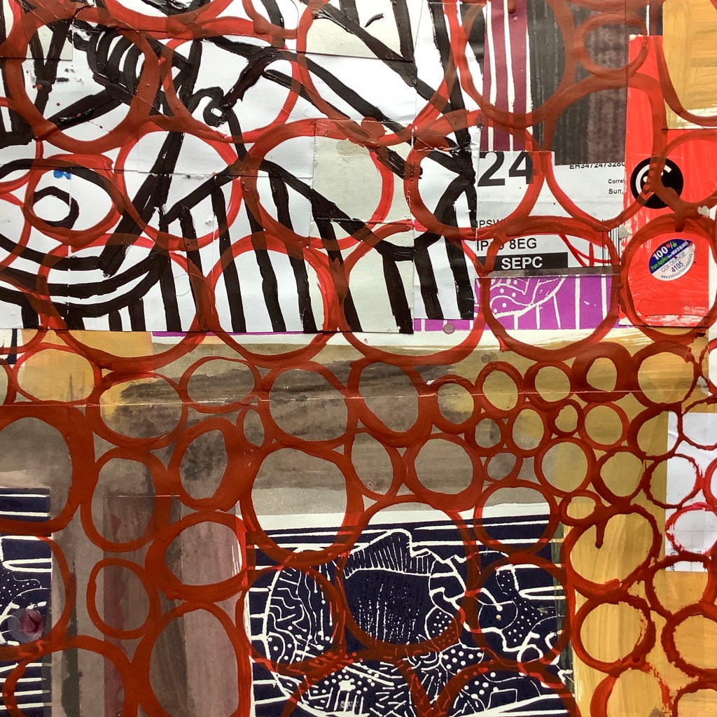 Acrylic paint on collaged paper patchwork with monoprint and relief prints 48cm x 48cm