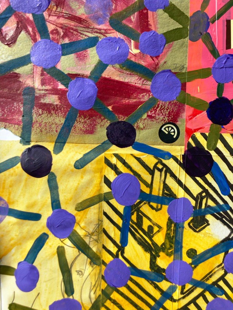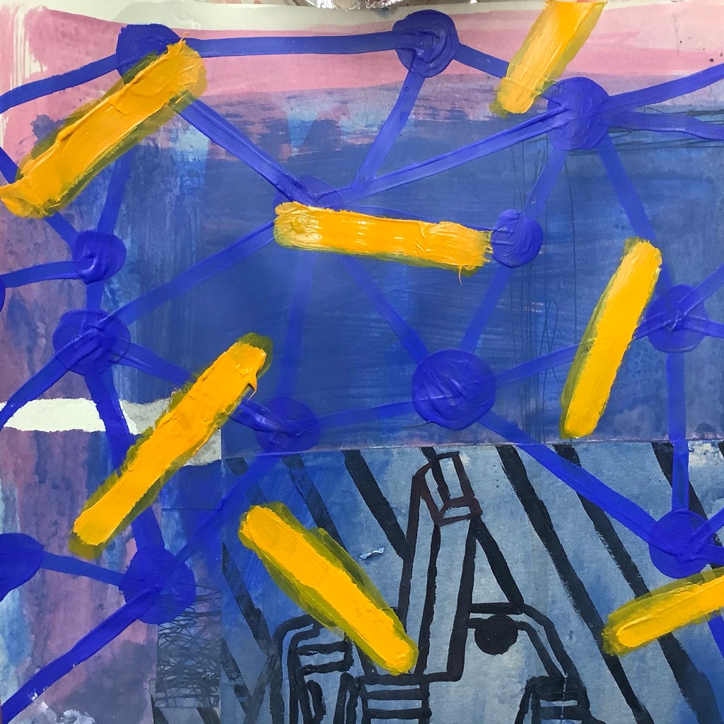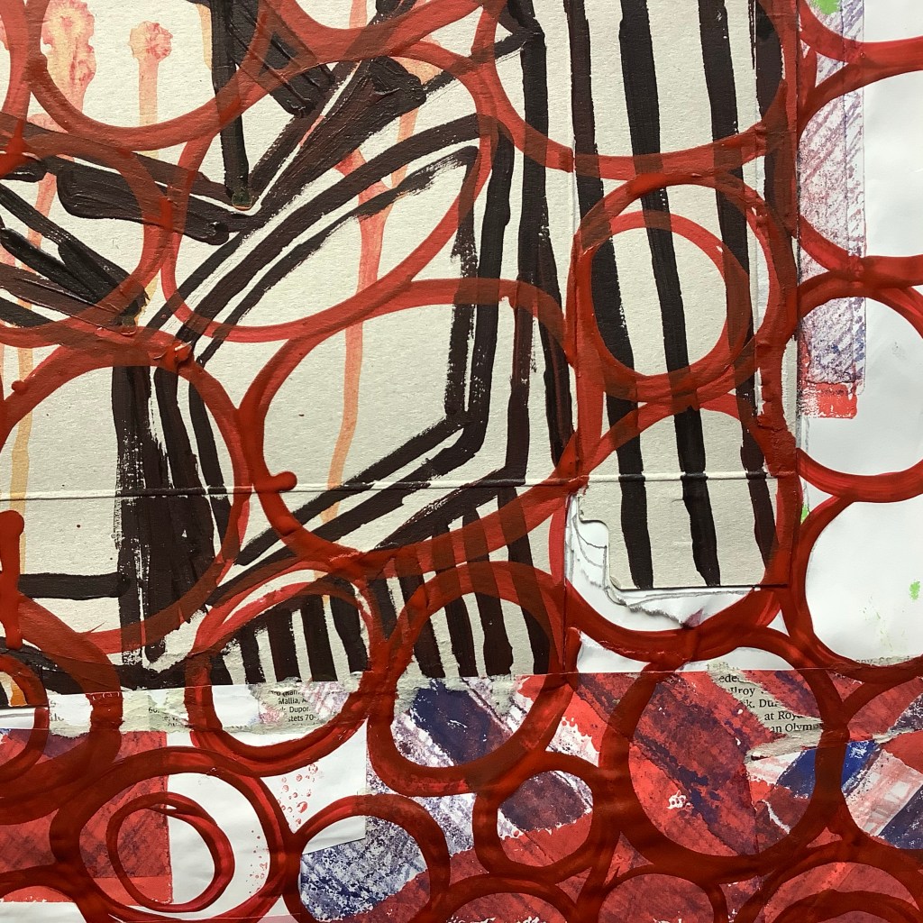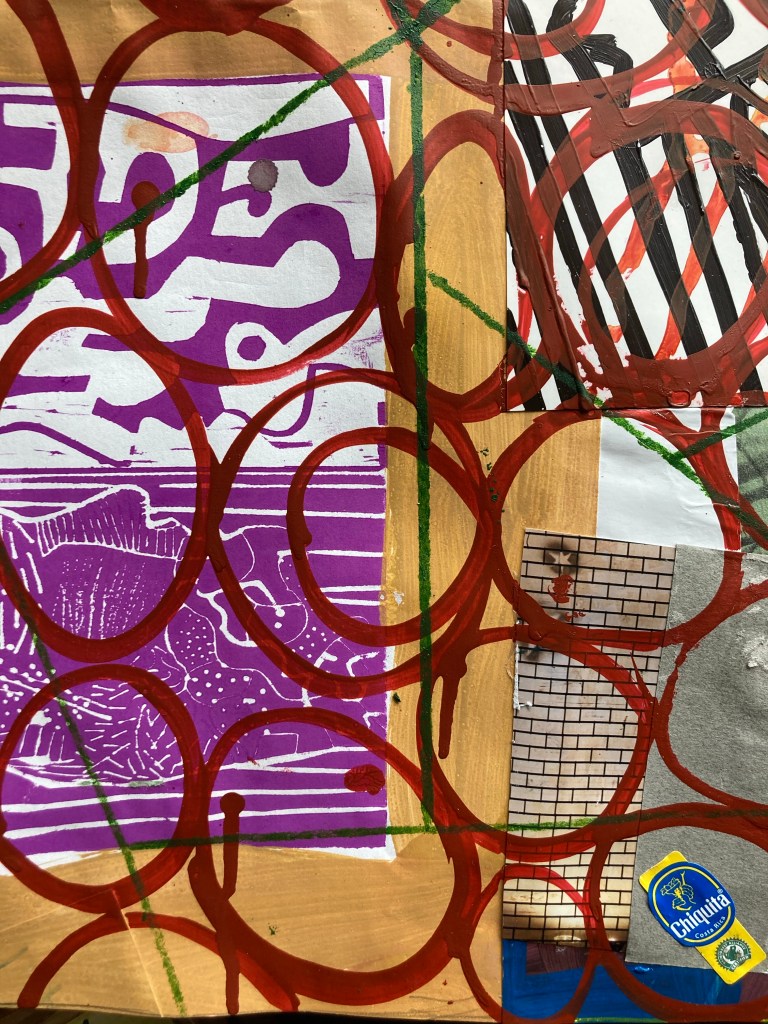 Acrylic paint on collaged paper patchwork with monoprint and relief prints 48cm x 48cm