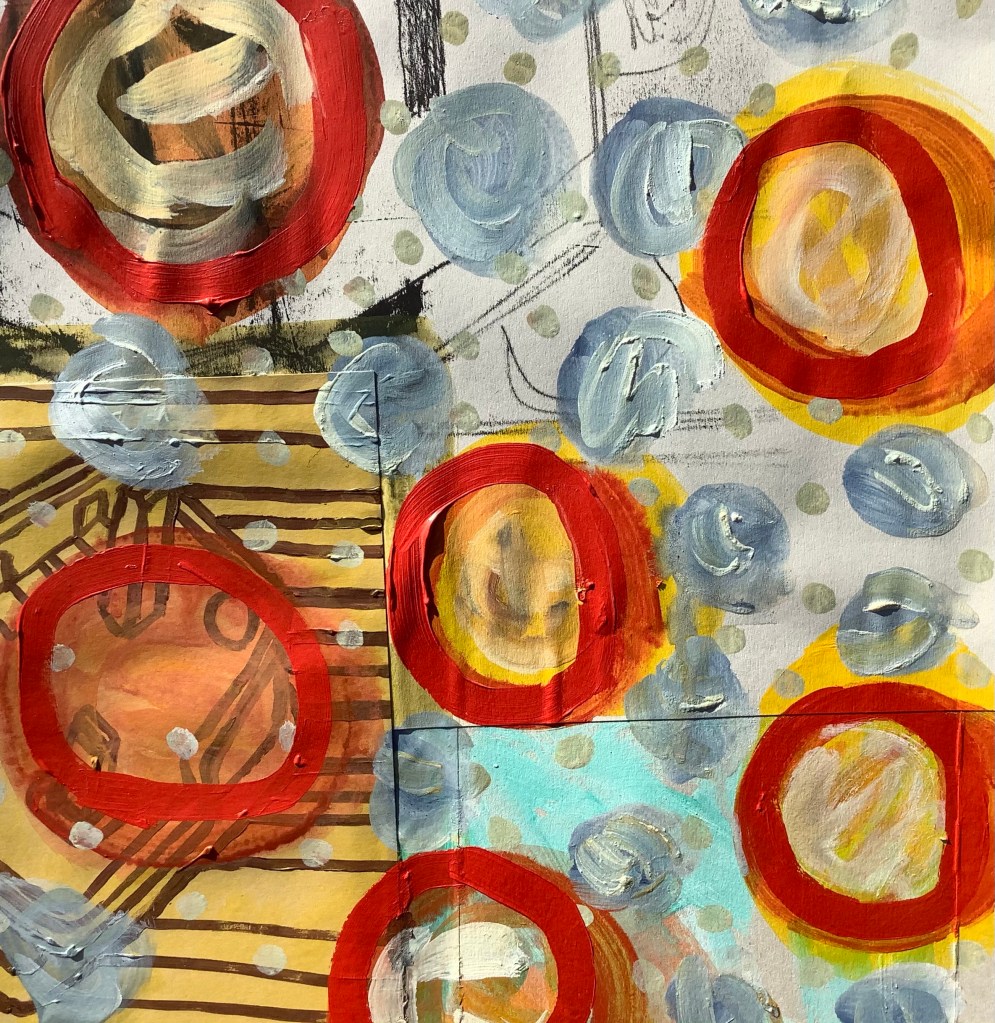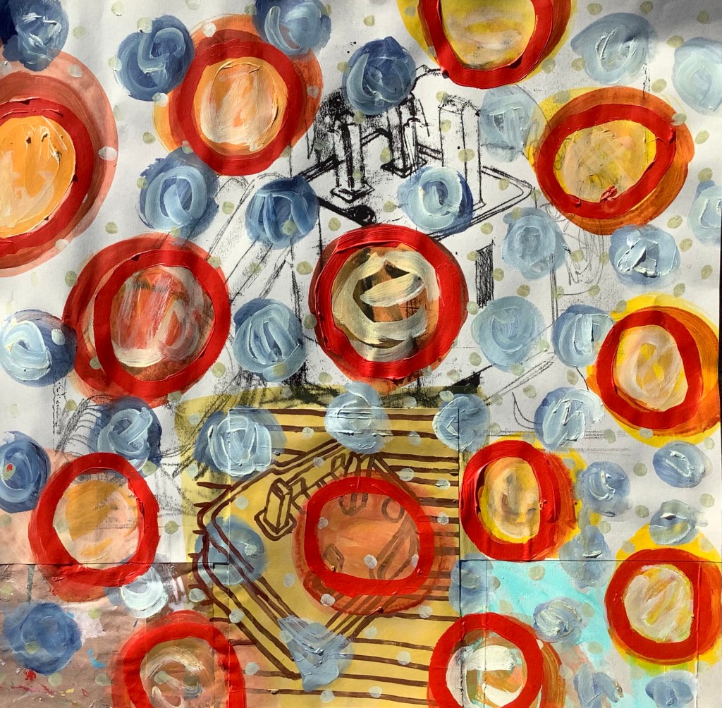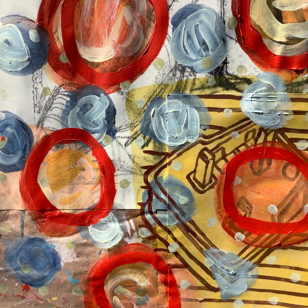 Acrylic paint on collaged paper patchwork with old monoprint 48cm x 48cm