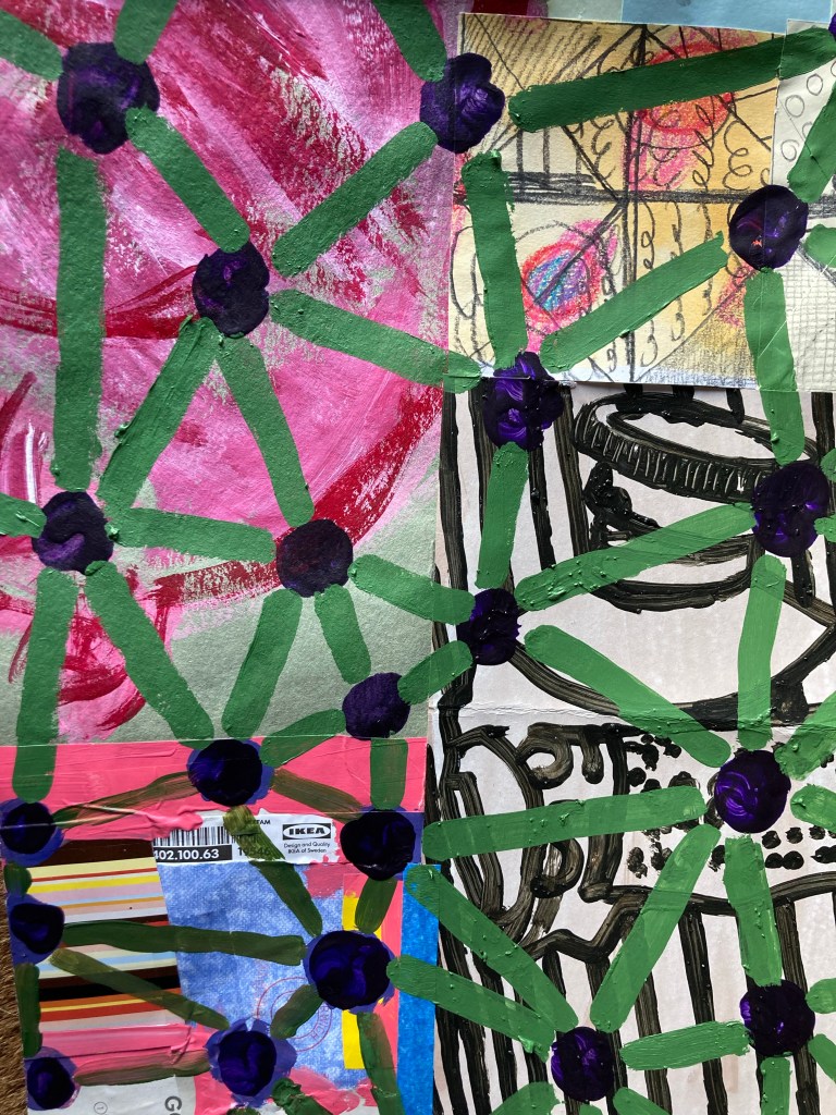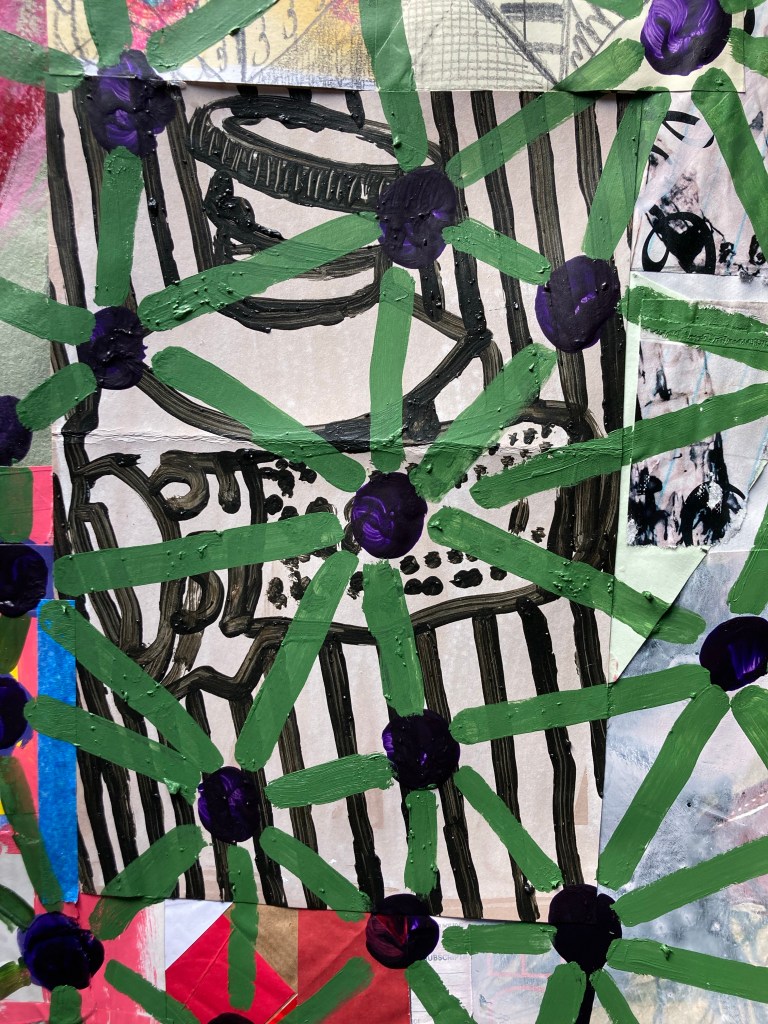 Acrylic paint on collaged paper patchwork with old drawings and painting 48cm x 48cm
