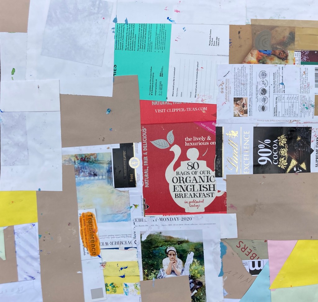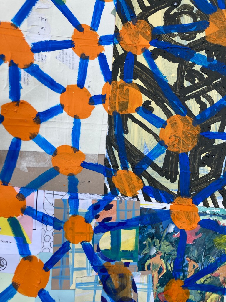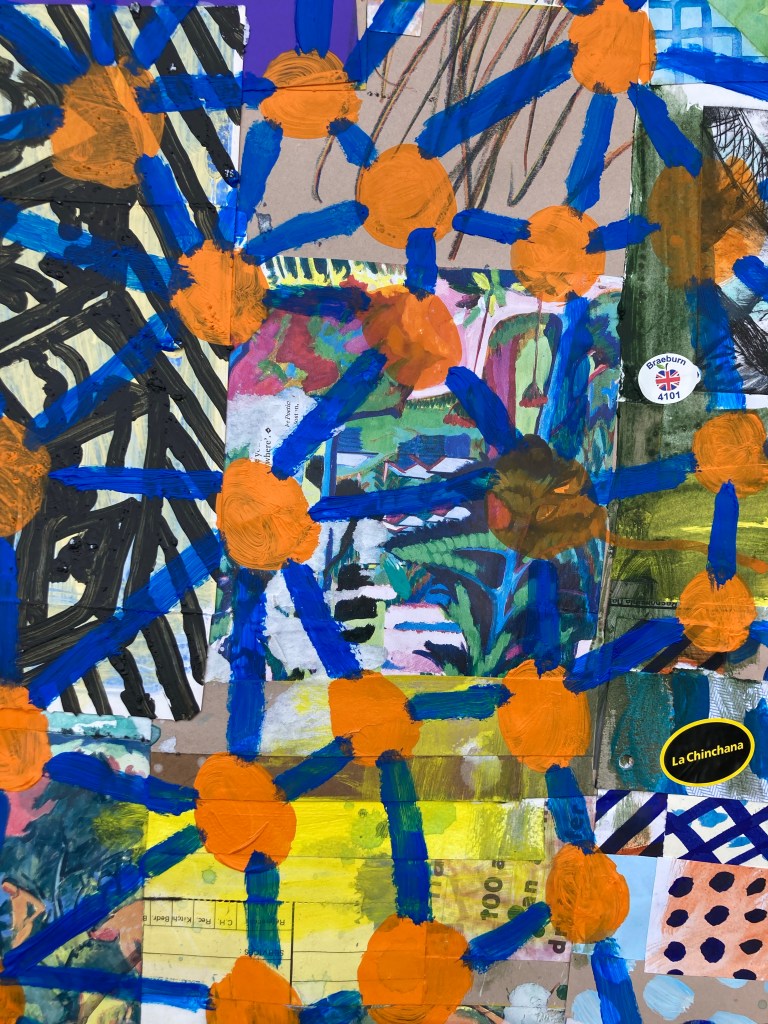 Acrylic paint on collaged paper patchwork with old drawing 48cm x 48cm