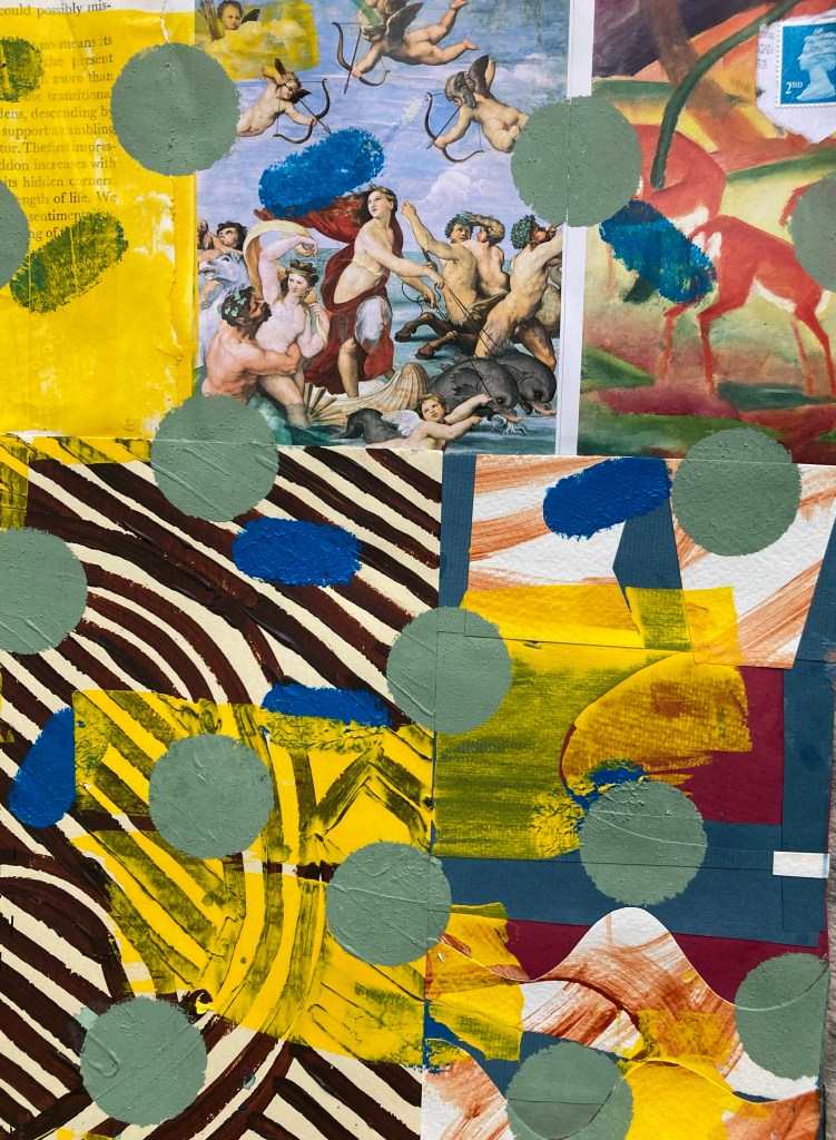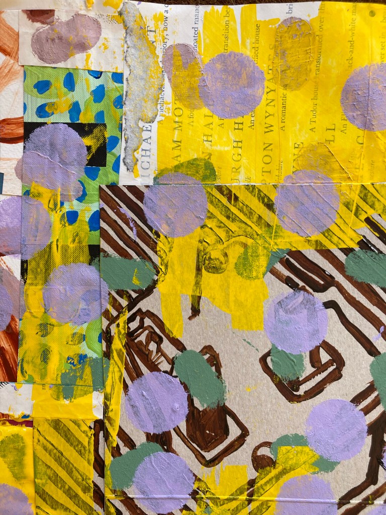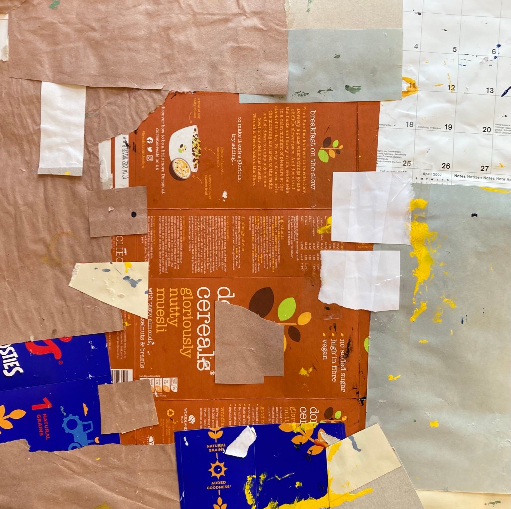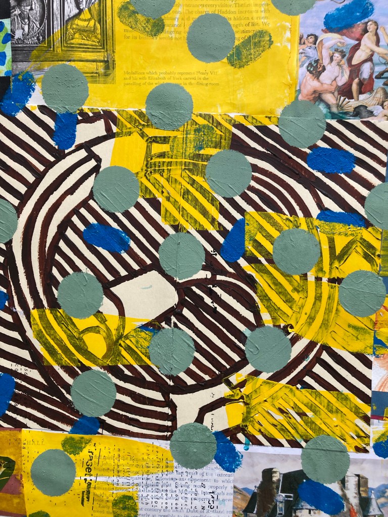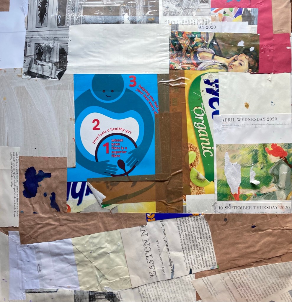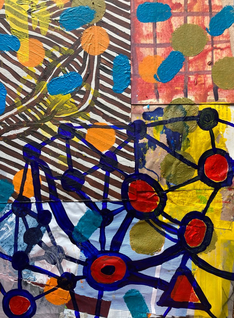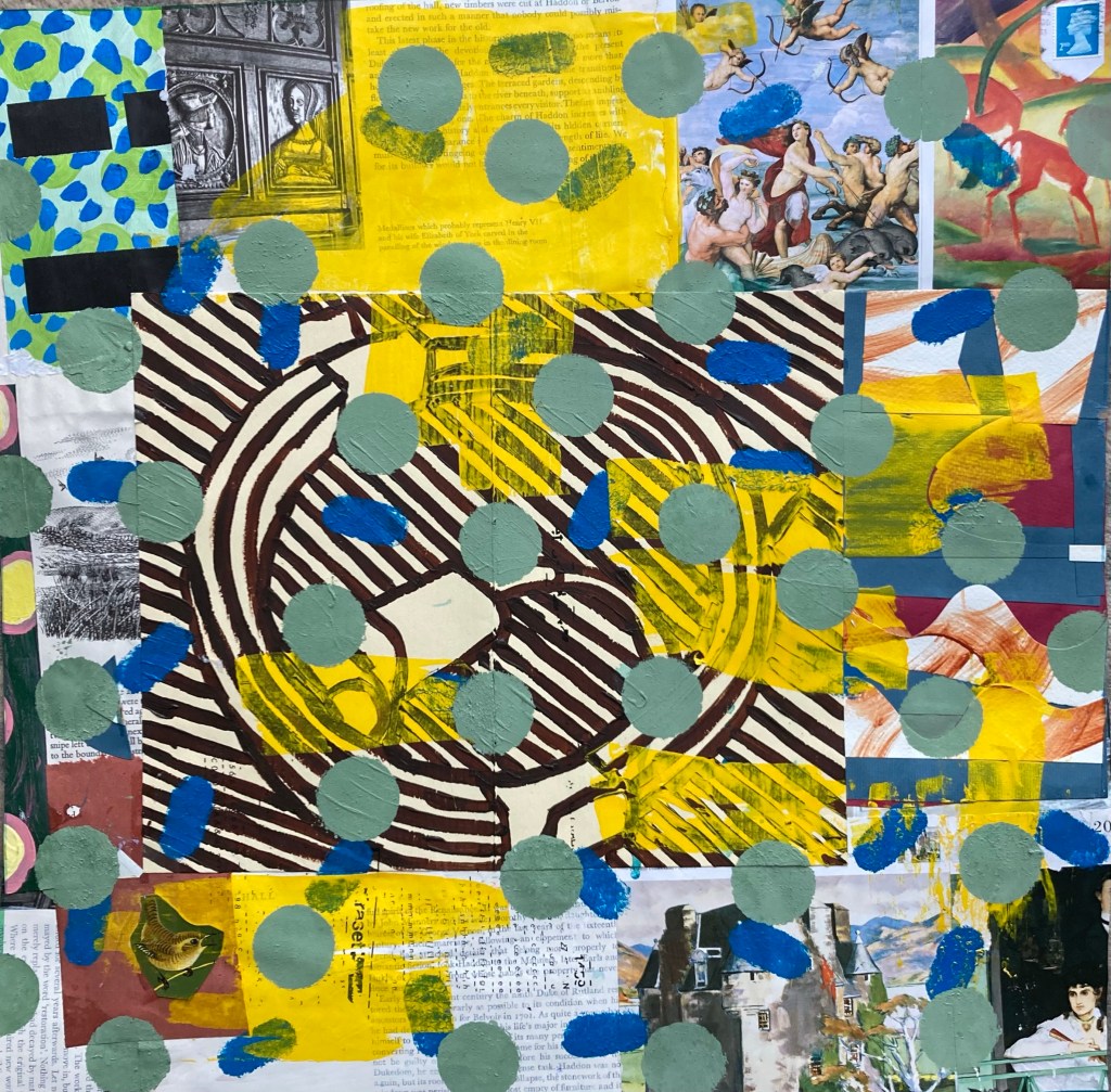 Acrylic paint on collaged paper patchwork with old drawings 48cm x 48cm