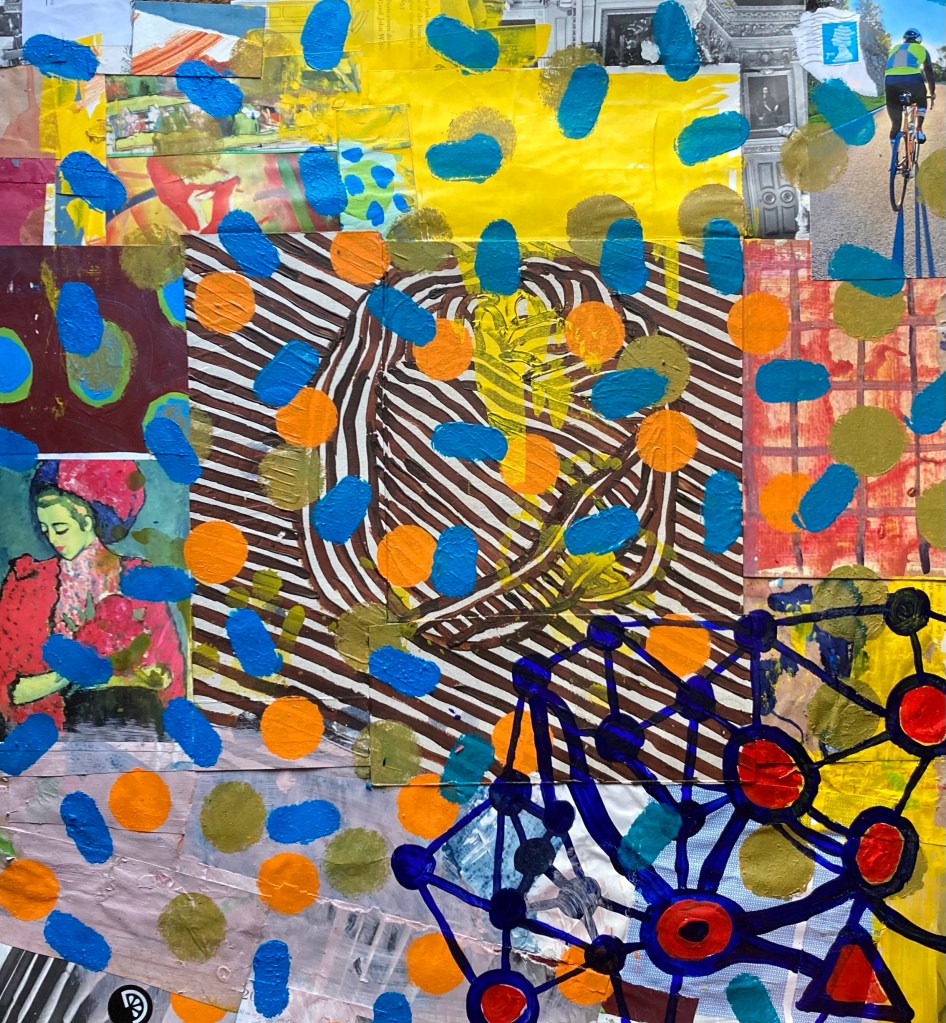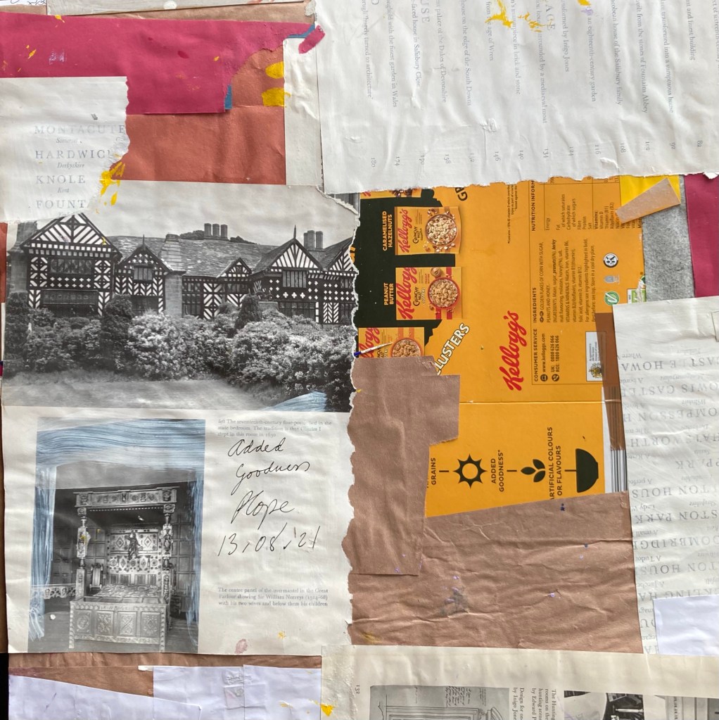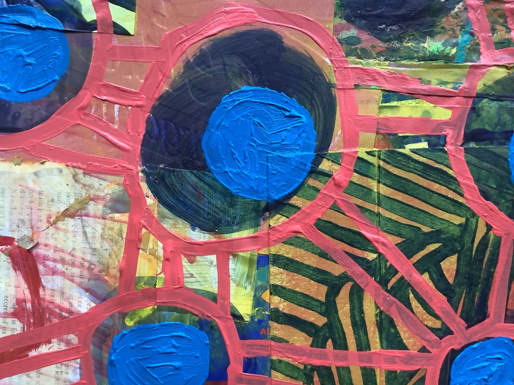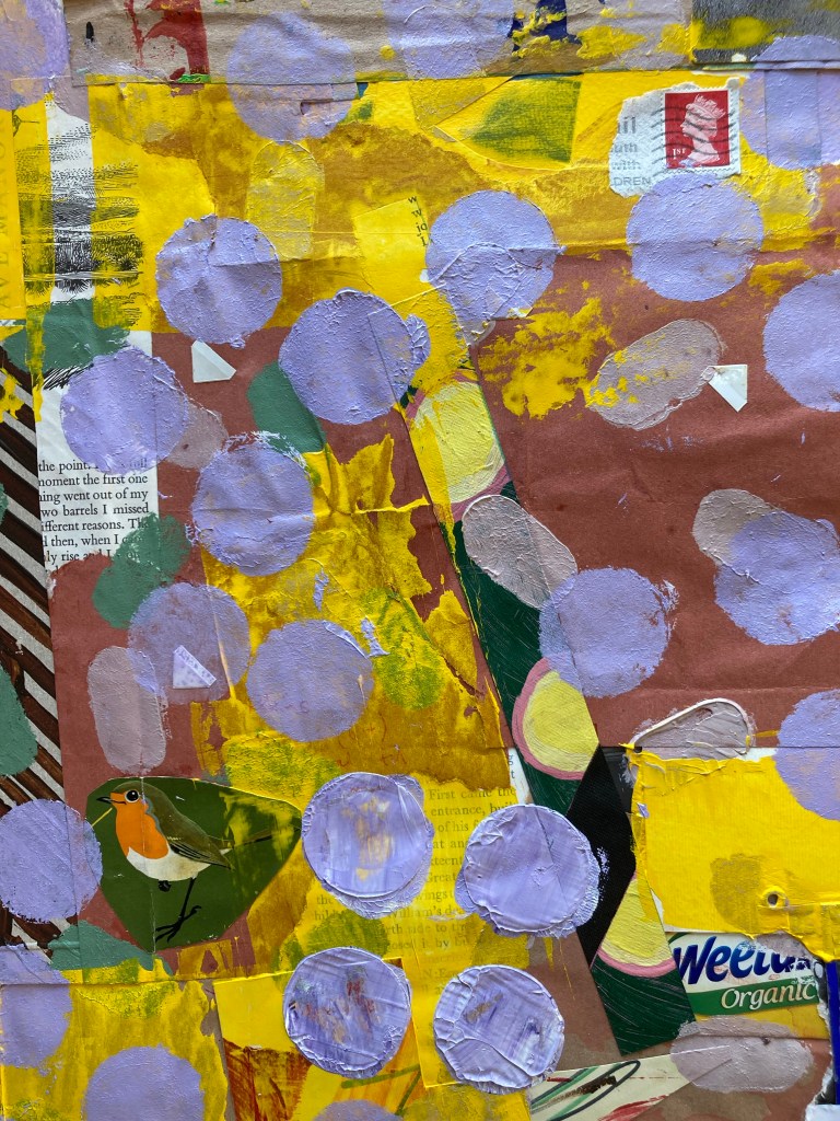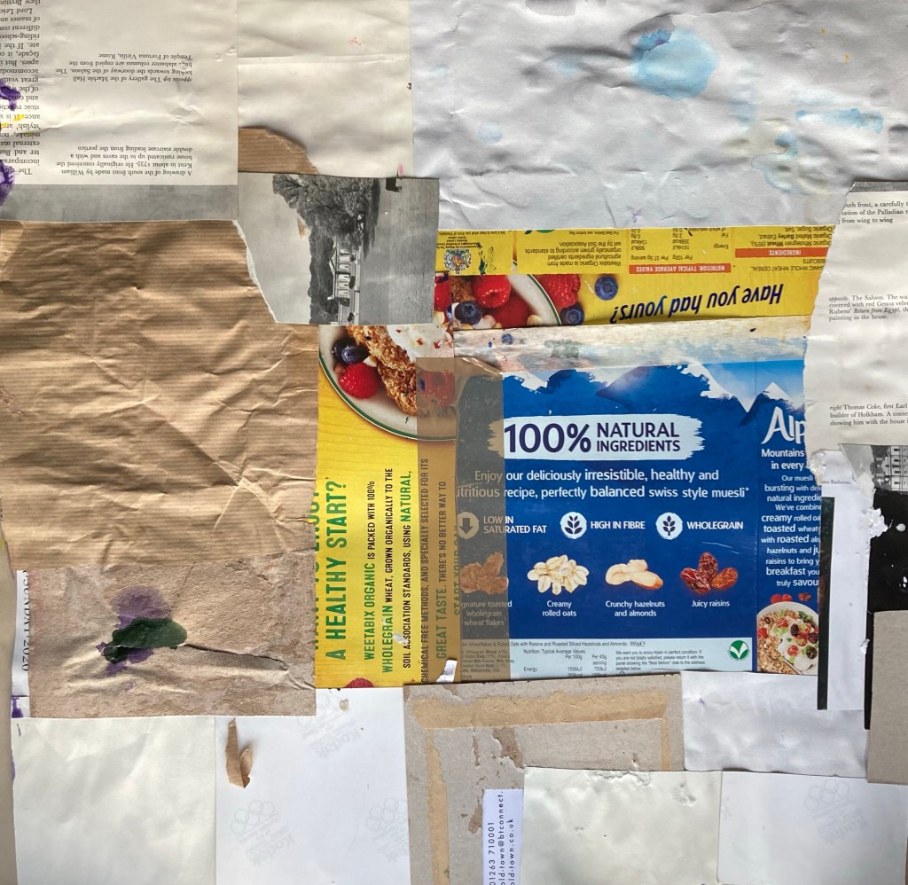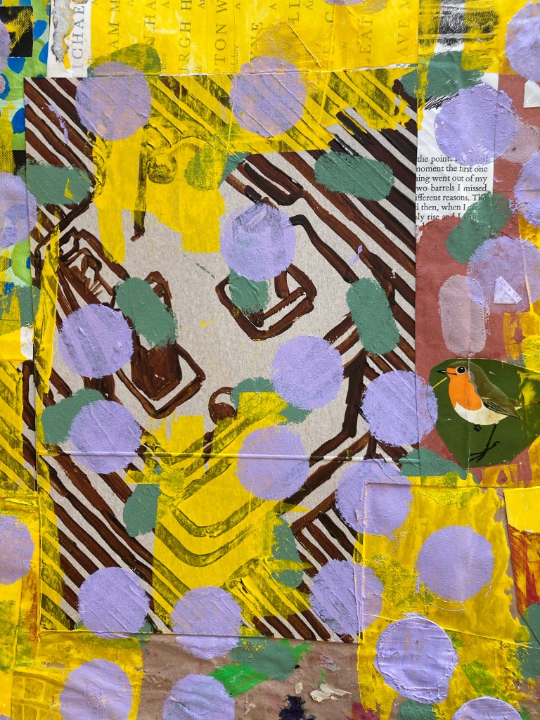 Acrylic paint on collaged paper patchwork with old drawings 48cm x 48cm