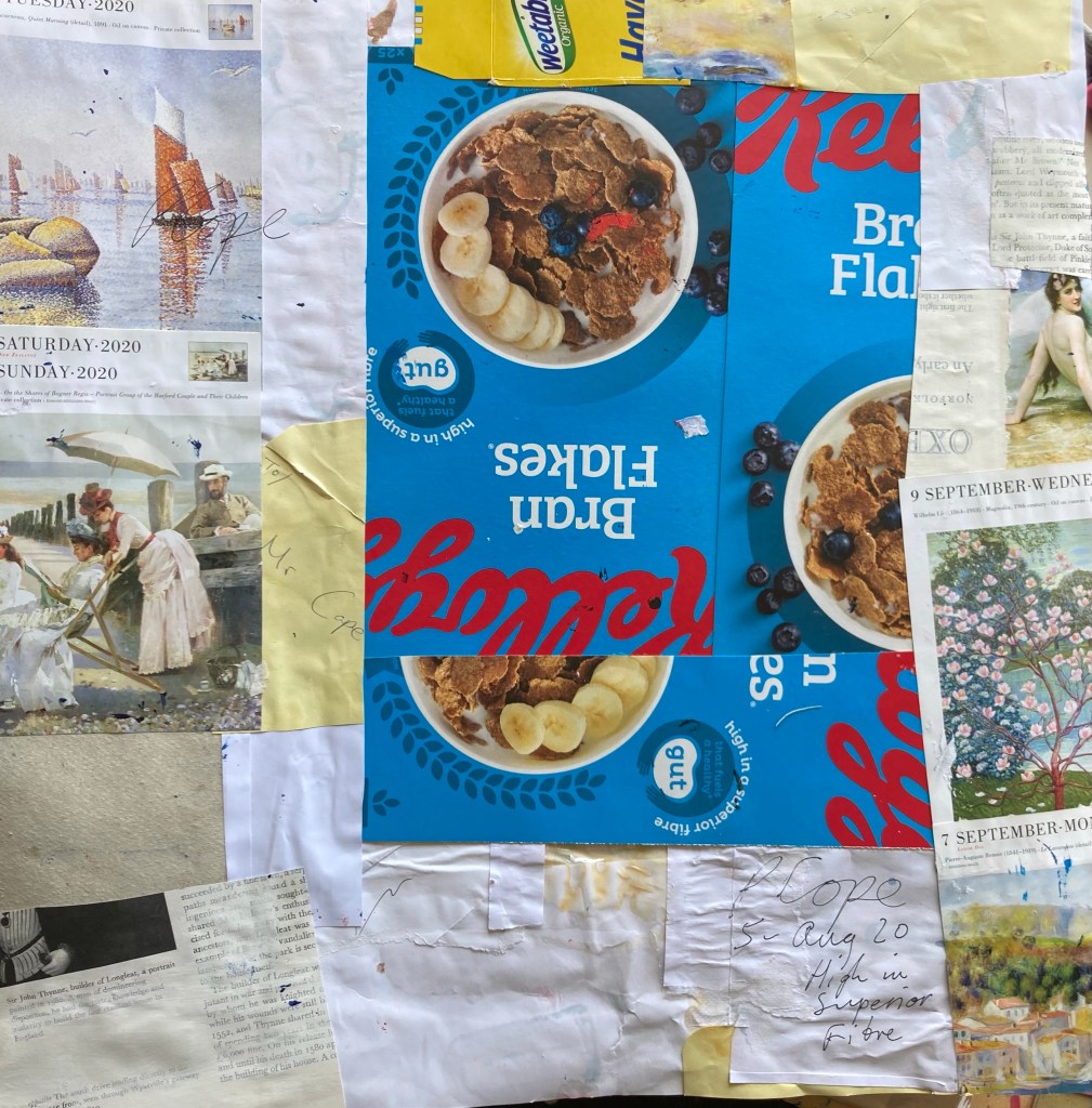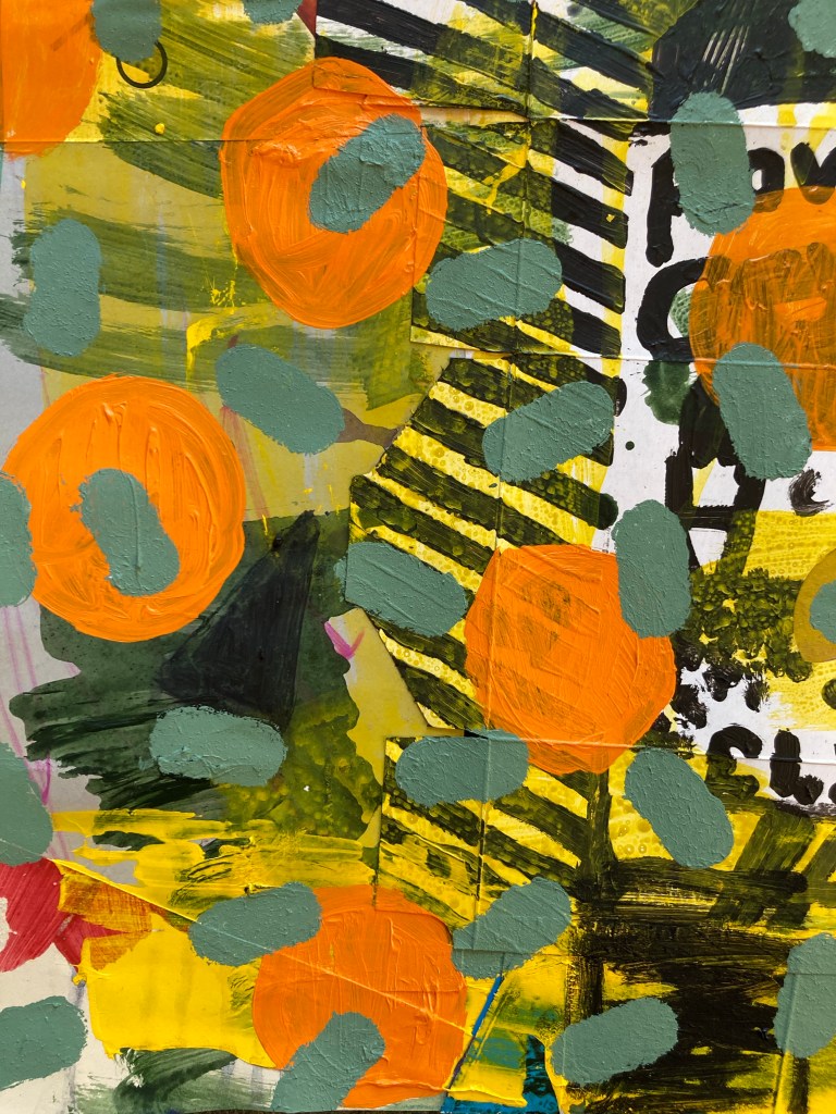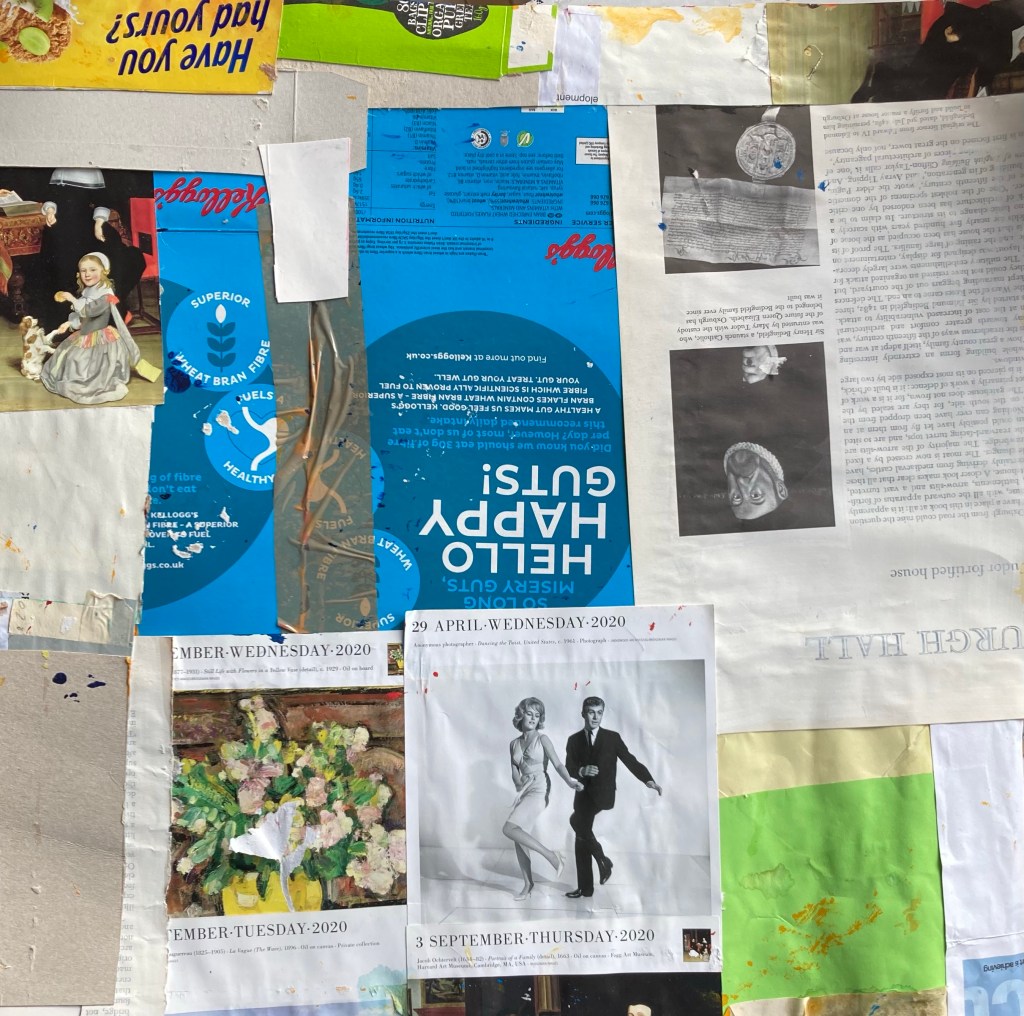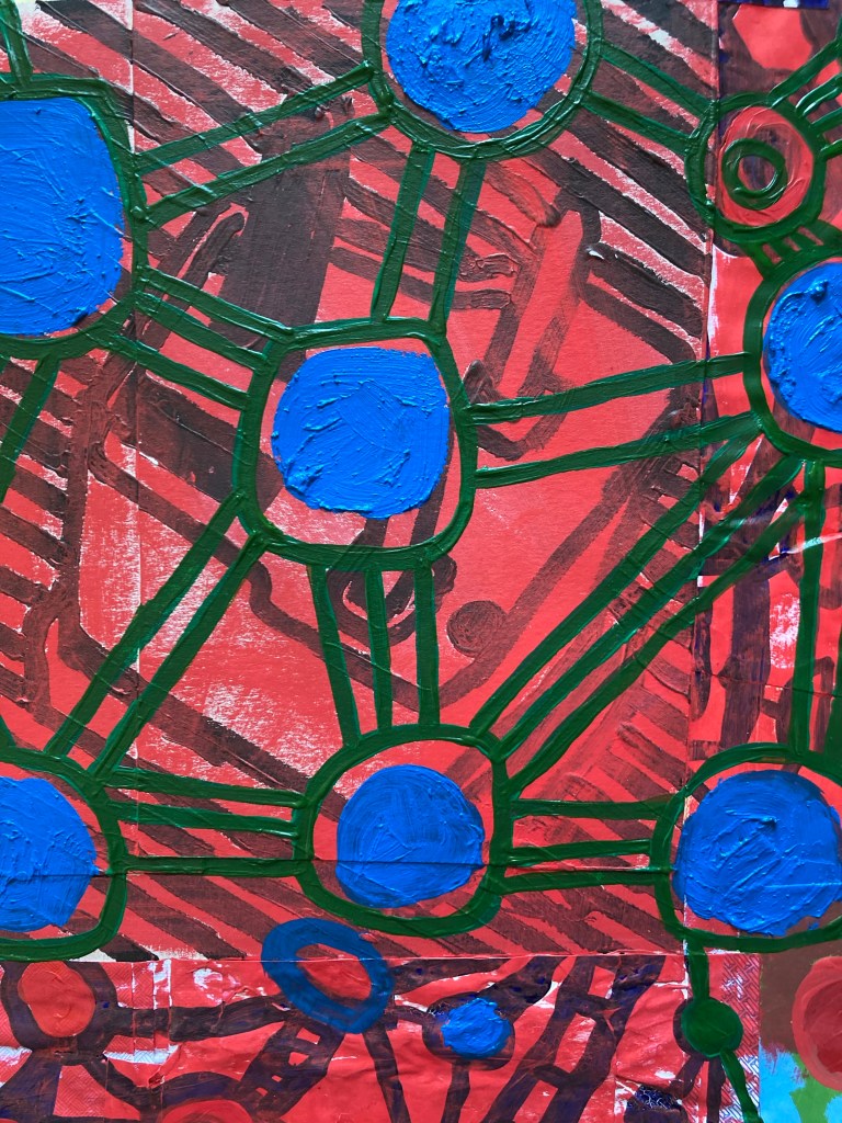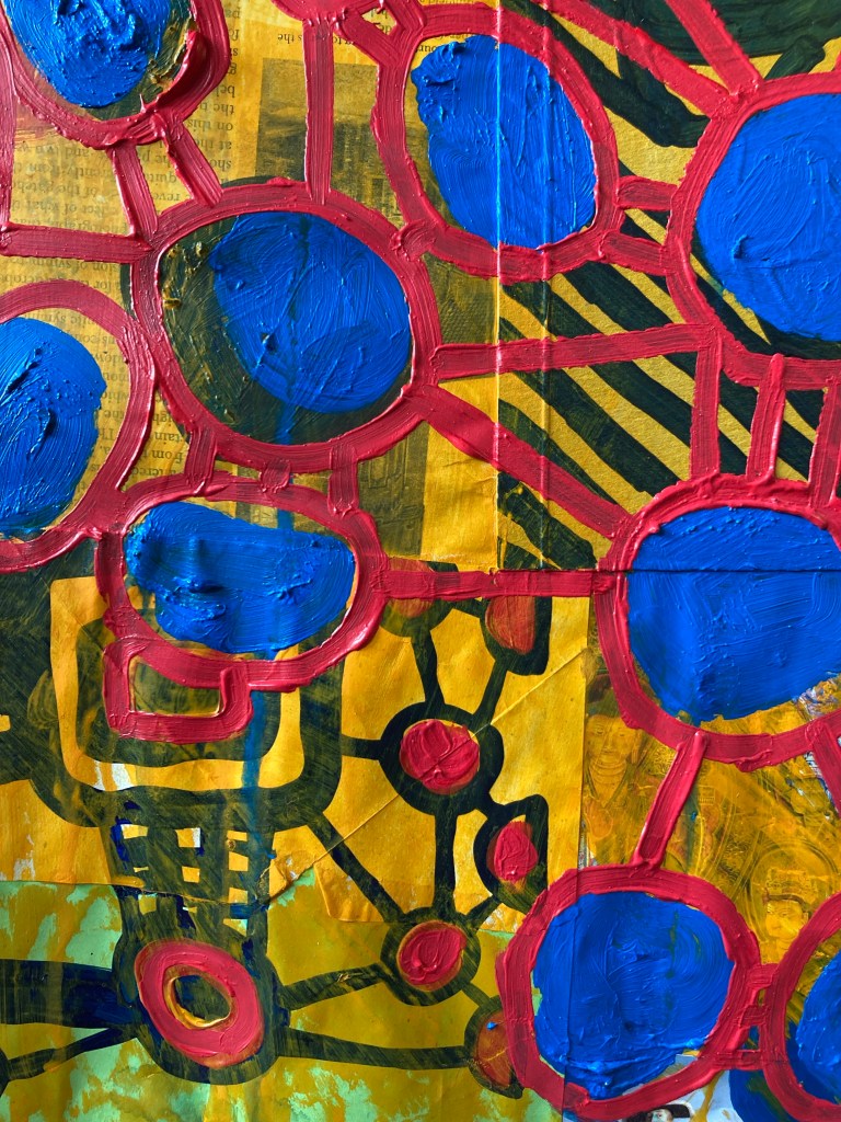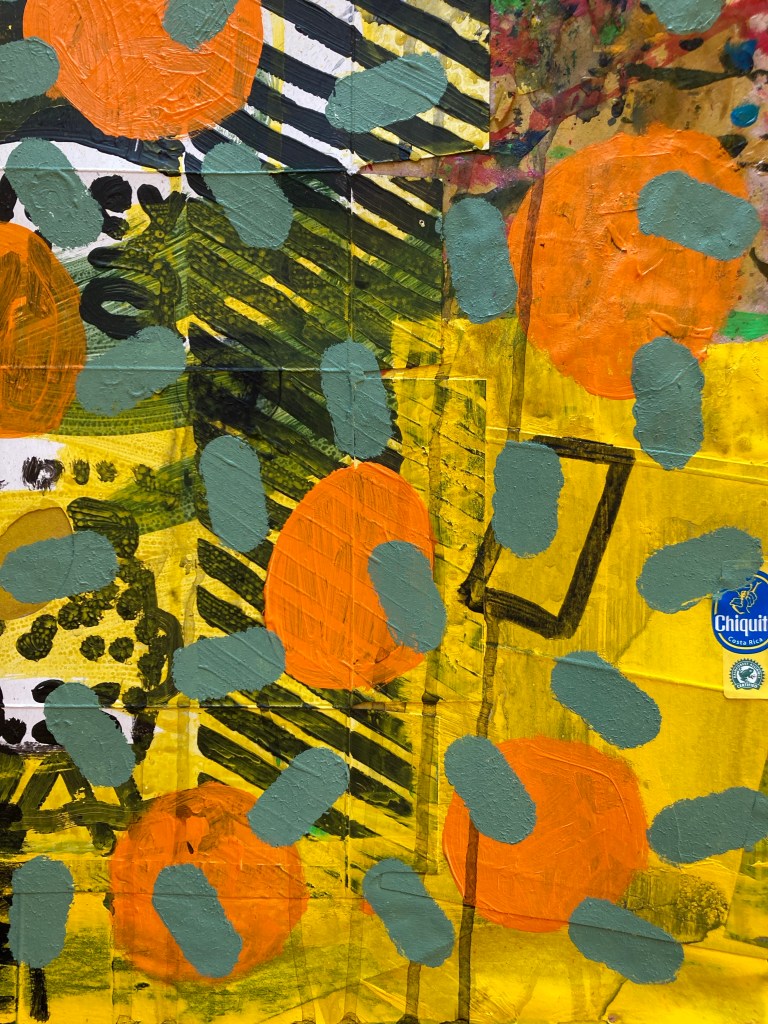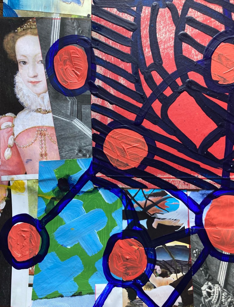 Acrylic paint on collaged paper patchwork with old drawings 48cm x 48cm