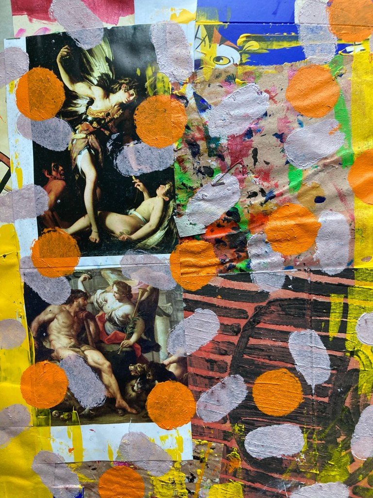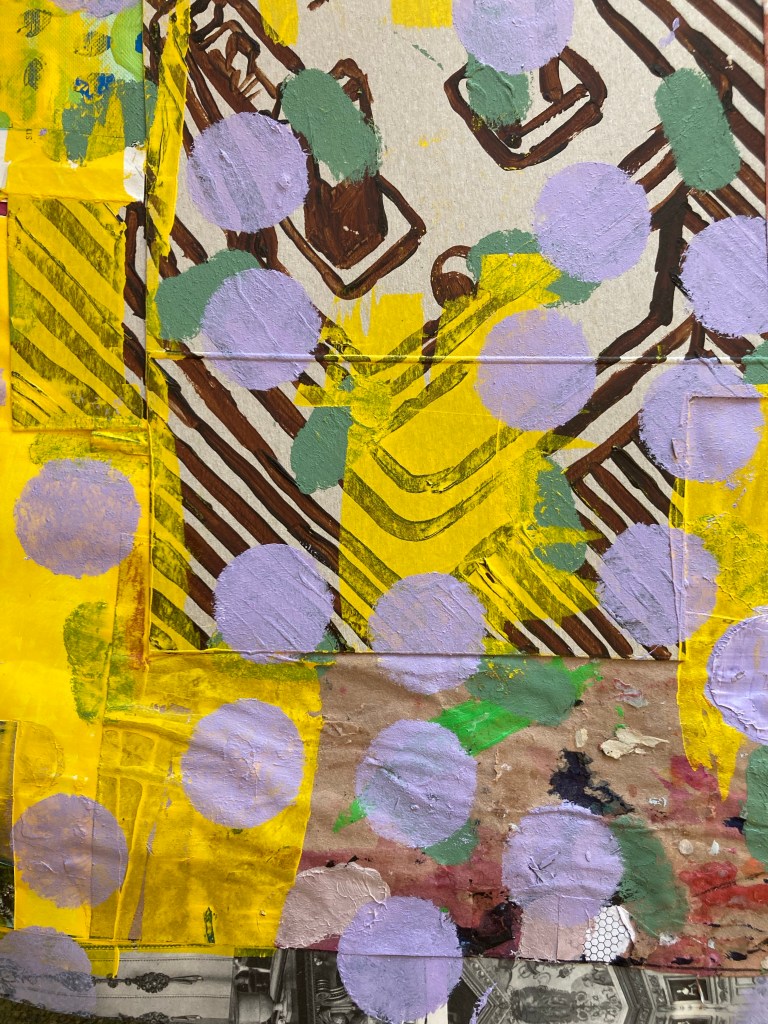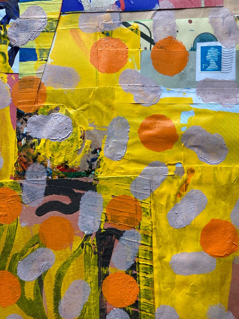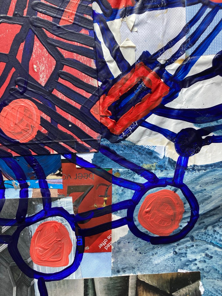 Acrylic paint on collaged paper patchwork with old drawings 48cm x48cm