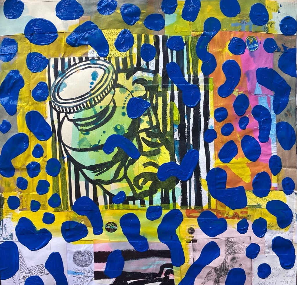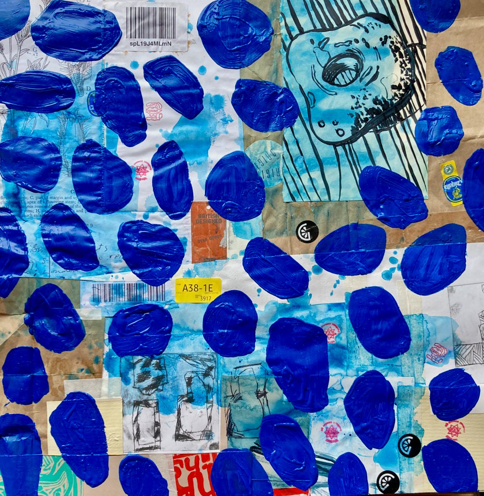 Acrylic paint, lacquer and inks with collage on 50cm x 50 cm paper