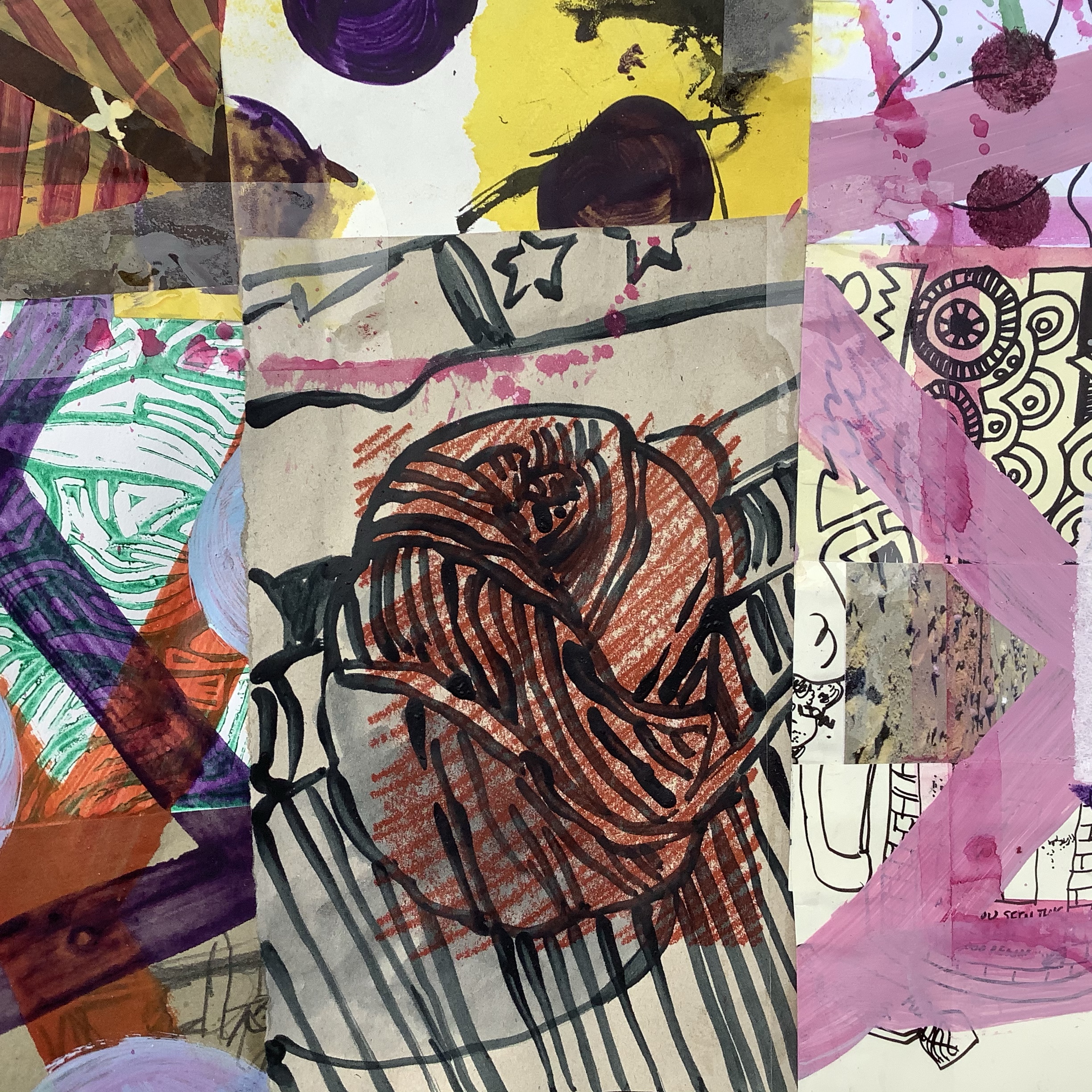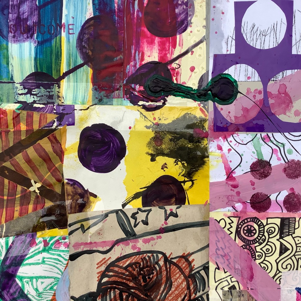 Acrylic paint on paper patchwork with old collage, drawing and painting 48cm x 48cm