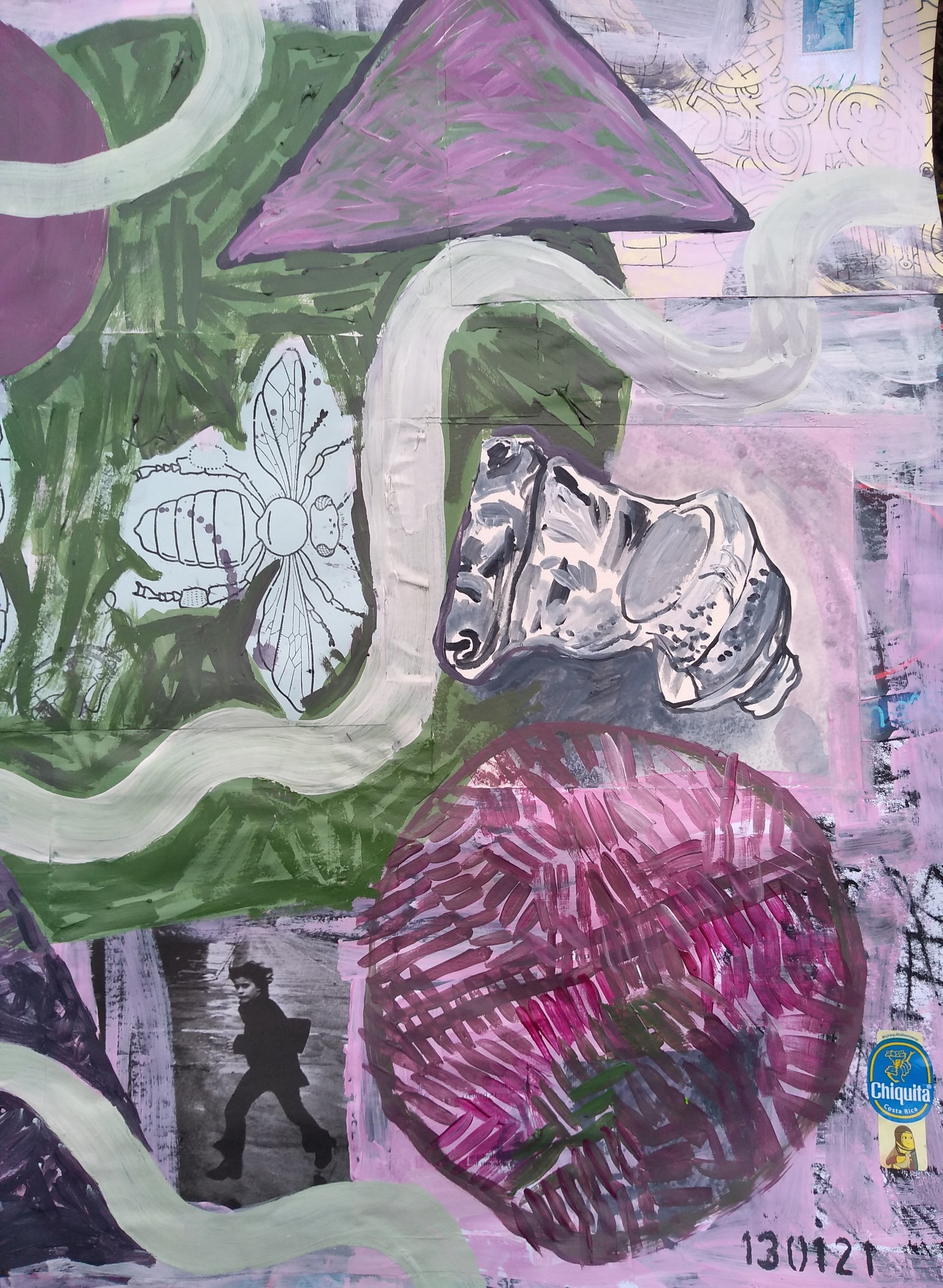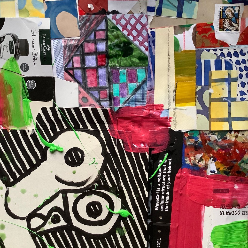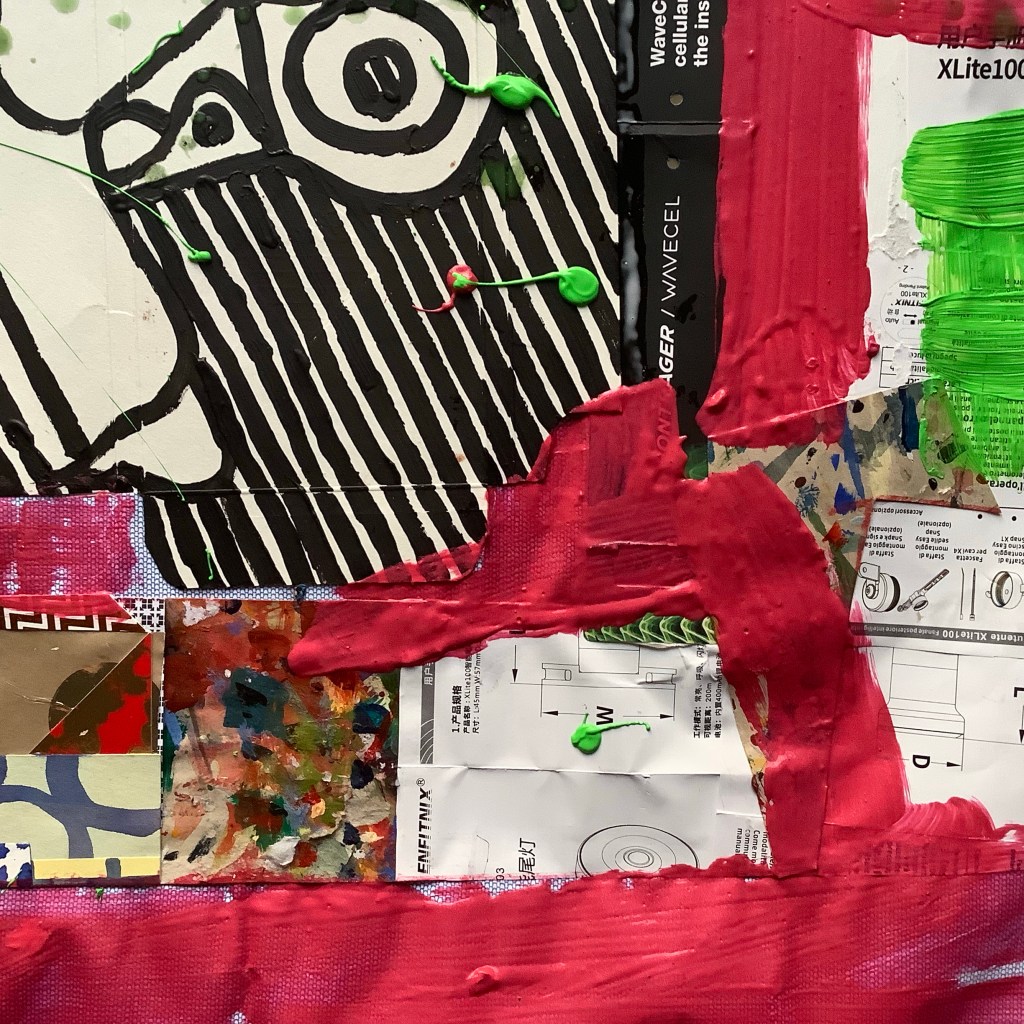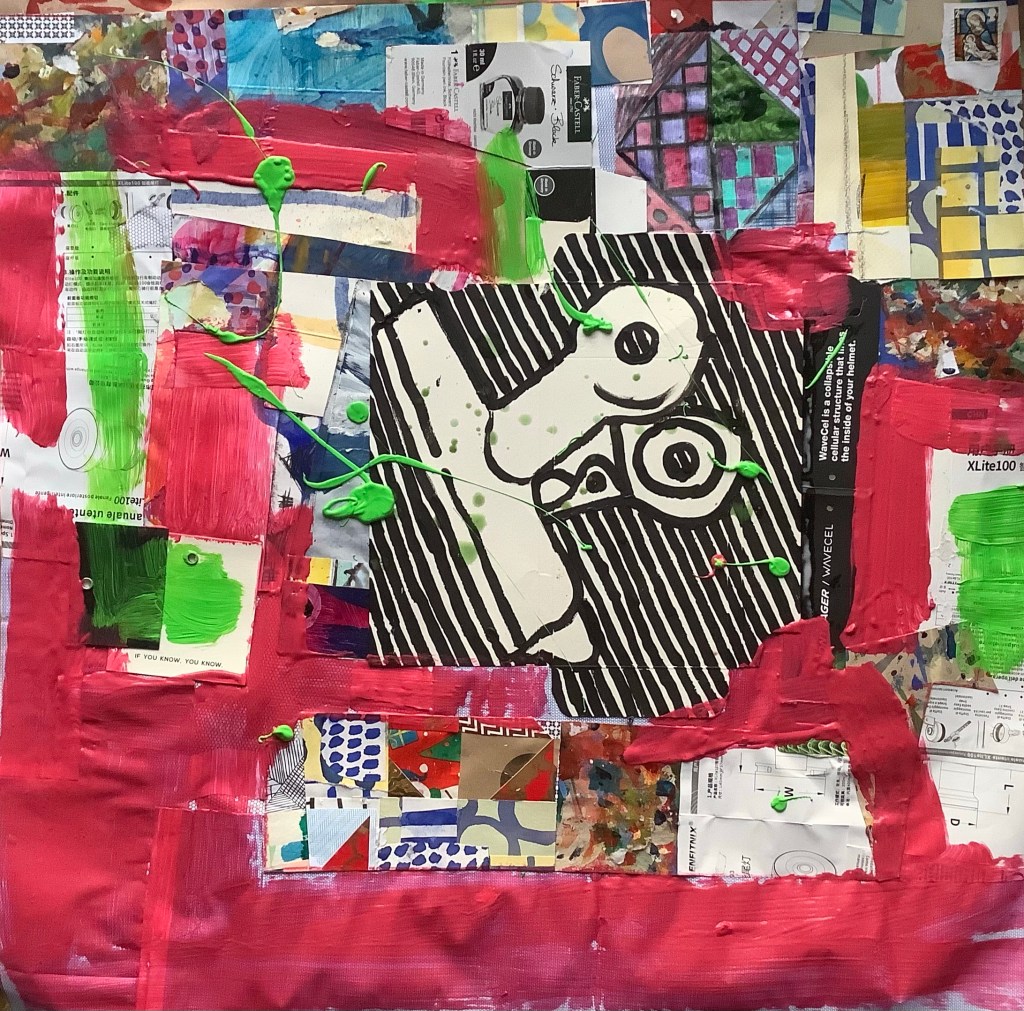 Acrylic paint on collaged paper patchwork with old drawings 48cm x48cm