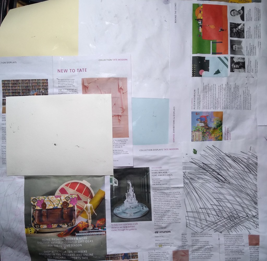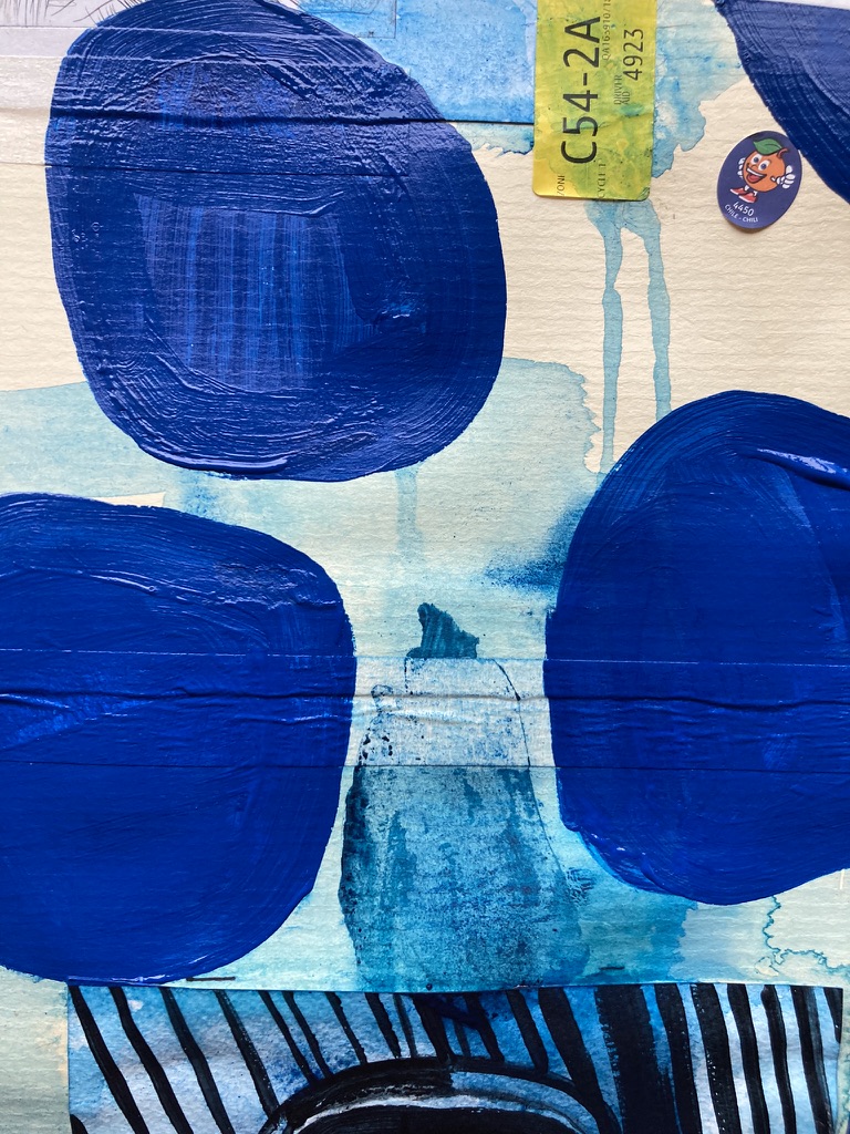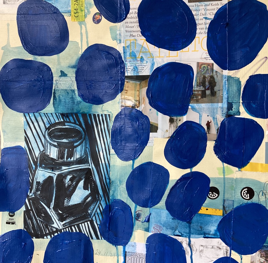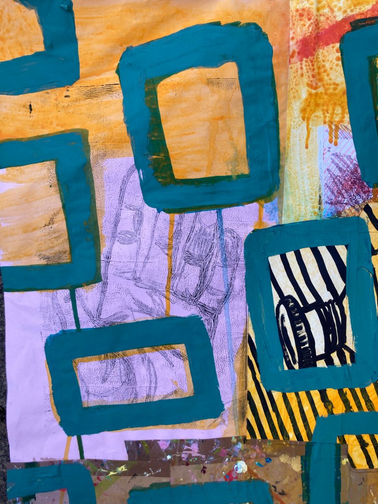 Acrylic paint on collaged paper patchwork with old drawings 48cm x48cm