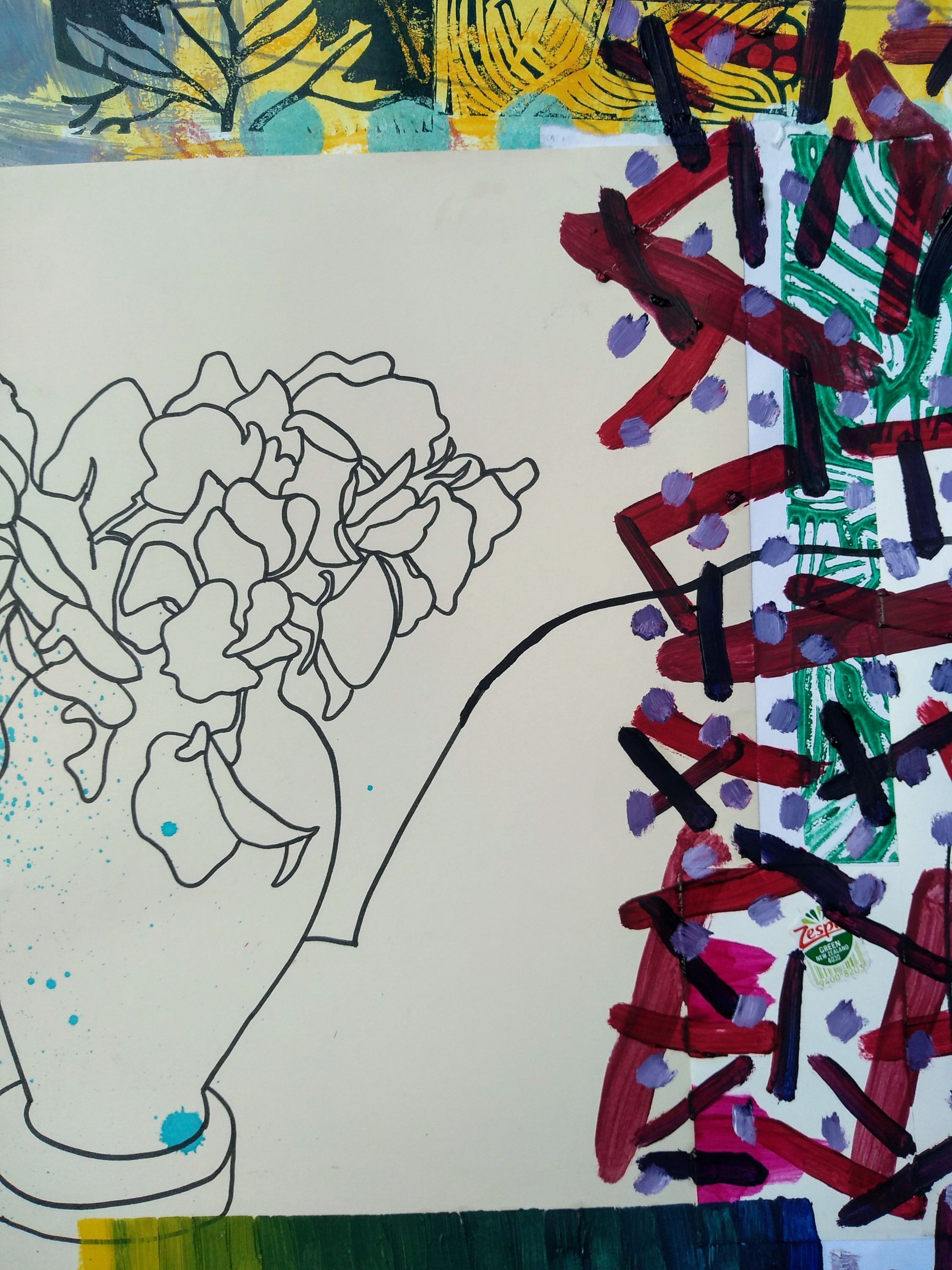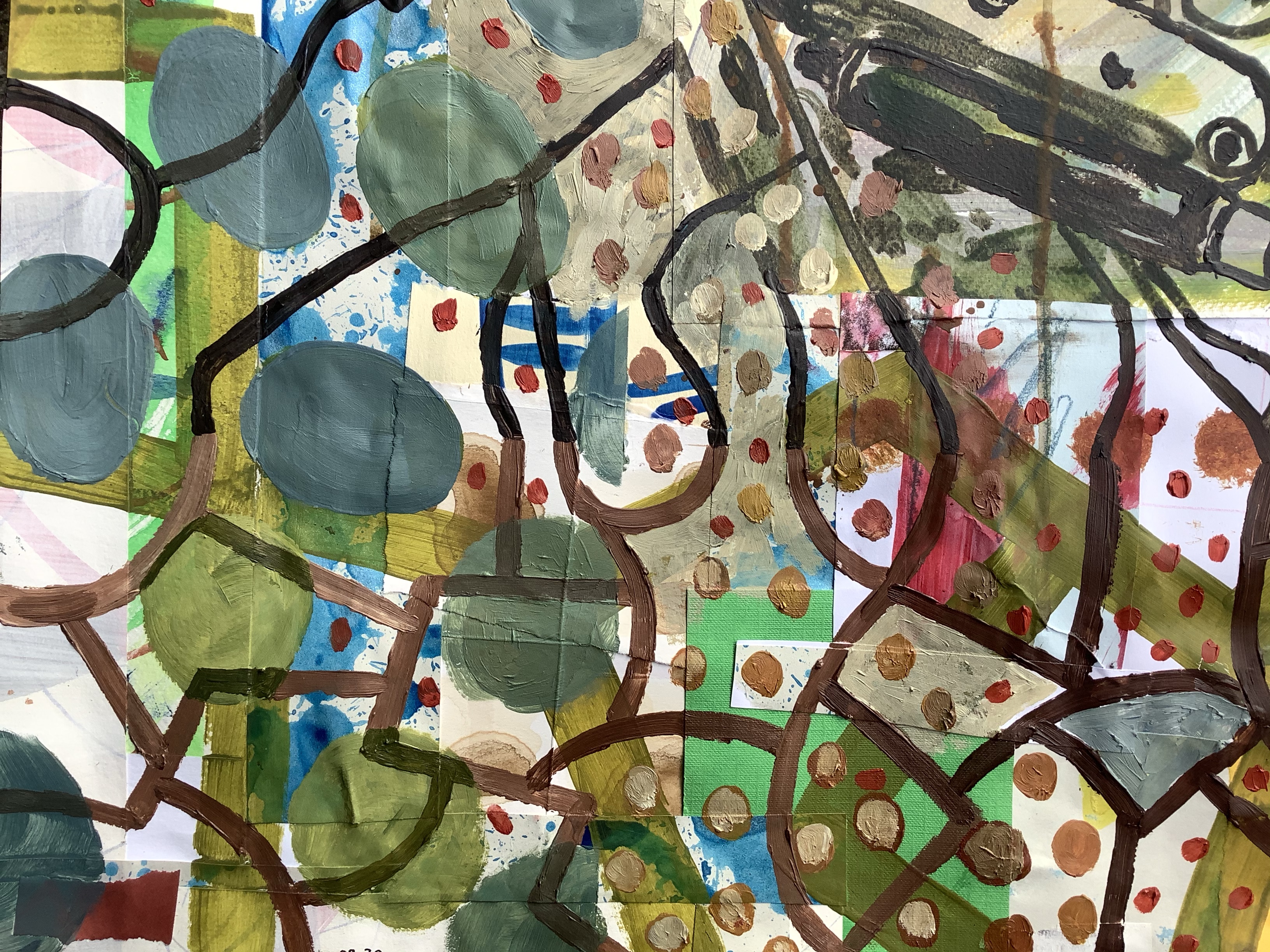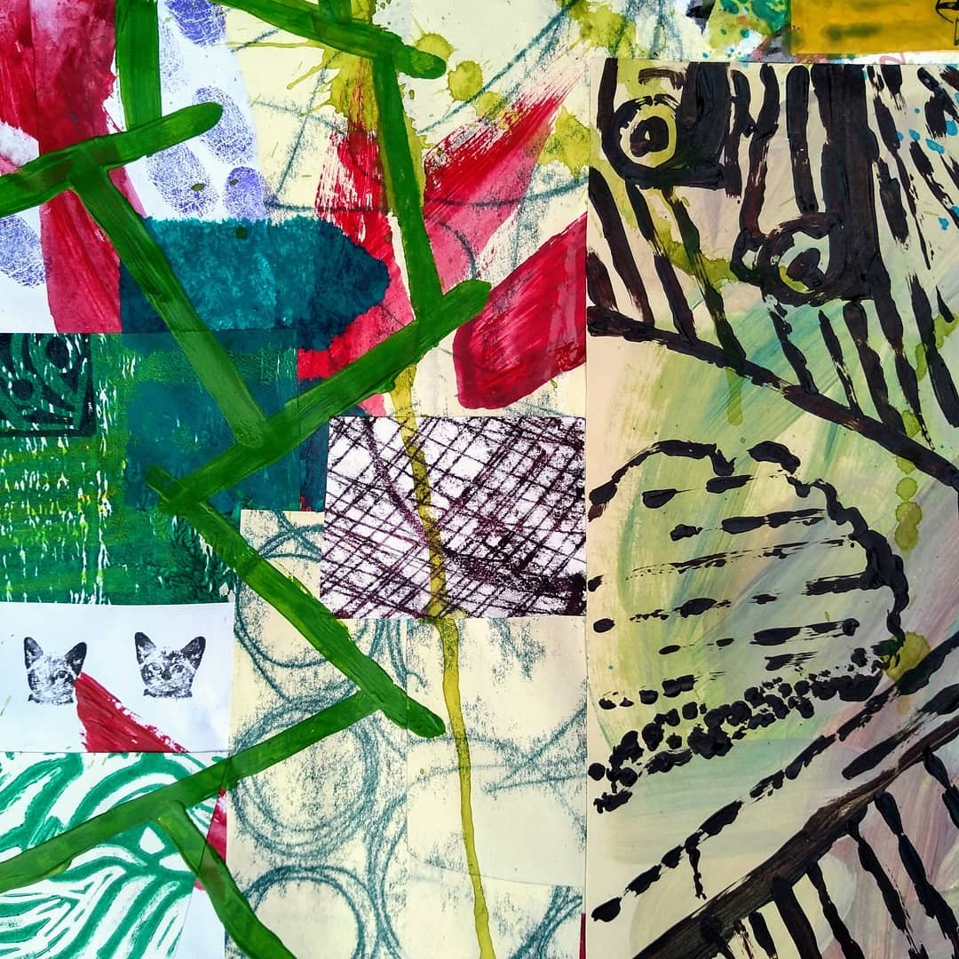 Playing with water soluble oil paints. The colour mixing down the side is an art room thing they won’t be doing for a while in school, I think. But homage to what I used to do. Layering, messing up the marks. There are relief print marks, monoprint, and fingerprints in these, at least.