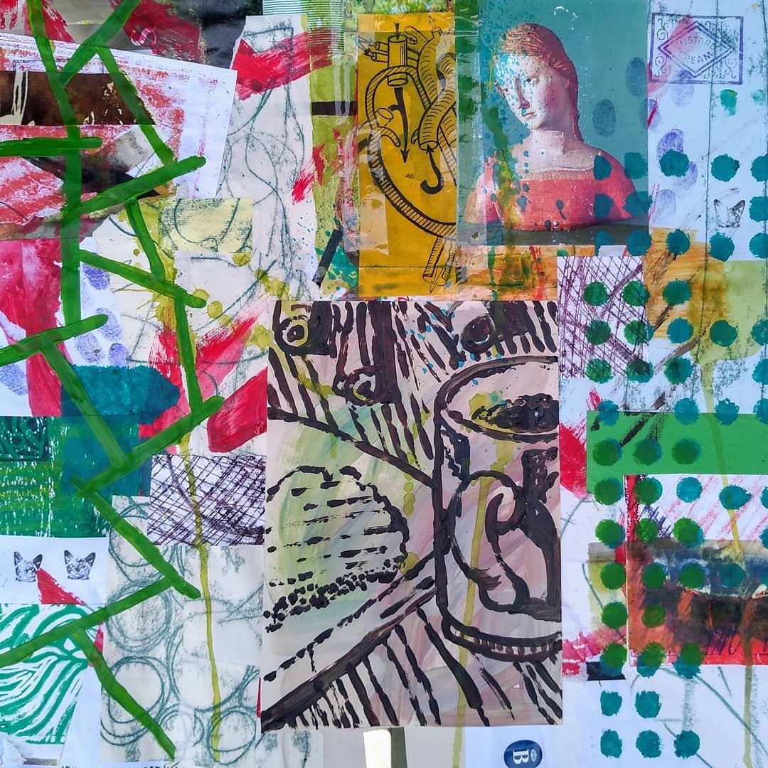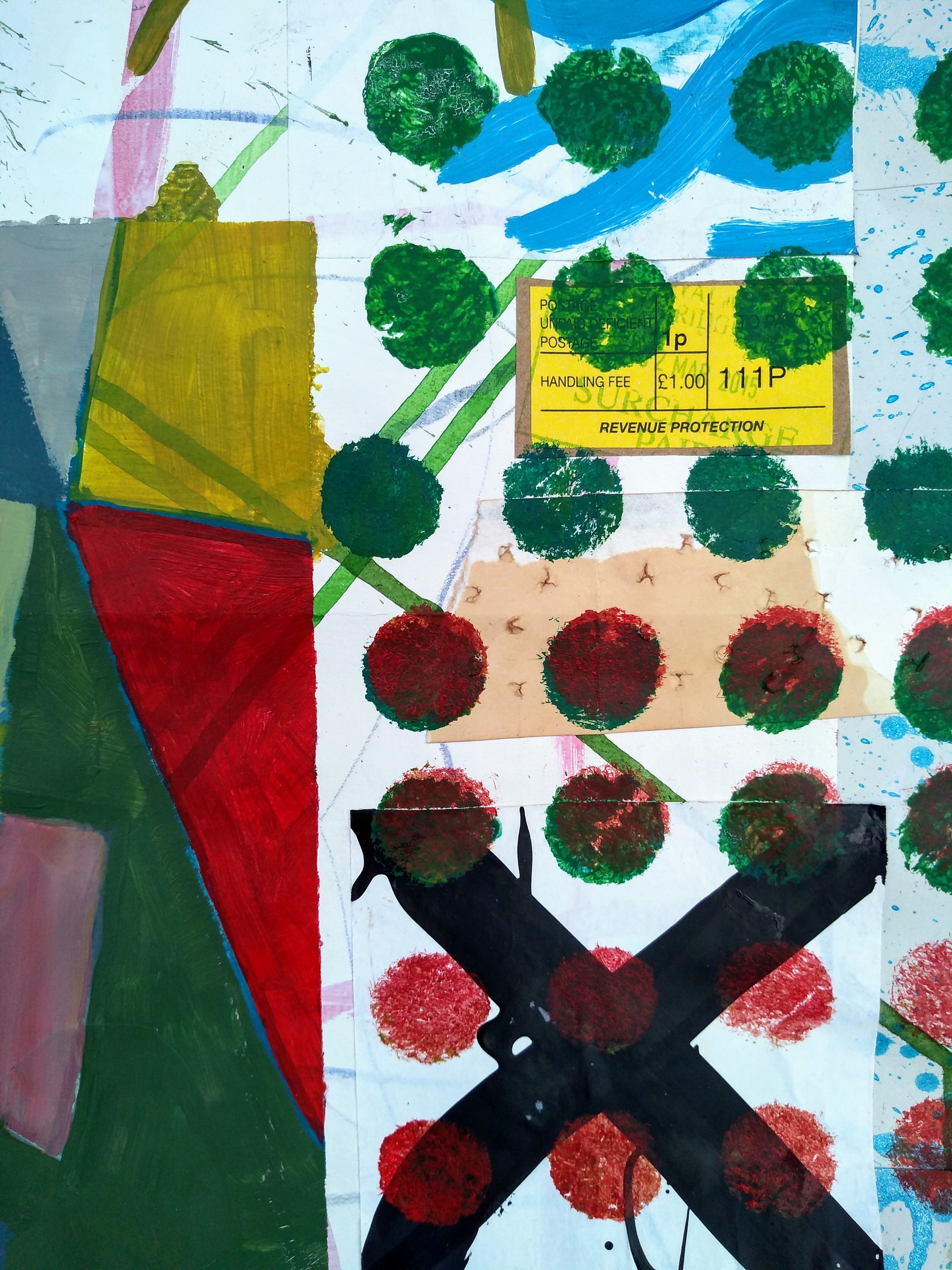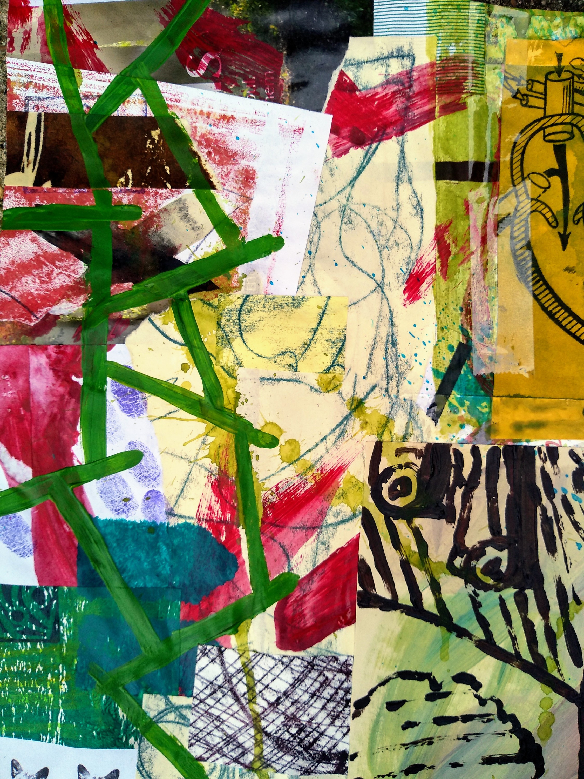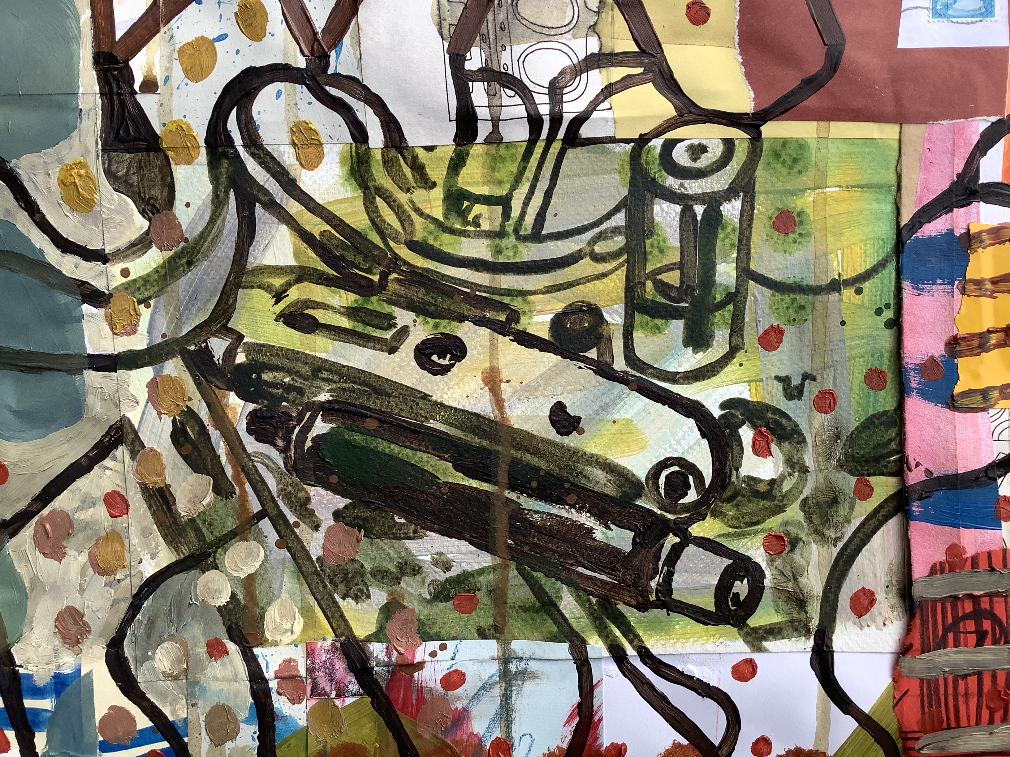 Collage and paint on a patchwork of old drawings and other bits and pieces.