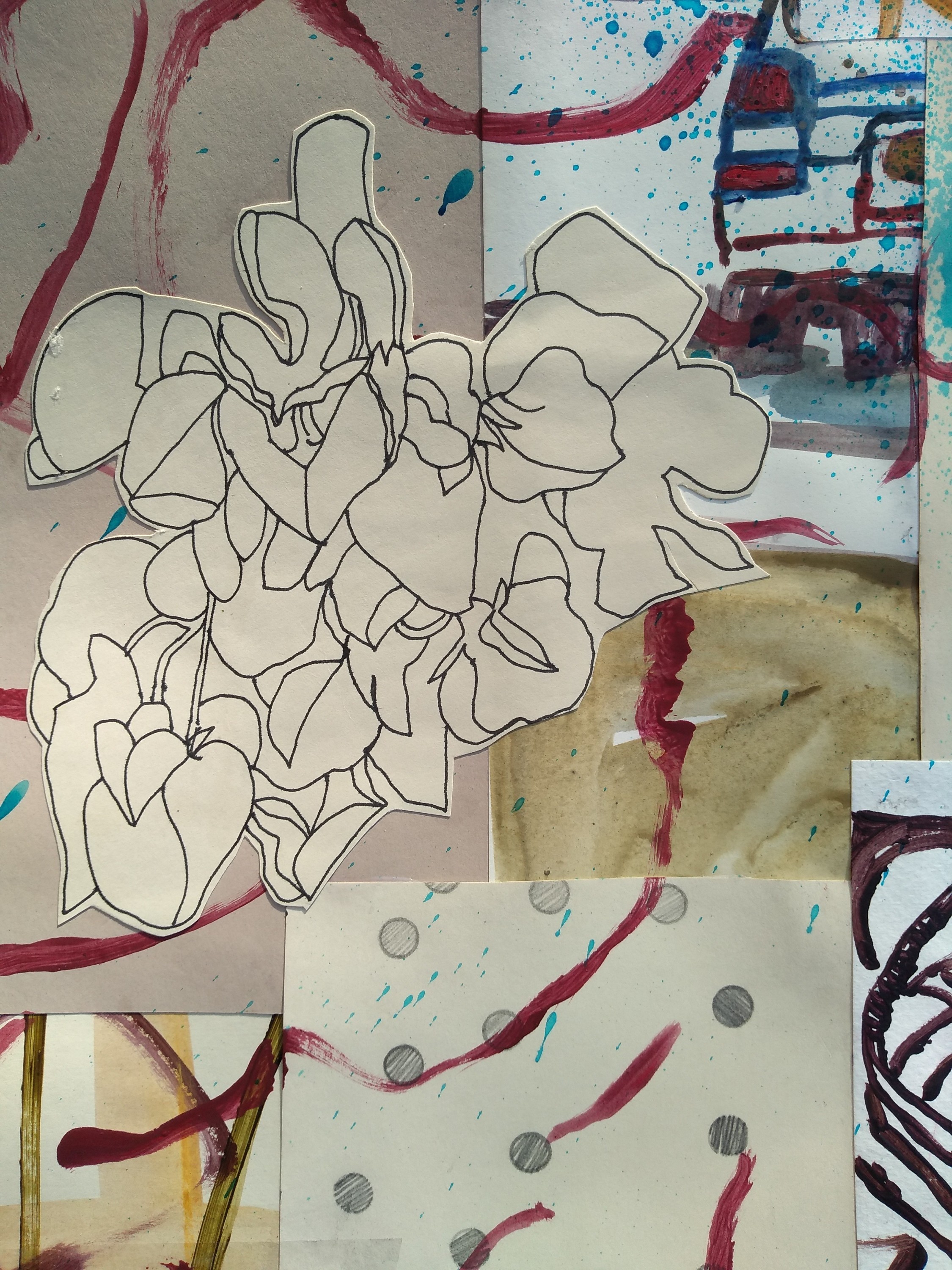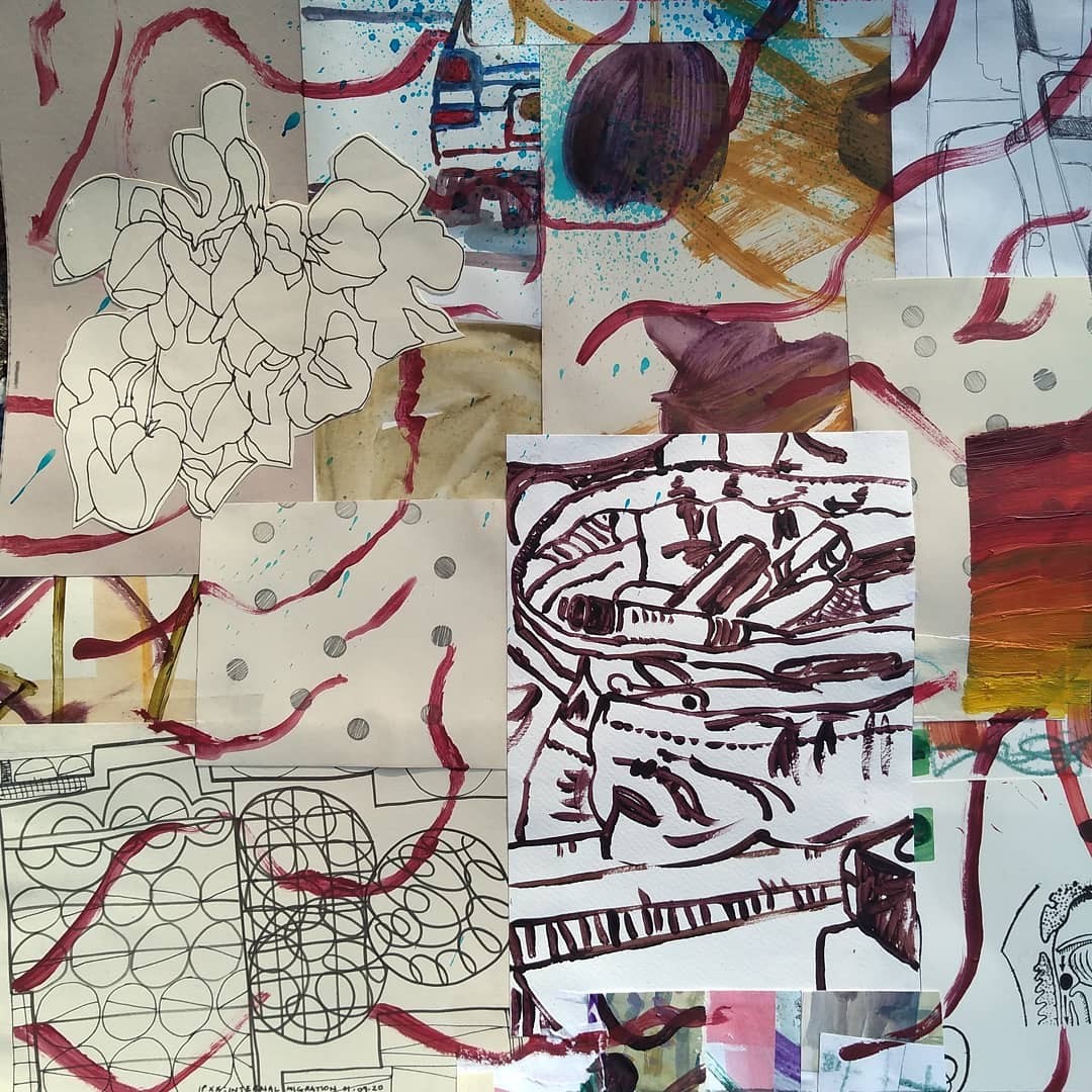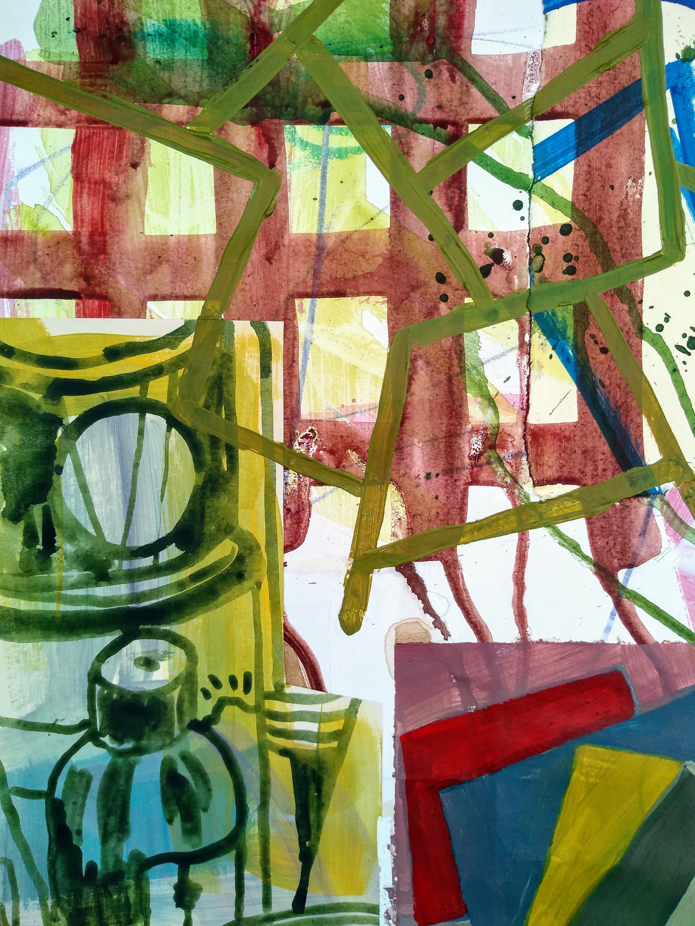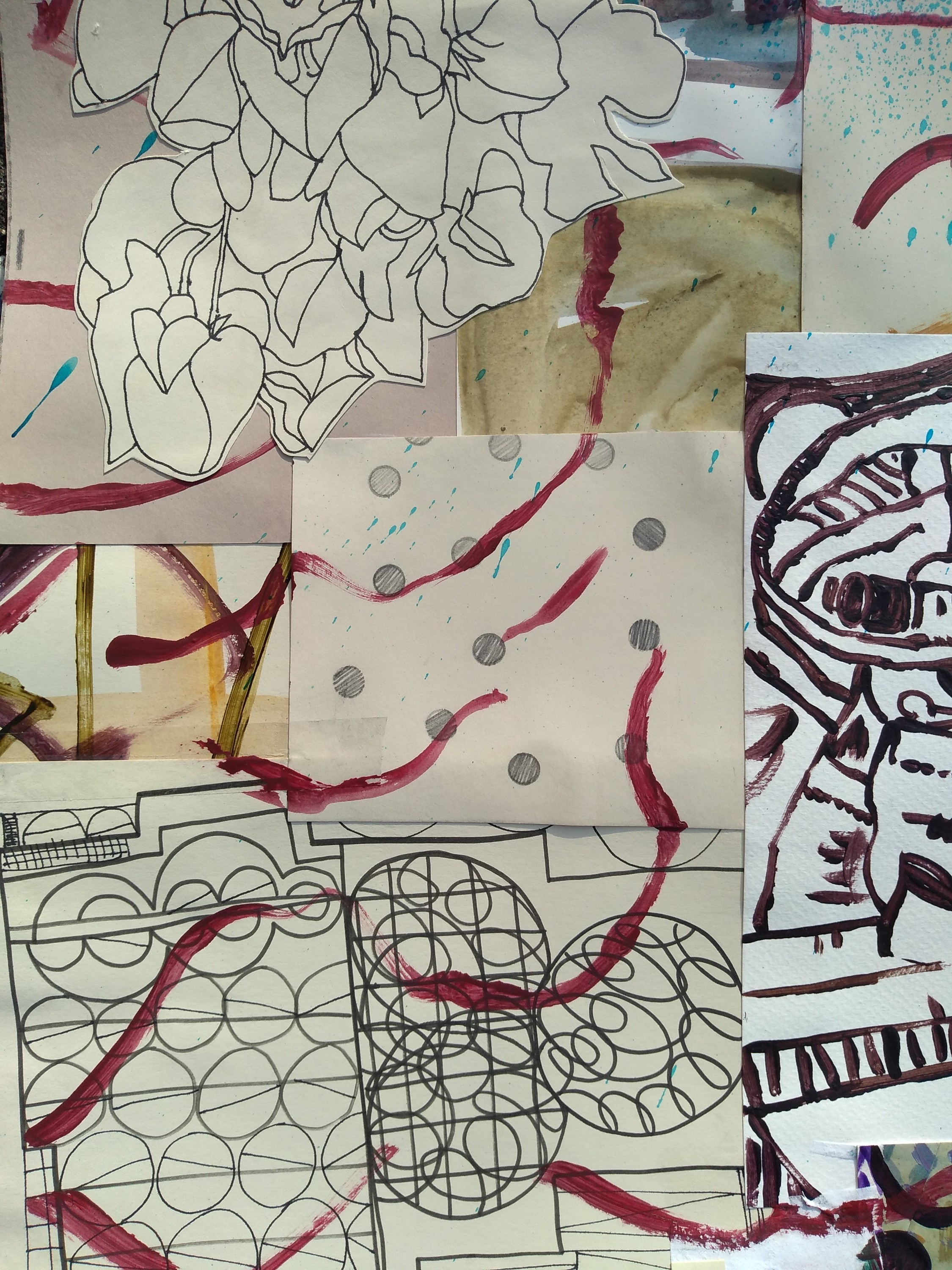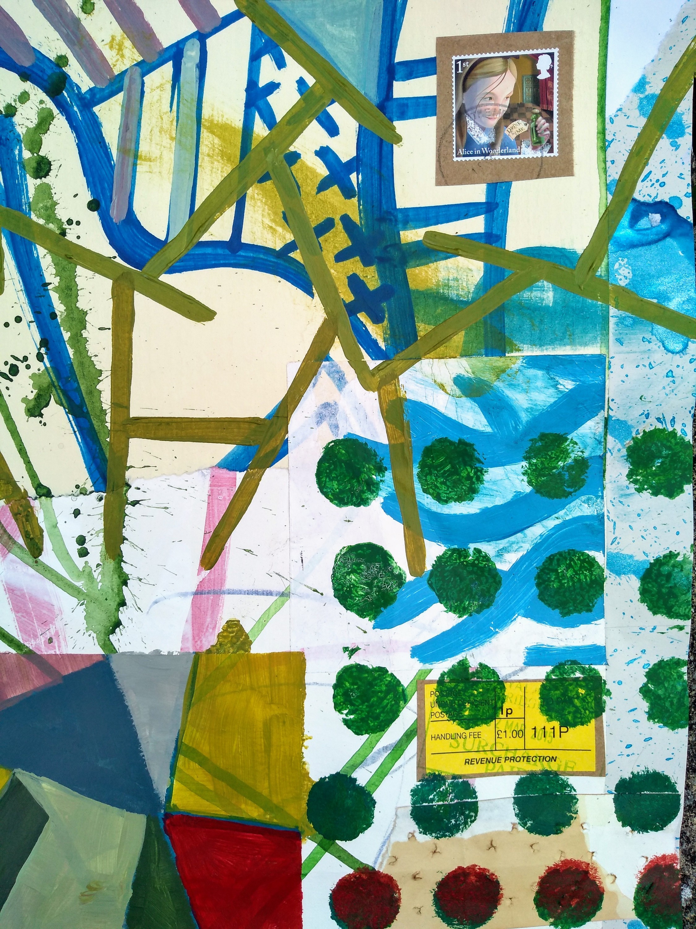 Collage and paint on a patchwork of old drawings and other bits and pieces.