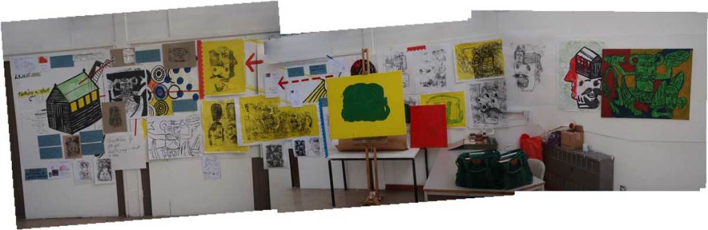 What I want to do is use the wall as a sketchbook/accumulator and work it over and over and see what happens. I need to bring some ideas into my head, I need some stimulus after the break and after using all of my head up on the plates; very focussed stuff. It is receding into the past though, which was the idea to make the plates so that they were connected to the school forever and not transferable in some ways. We’ll see. I could get fed up with painting and want to go back to ceramics in a bit.