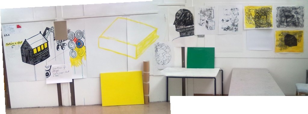 Second day on the big wall drawing. What did I do? I put up some more card and took some of the drawing down from yesterday. I painted two pieces of paper with yellow acrylic. I painted a canvas out with yellow acrylic. I painted a big book on the card with yellow acrylic. I added some bits here and there with yellow acrylic. I rolled out some water based ink on a piece of perspex and I made five mono-prints fairly rapidly. I made two of these onto the primed yellow papers.