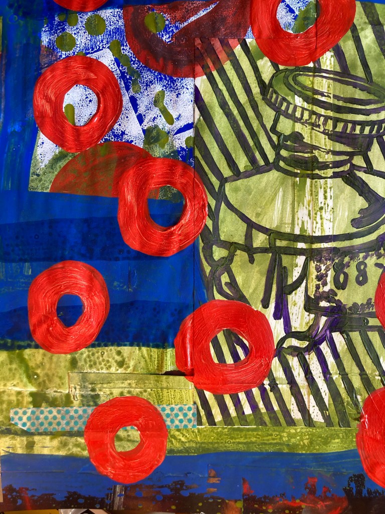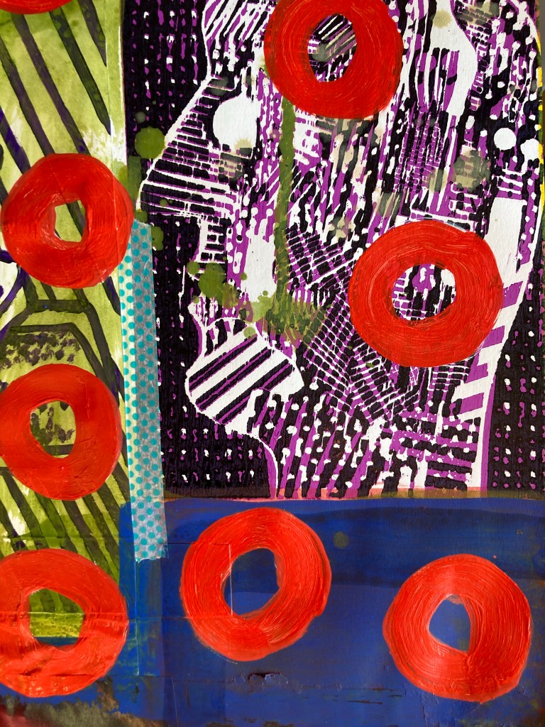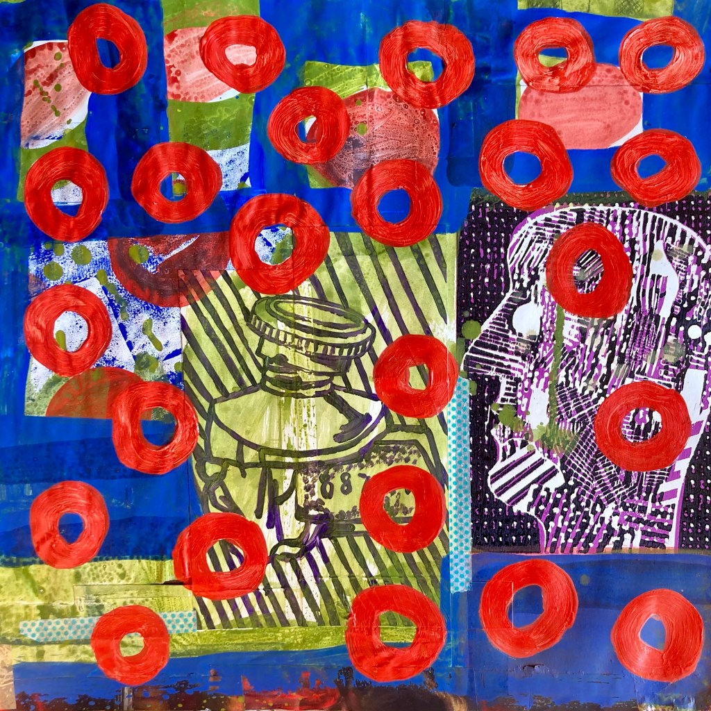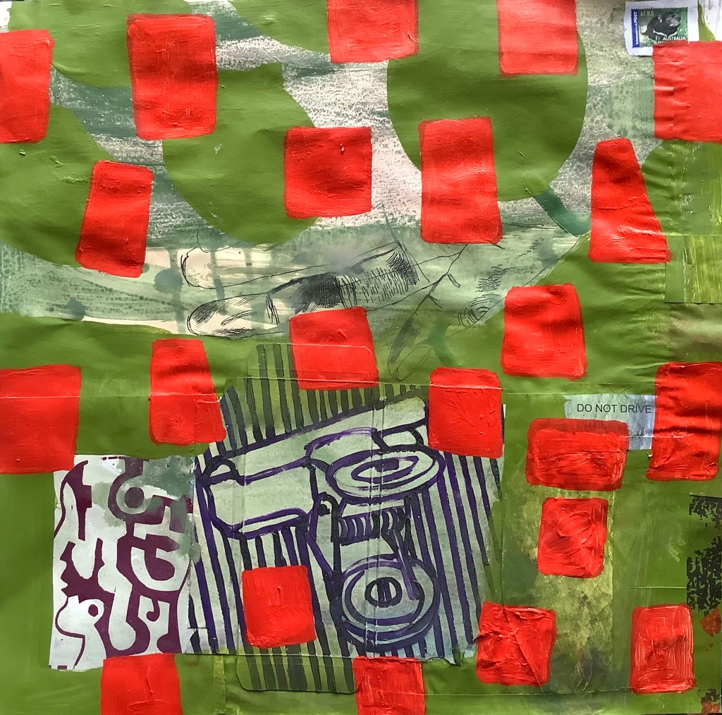 Acrylic paint on collaged paper patchwork with monoprint and relief prints 48cm x 48cm