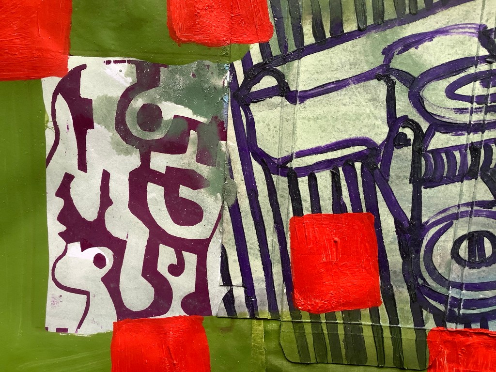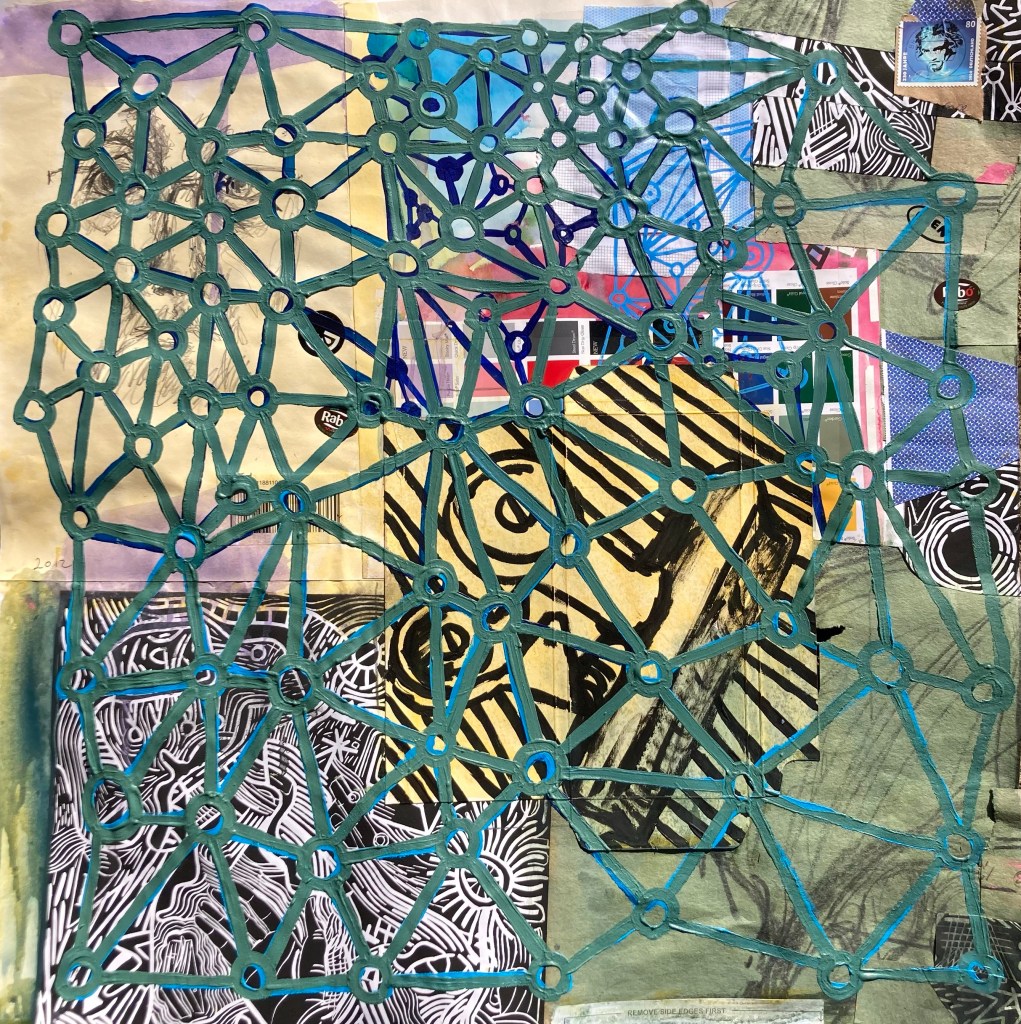 Acrylic paint on collaged paper patchwork with monoprint, relief print and old drawing 48cm x 48cm