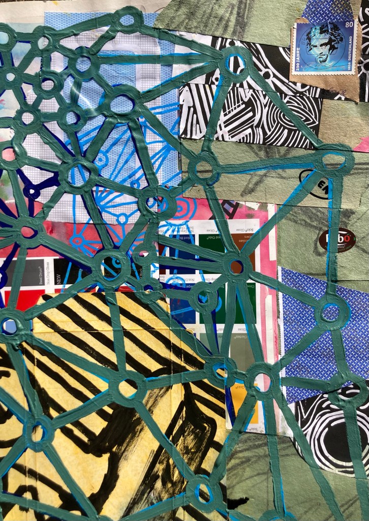 Acrylic paint on collaged paper patchwork with old drawings, collage and relief print 48cm x 48cm