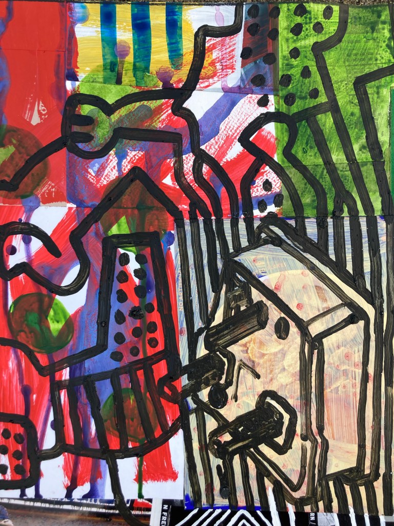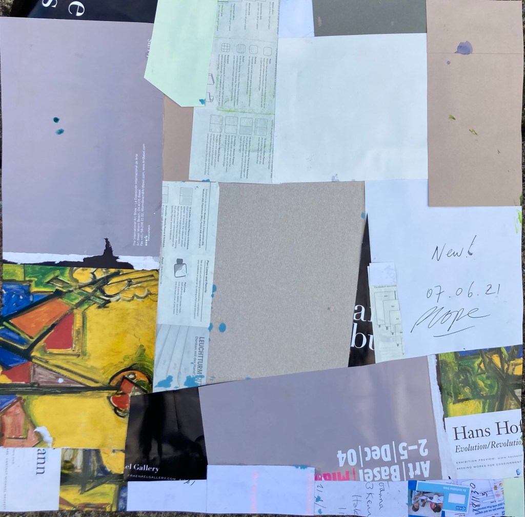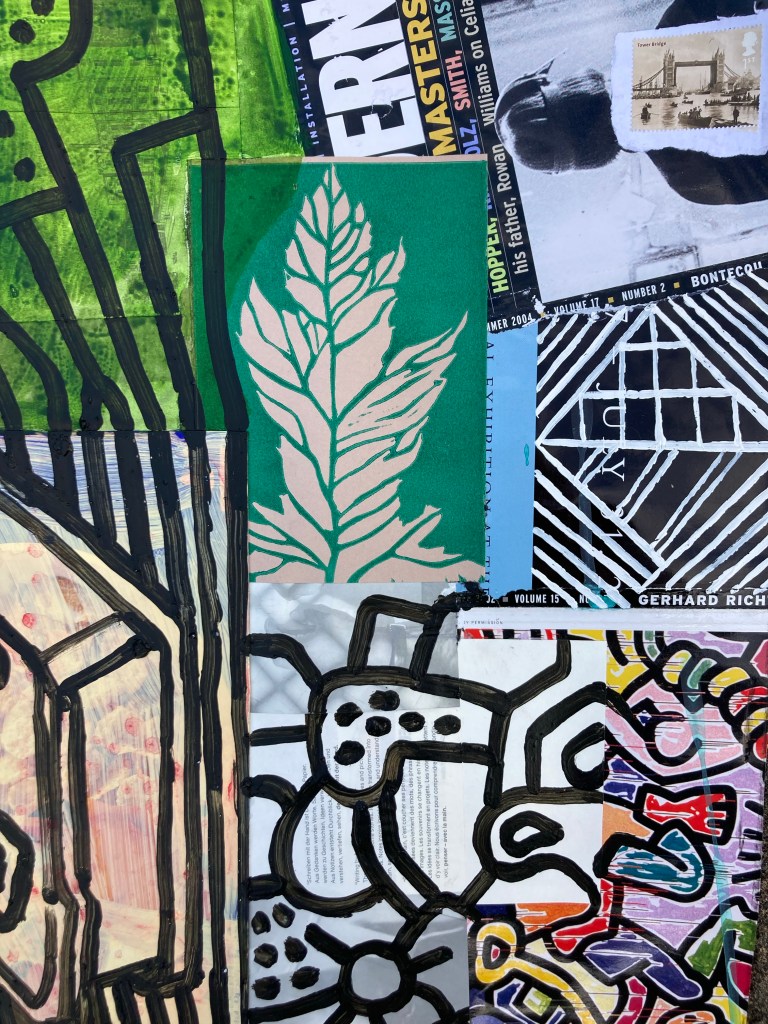 Acrylic paint on collaged paper patchwork with art magazines 48cm x 48cm