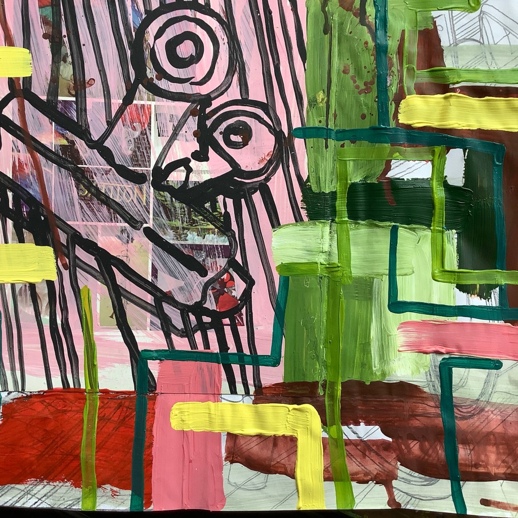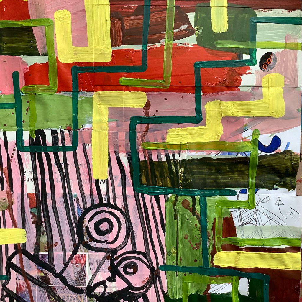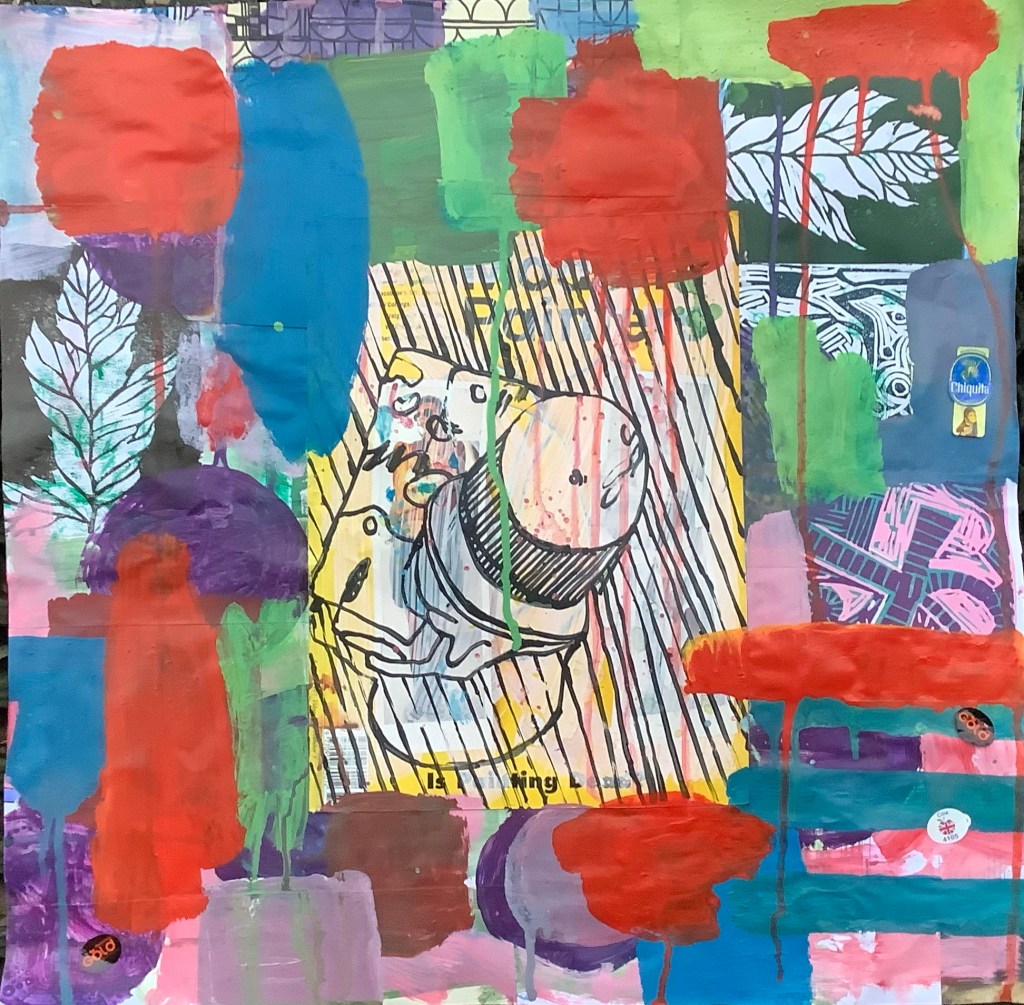 Acrylic paint on collaged paper patchwork with prints and old drawings 48cm x 48cm