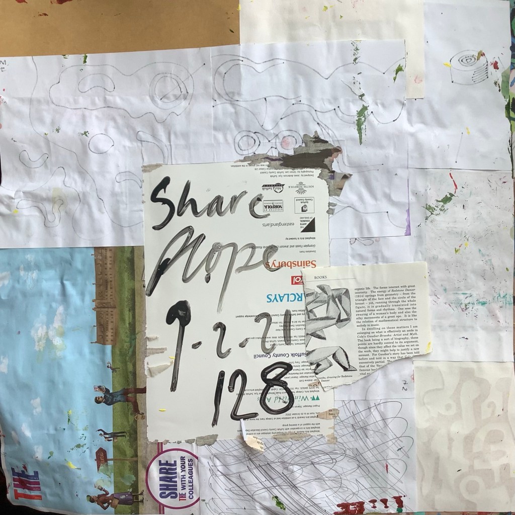 Acrylic paint on collaged paper patchwork with old drawings and prints. 48cm x 48cm