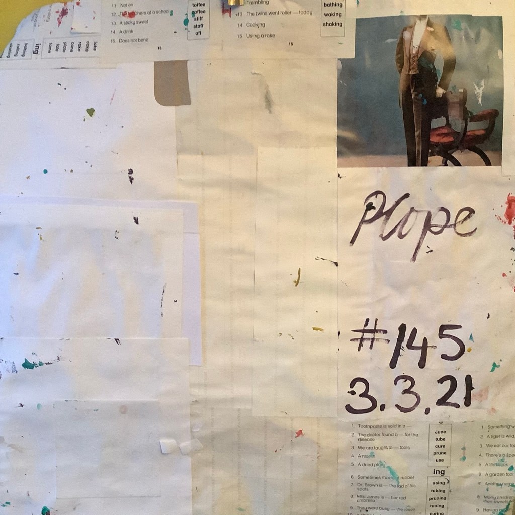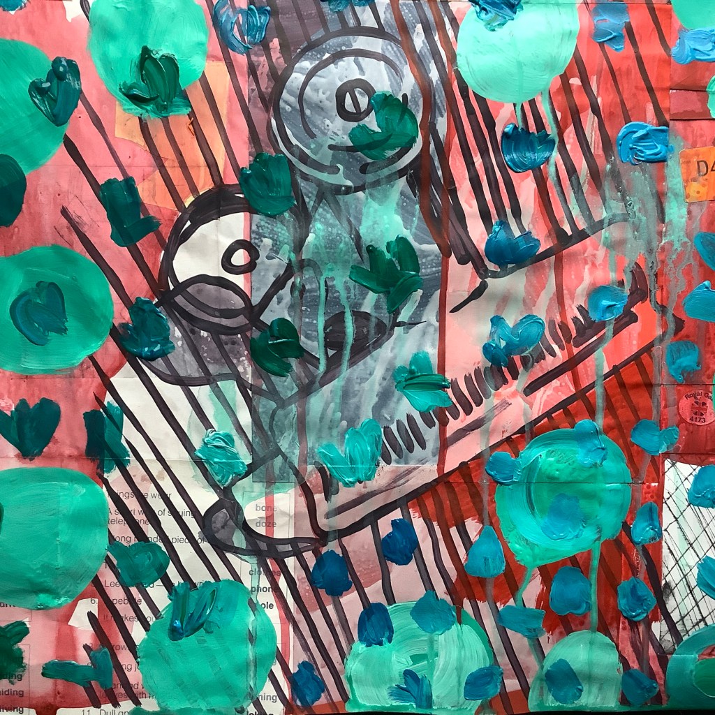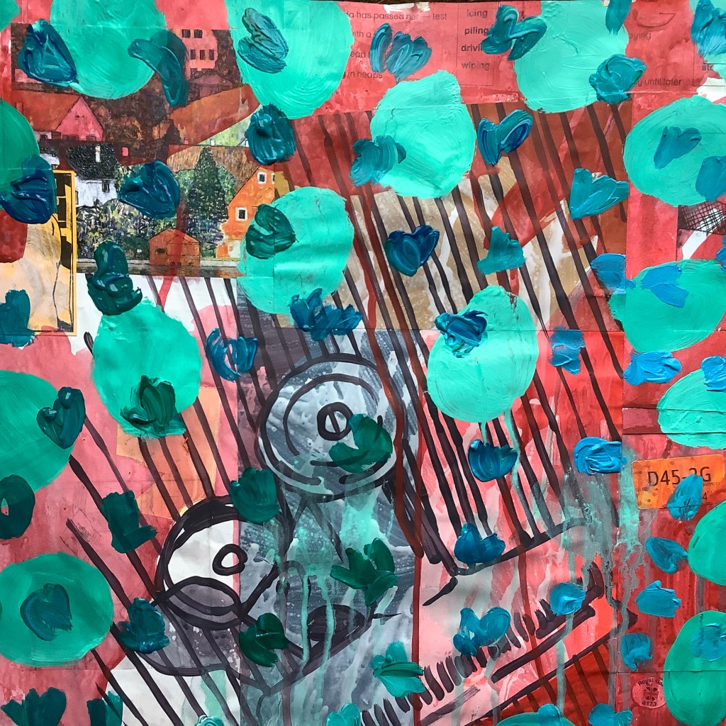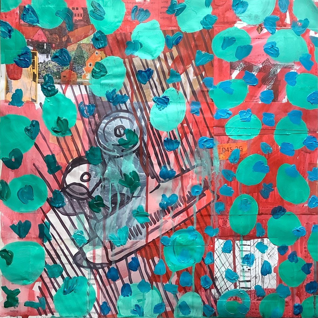 Acrylic paint on collaged paper patchwork with old art magazines 48cm x 48c